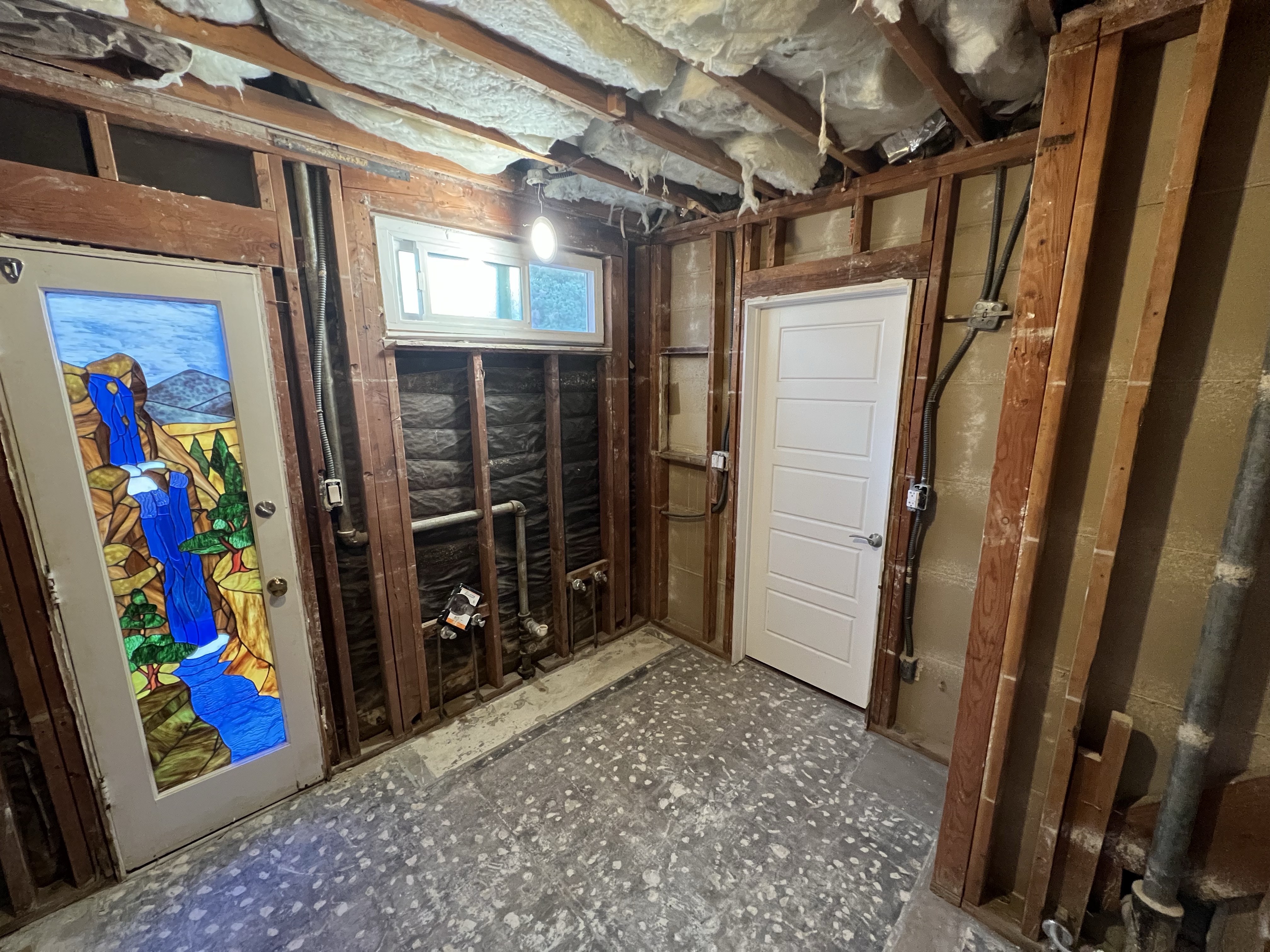 The best picture I could find for now of the stained glass door – also, an accurate picture of our house most of the time… under construction!