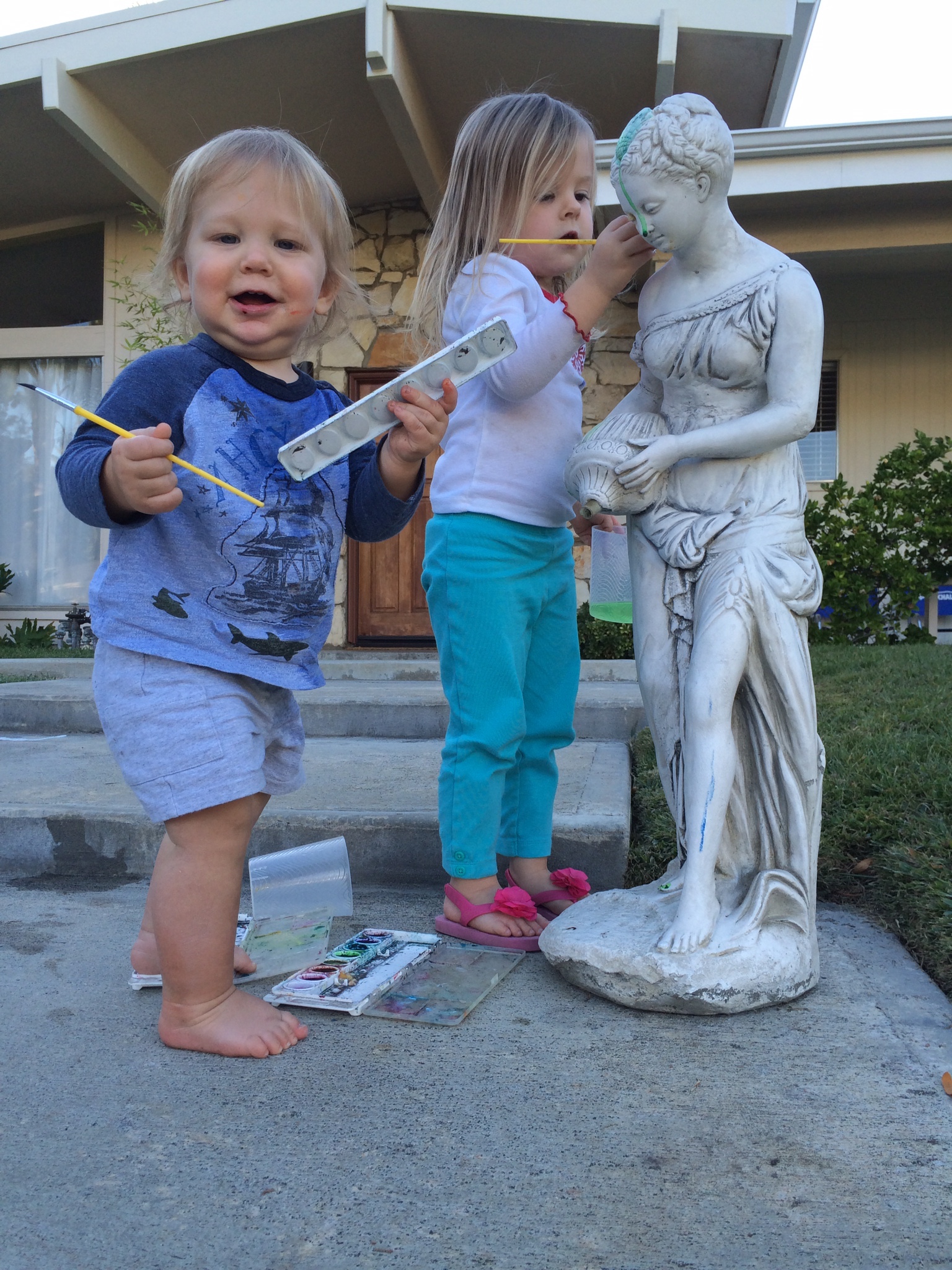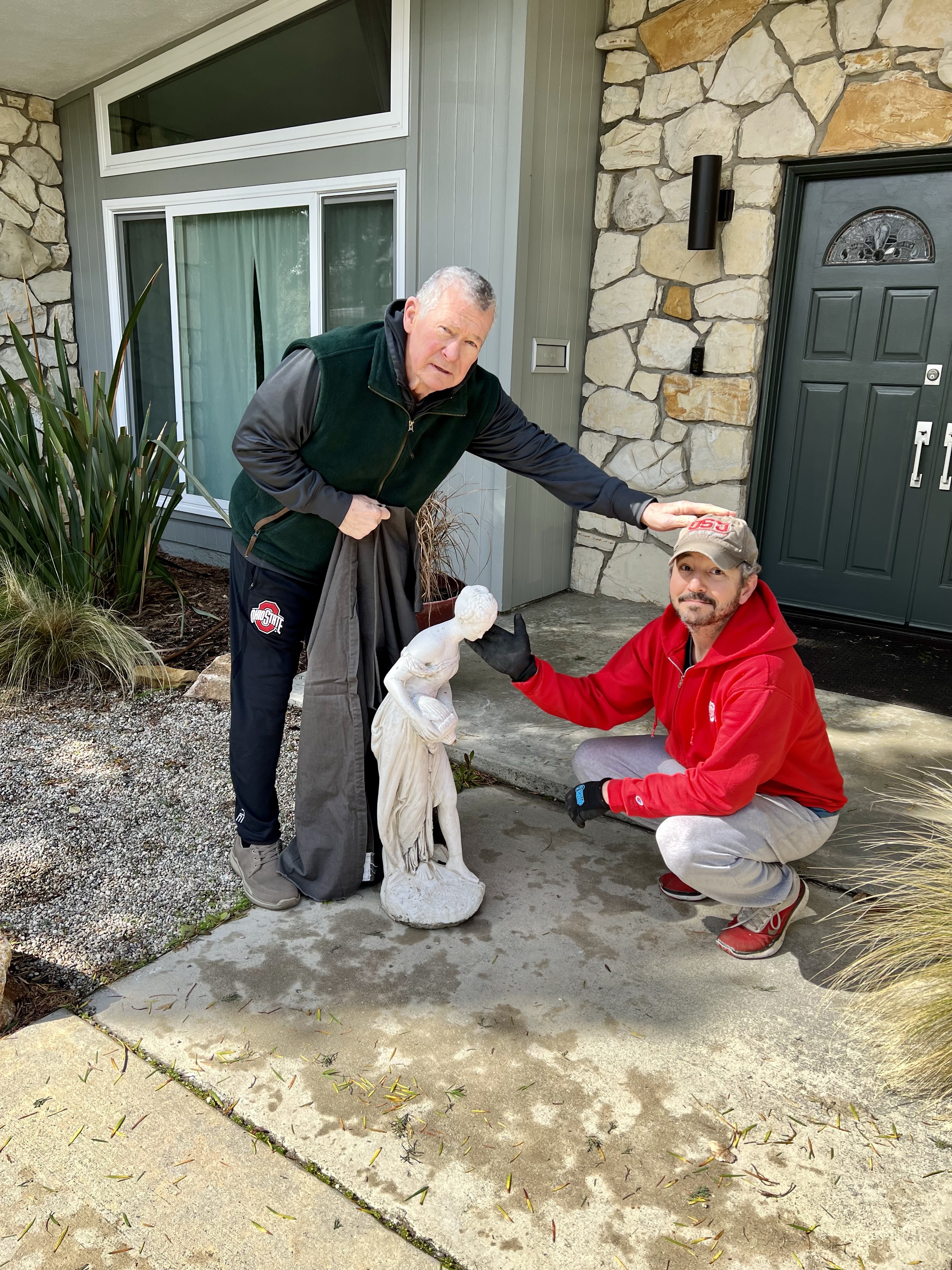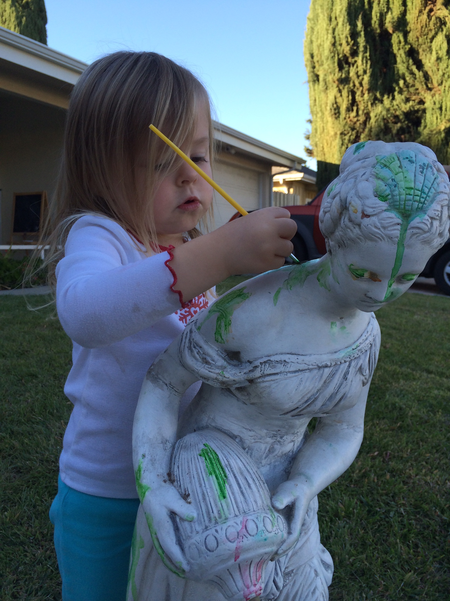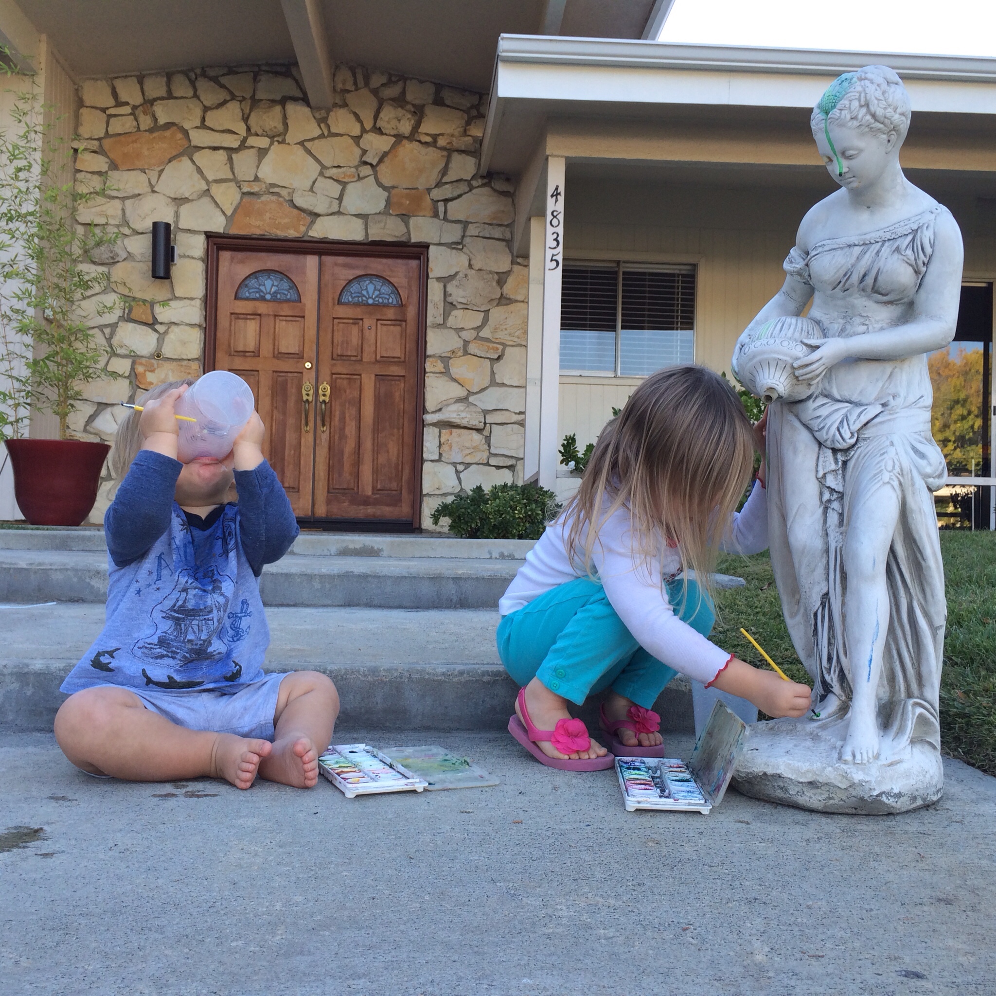 The second was a lady sculpture that was mounted above a fountain on what used to be our front lanai. (When we bought it, our house was original-1960s-everything, & it was grooooooovy, baby.) When we renovated the front porch, the lady moved all over the yard for the next 10 years. The kids painted her. She was a little witch for Halloween. Birds perched on her as the sage I planted grew up around her.
