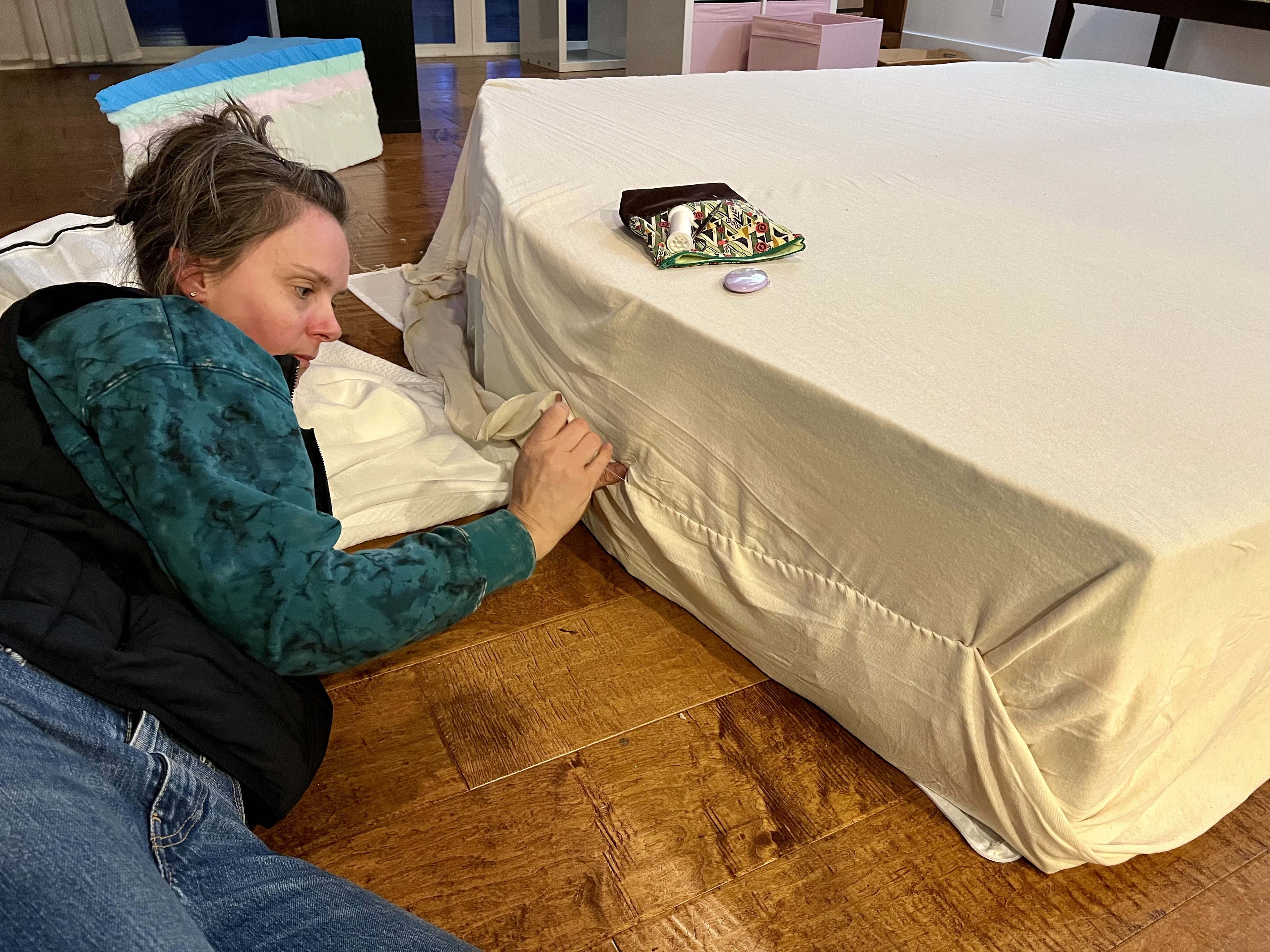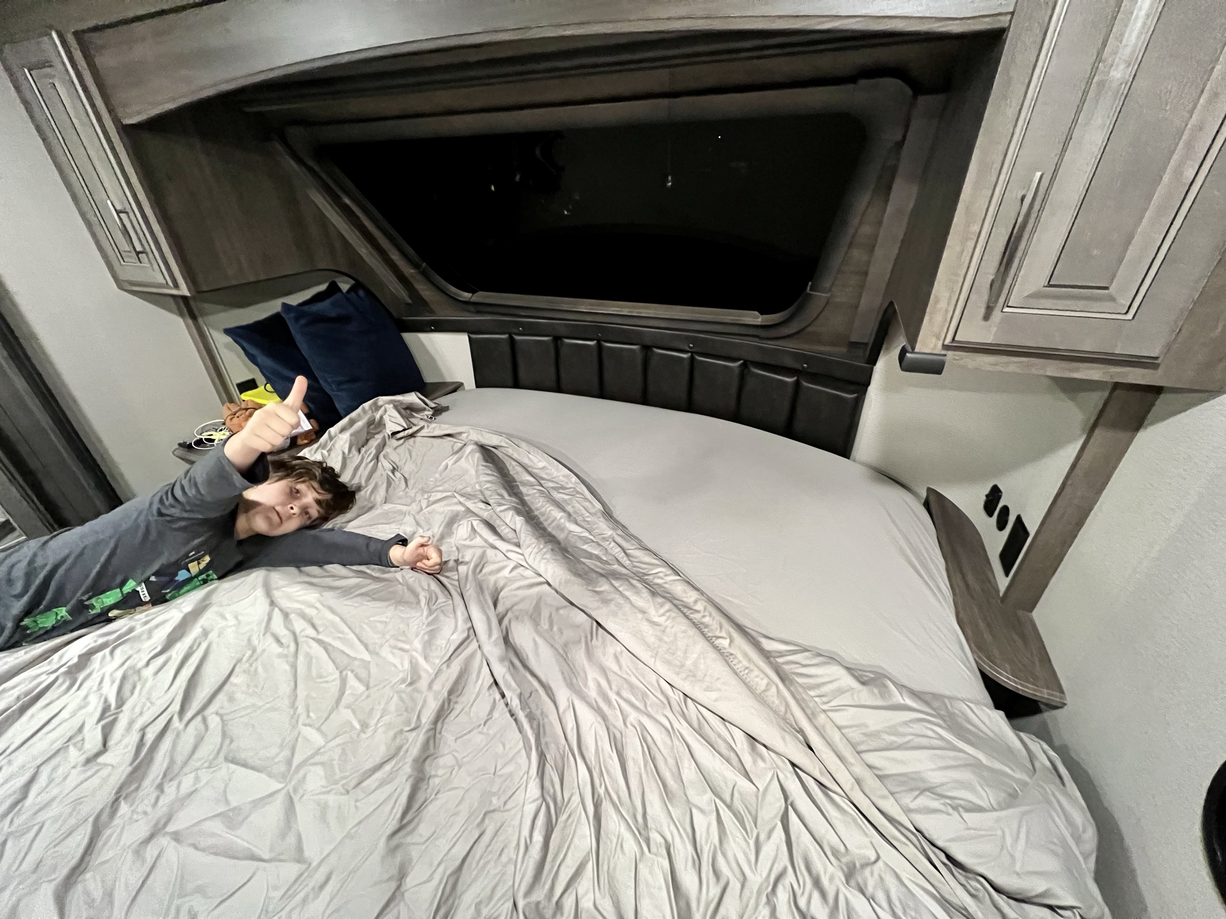 The night we were supposed to leave (March 1), our mattress still hadn’t arrived. Fun note about RV mattresses – they are weird shapes, sizes, and they are UNCOMFORTABLE. The mattress for our bedroom is technically a California King, but due to the shape of the front of the 5th wheel, the top of the mattress has to be cut as a non-symmetrical half moon. Once the mattress arrived – all 120 lbs of it – TJ & I set to chopping it up with our bread knife. I stitched the cover back up, & then we moved it out to the 5th wheel. I wish we’d had someone record this – it ended up being a modern Laurel & Hardy sketch, involving Chase crawling on his hands & knees, the kitchen table being removed, & TJ trying to “fold” a 14” Cal-king foam mattress in half. But we did it!