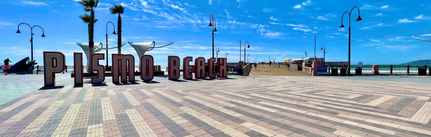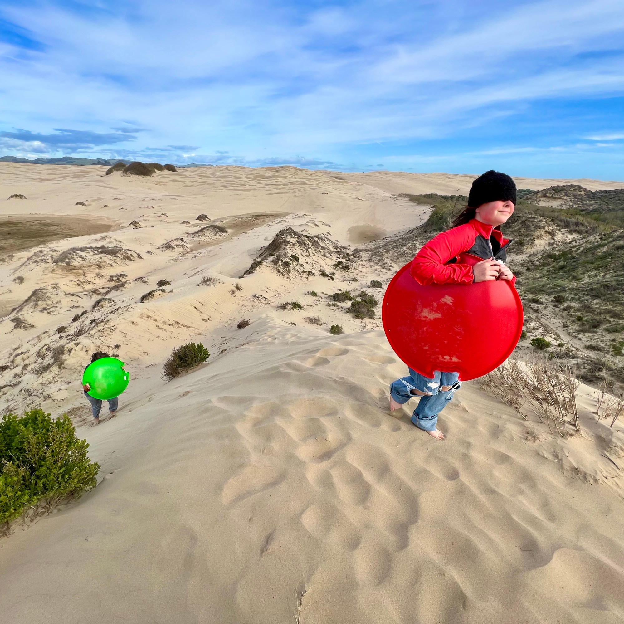 Our next day trip was Pismo Beach, 20 minutes south of our campsite at Morro Bay, for sand dune sledding. I’d researched how to get to the good sledding areas. Most online suggestions mentioned parking outside an RV park there, walking through it, and, ba-dam, there are the sand dunes. I called the RV park ahead of time, but the receptionist said that the last rains had washed away their entrance to the dunes & left it muddy & impassable (weather, again).
