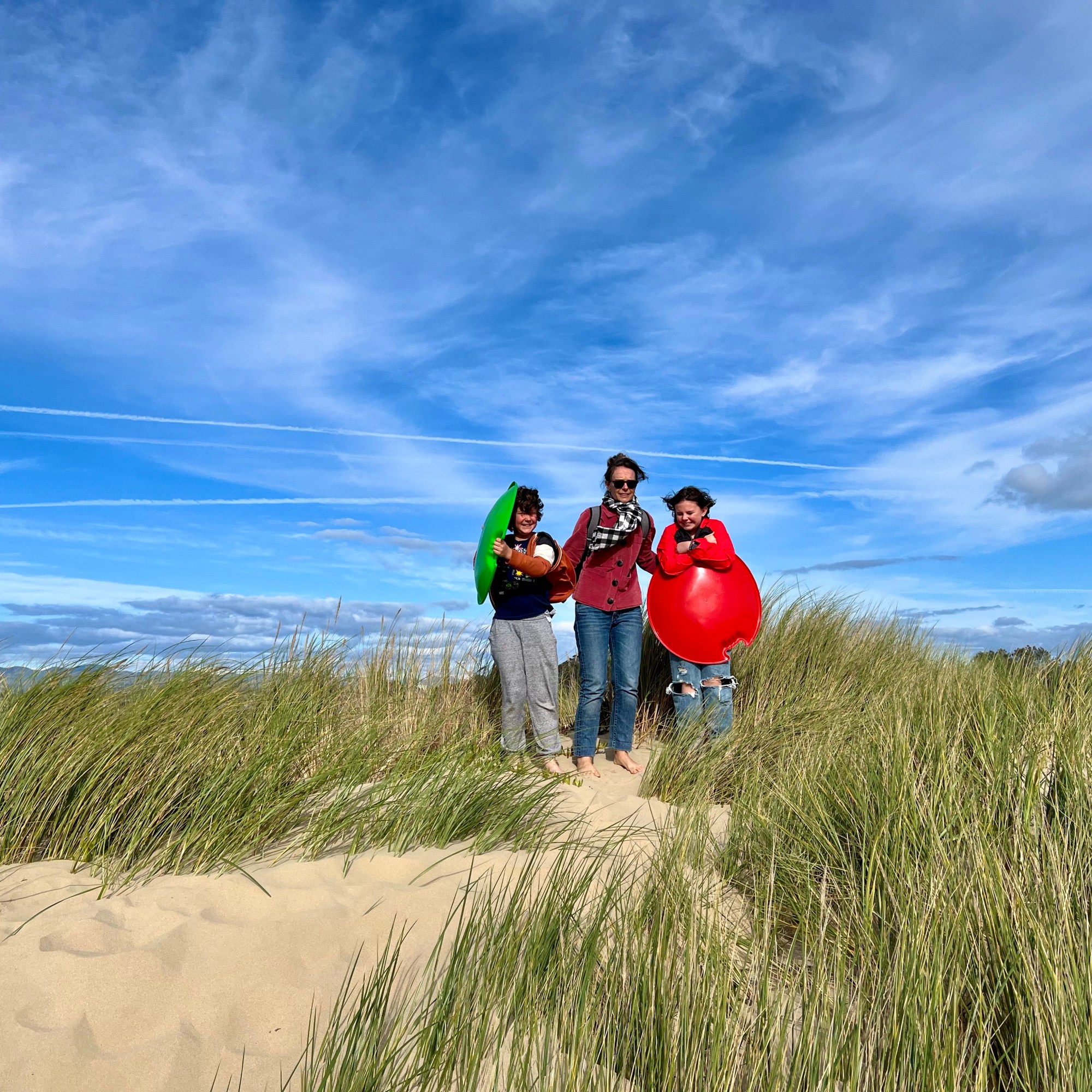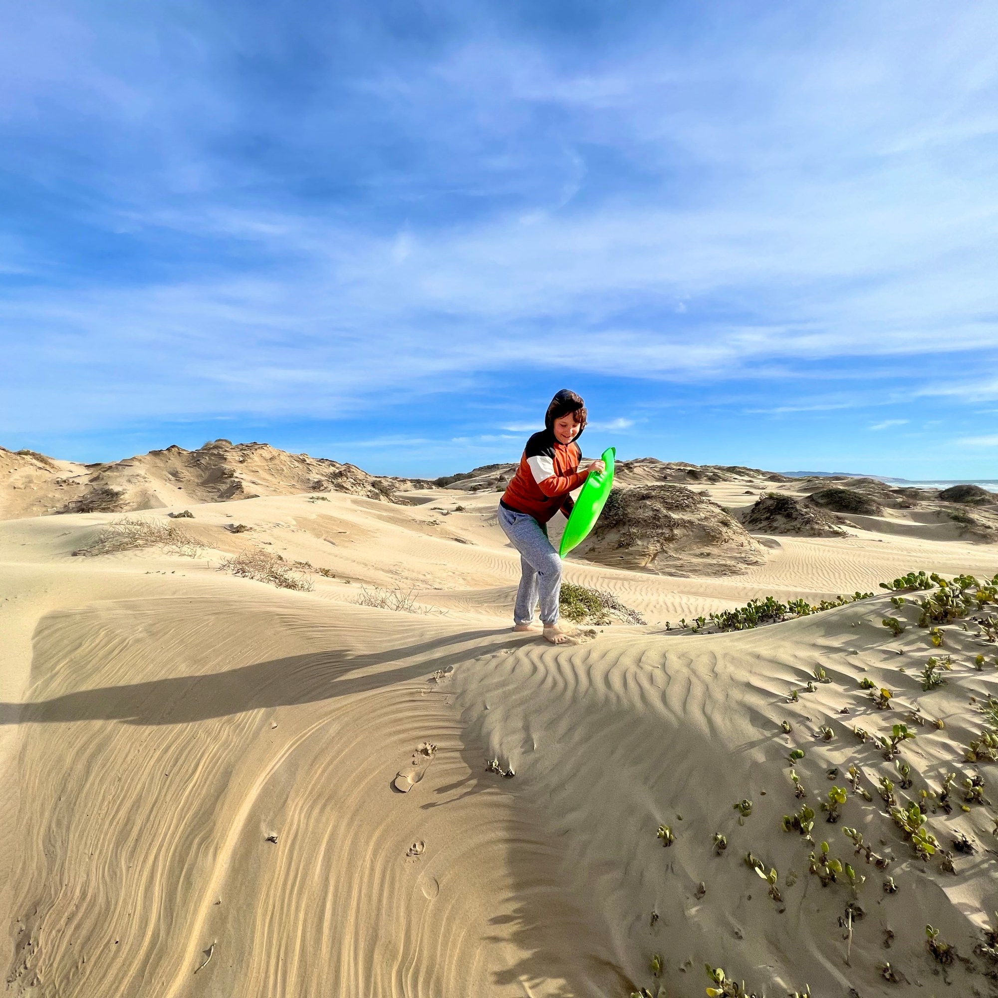 But we were here, & we’d bought the disc sleds earlier that morning, & we weren’t going to let the ocean force us to waste $30 worth of plastic. We paid the entrance fee, & we were free to drive on THE BEACH?. I’m still confused that this is even allowed. Driving literally ON the beach. IN the sand. My confusion was rivaled only by my fear. I’d scrolled through Instagram pics that morning, trying to familiarize myself with the area, & I’d seen a few pics of vehicles buried in sand dunes. Theoretically, our giant 4WD truck should be fine on the sand. But. But! When you rely on that truck to get your new house from place to place, the stakes are higher. And, also, we’re still figuring out how to use the truck. Everything is new, remember?