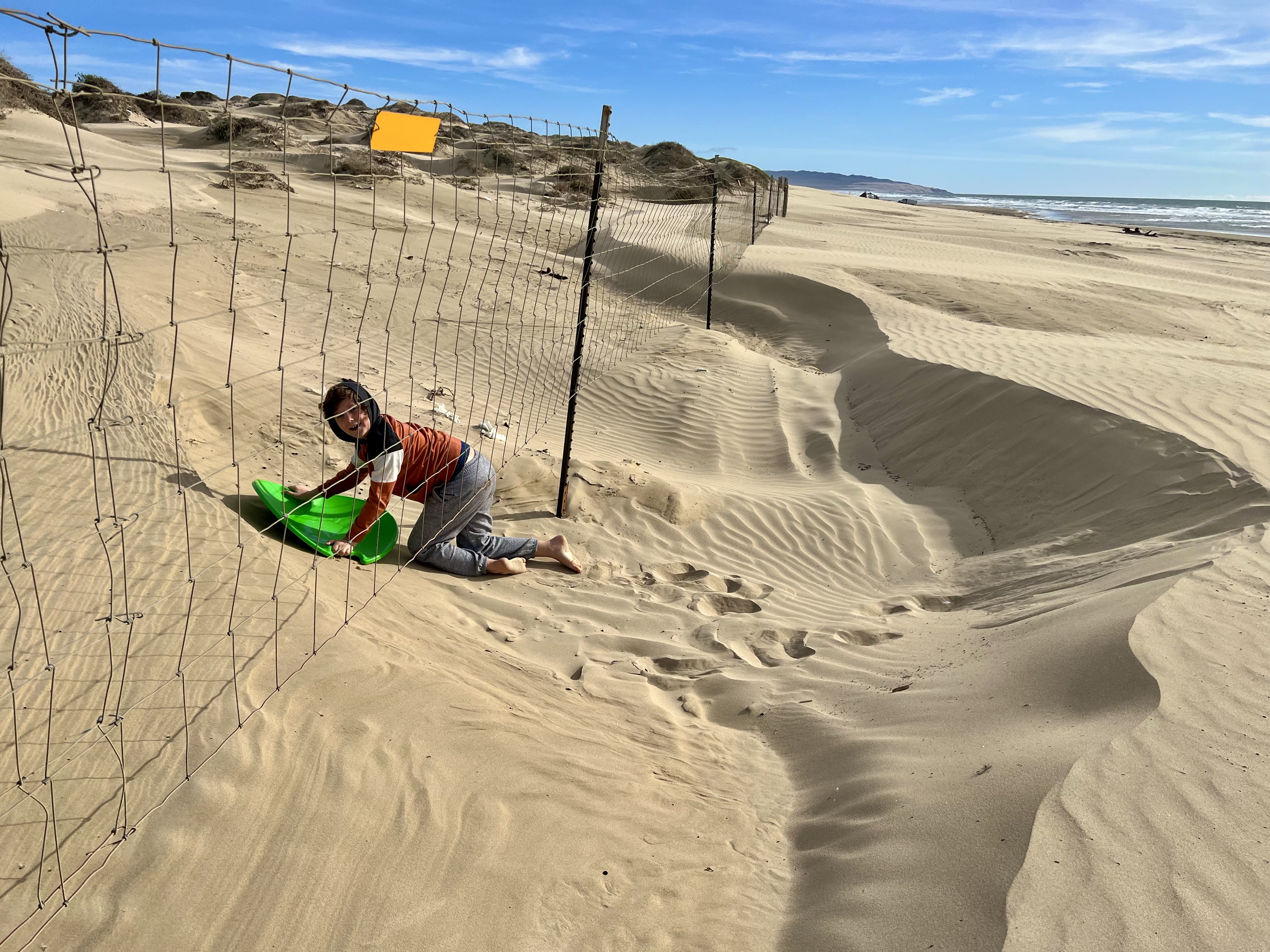 Praise Jesus! We made it across alive. We continued heading south on the beach, assuming that we would eventually come to a clear SAND DUNE SLEDDING spot. So far, most of the dune areas were fenced-off from the beach, closed.