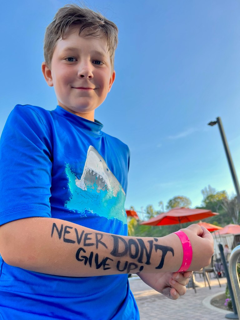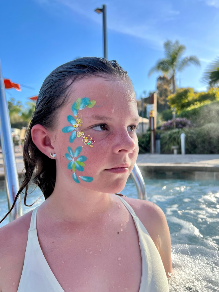 The rest of the day was filled with a family kickball game (the kids let TJ & me play!), a picnic watching a concert in the grass, face-painting (Chase chose a joke from one of his favorite comedians, Kevin James), and a nap in the sun (my hat did a great job blocking-out the sun… except for the hole in the back where you adjust it – I got a cute little rectangular burn on my forehead). We ended the day with a dip in the hot tub.