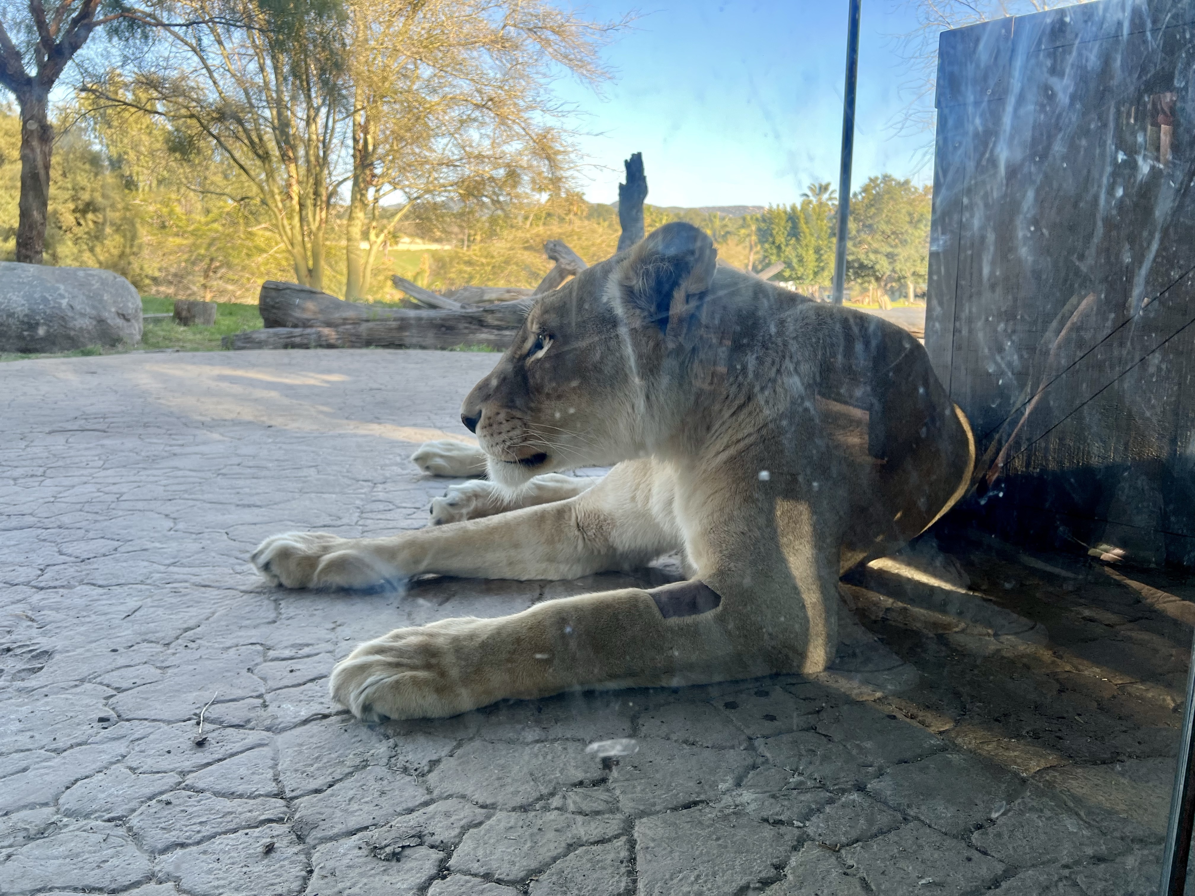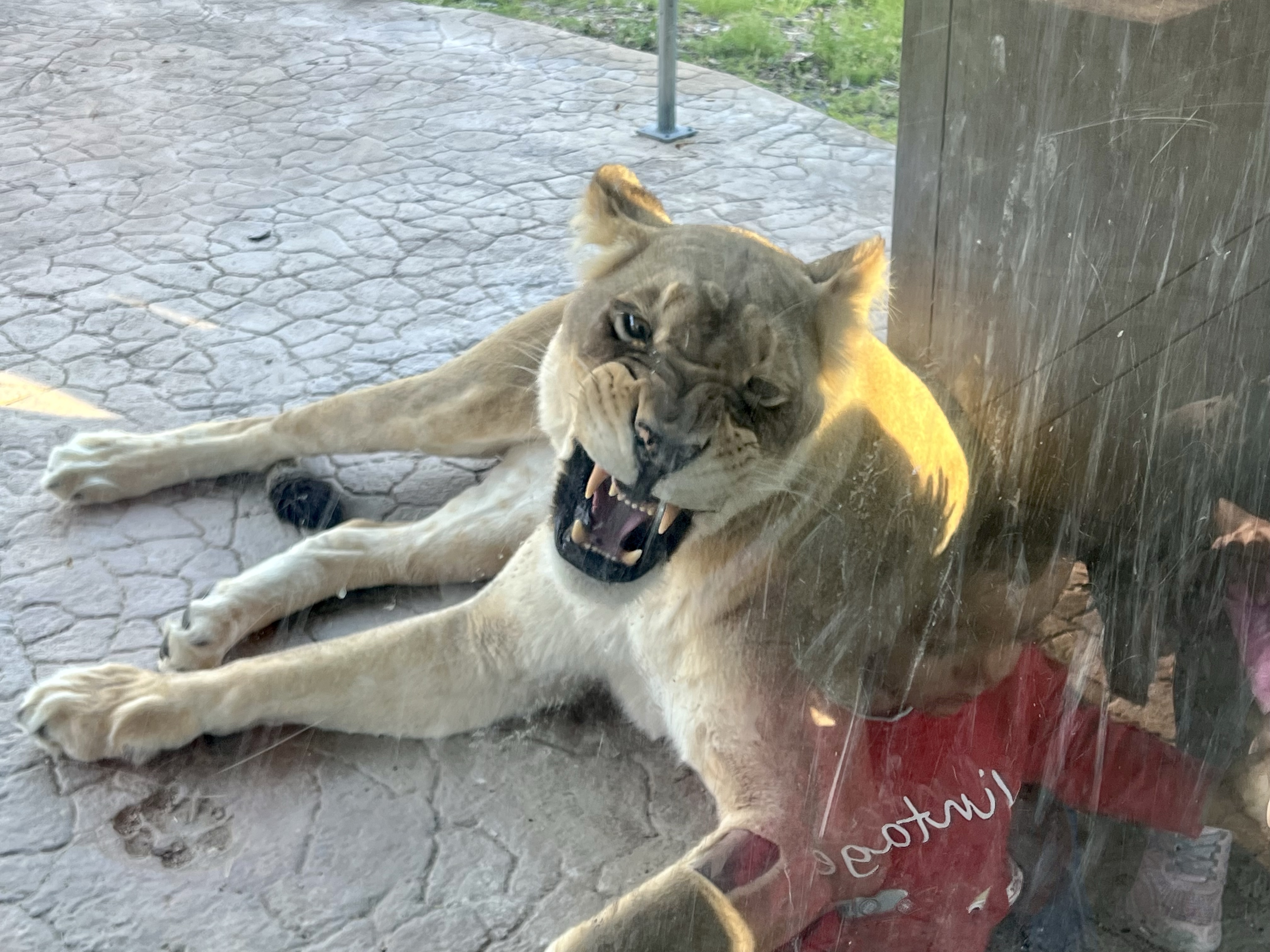 After the tram ride, we walked over to the lions. What a treat to see one so close! (The lion isn’t growling in the pics – it was yawning, like the cat it is.)