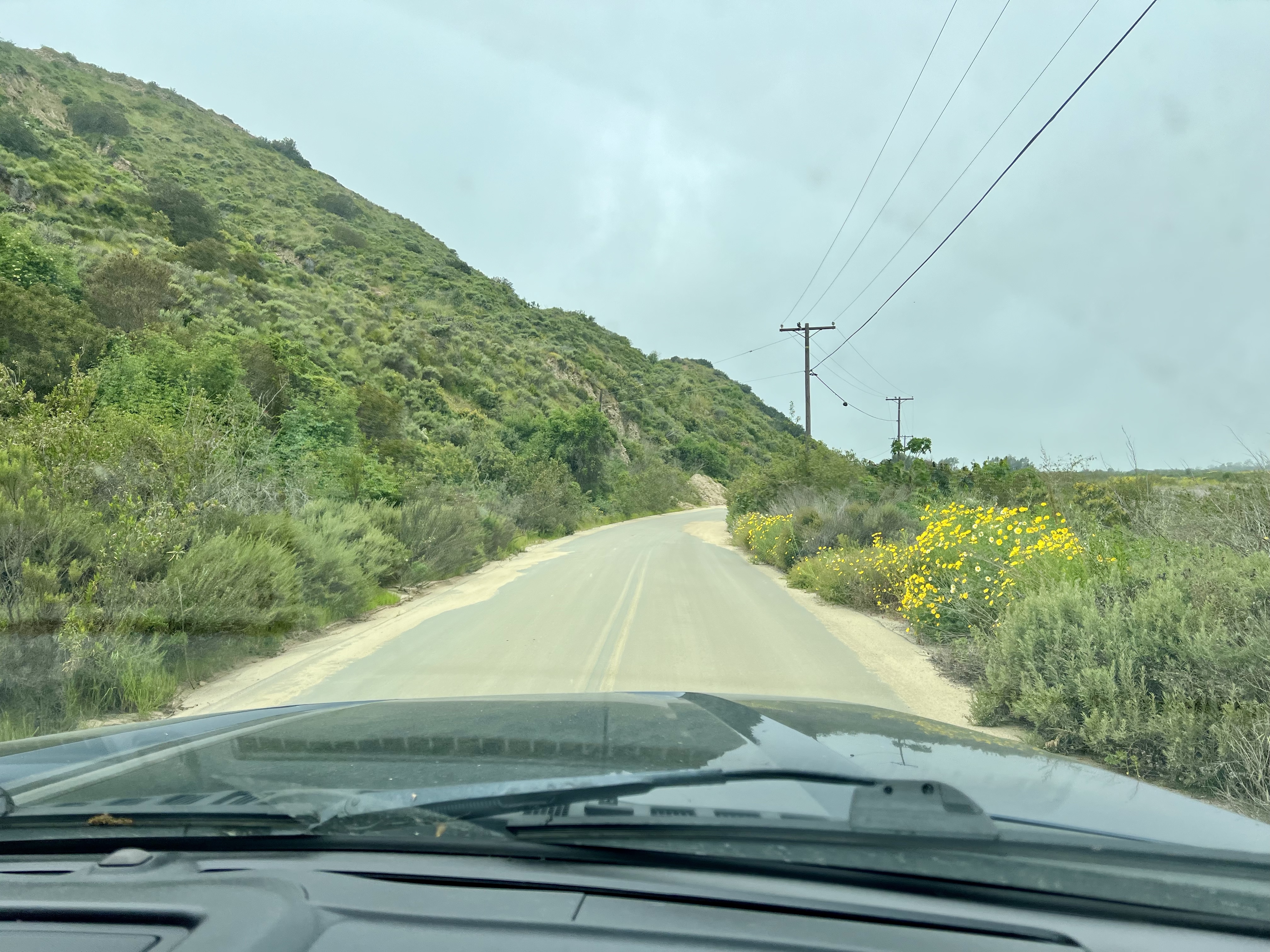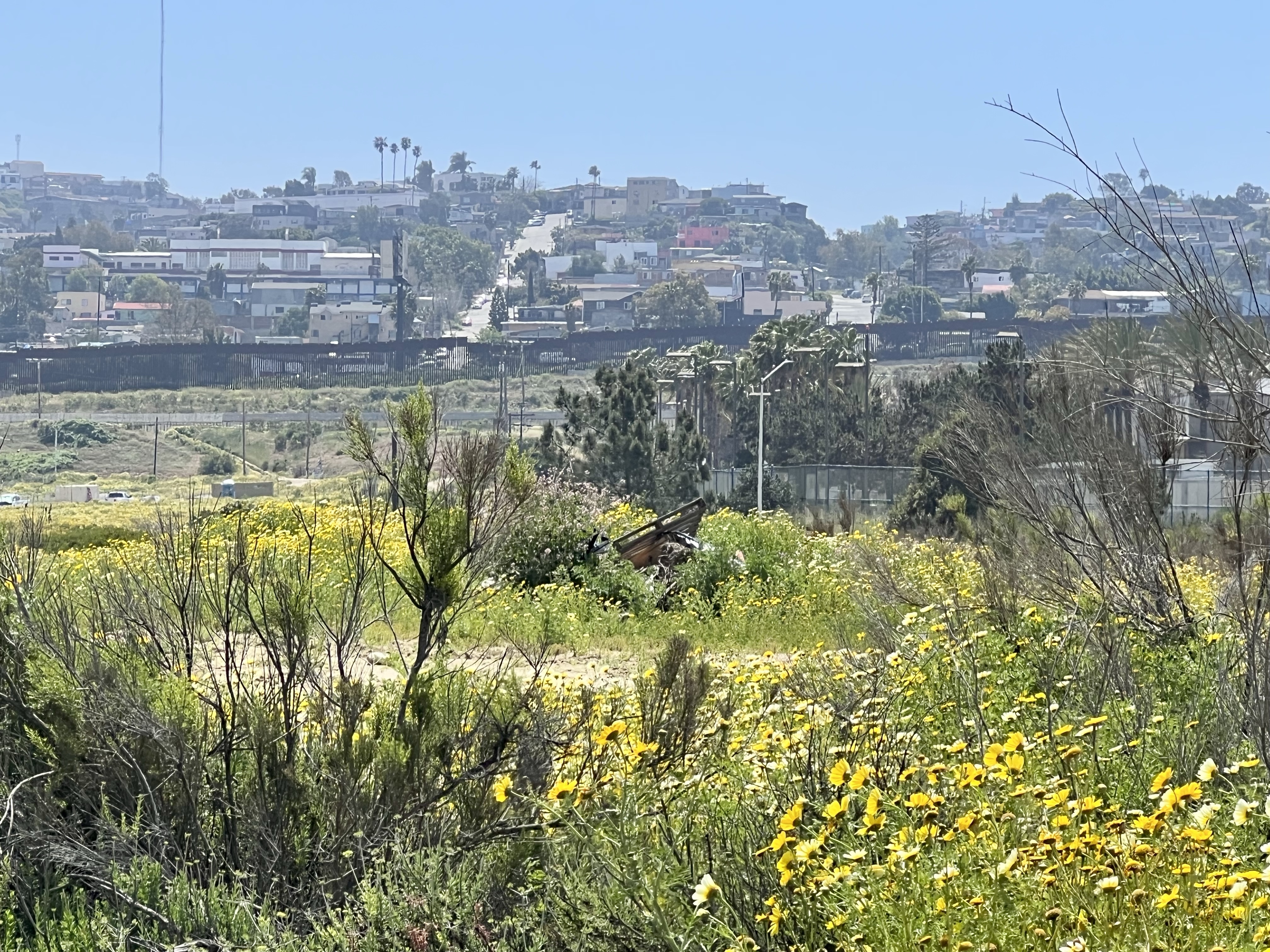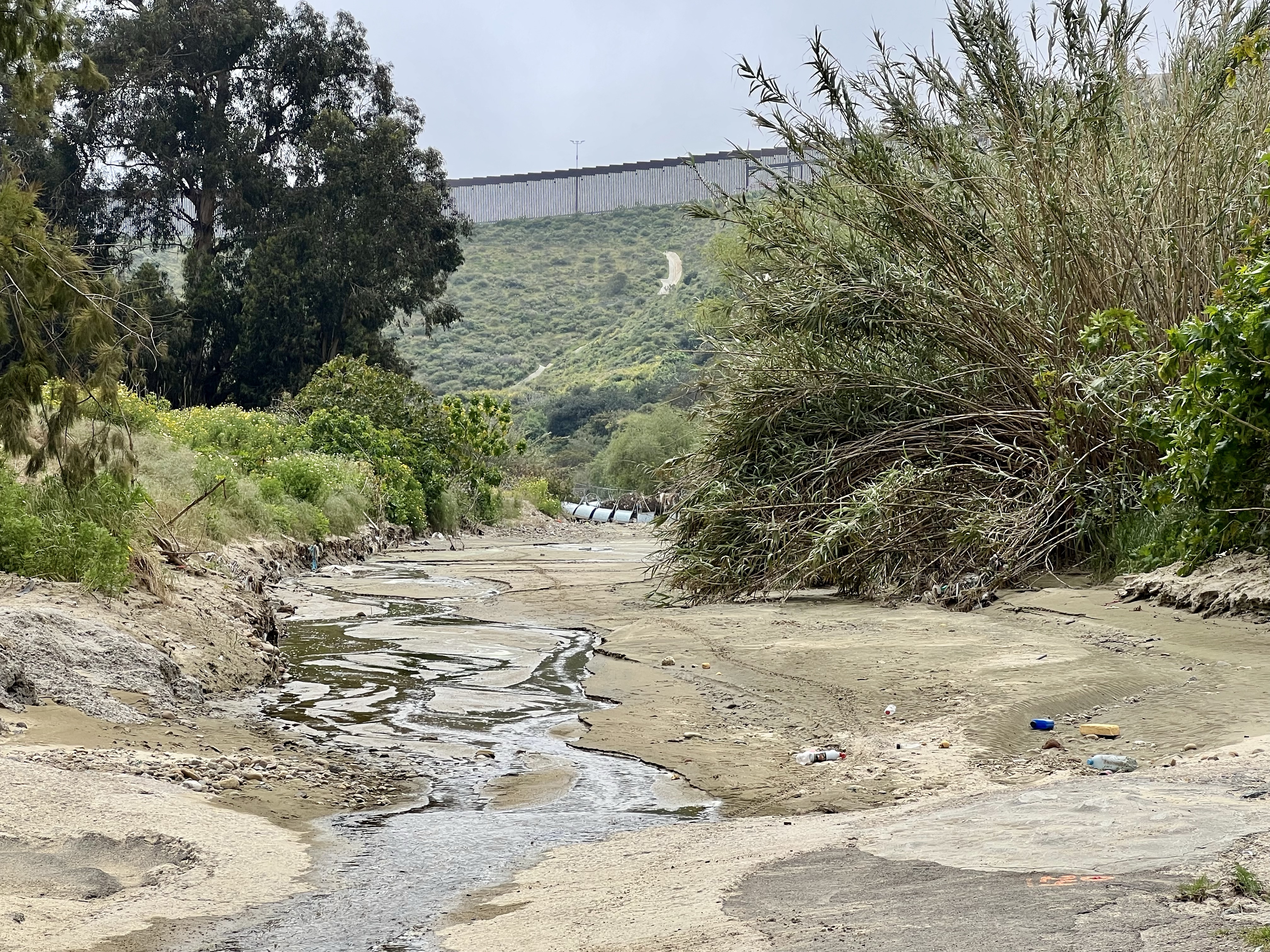 The roads leading to the campground were so narrow, & some were still covered in water or sand from the previous rains. But it was so beautiful & peaceful! The road eventually dead-ended at the Border Field State Park – which was closed. Along the way, we caught glimpses of the wall cutting through green meadows. I wish we’d snagged at least one pic, other than the trash that collected in the creek after the rain…