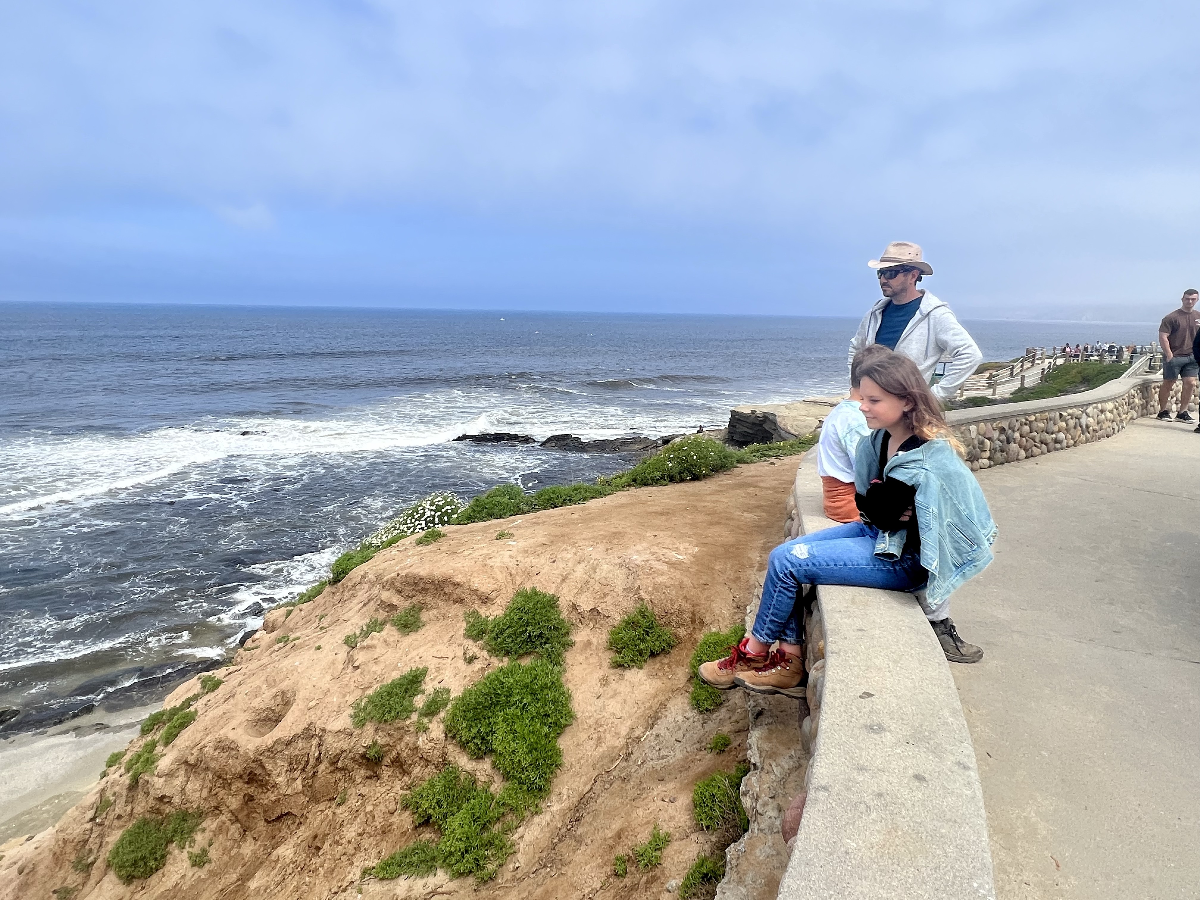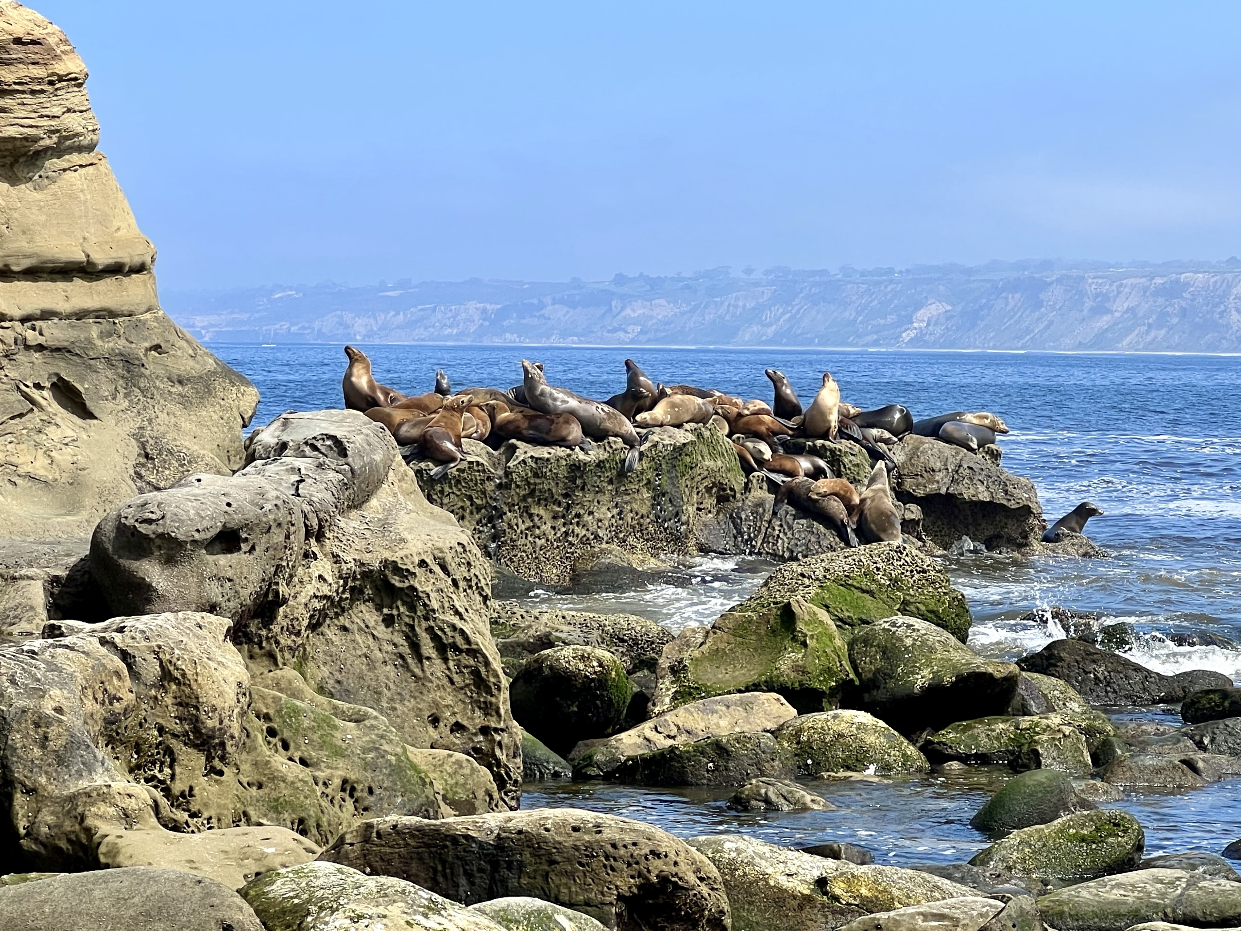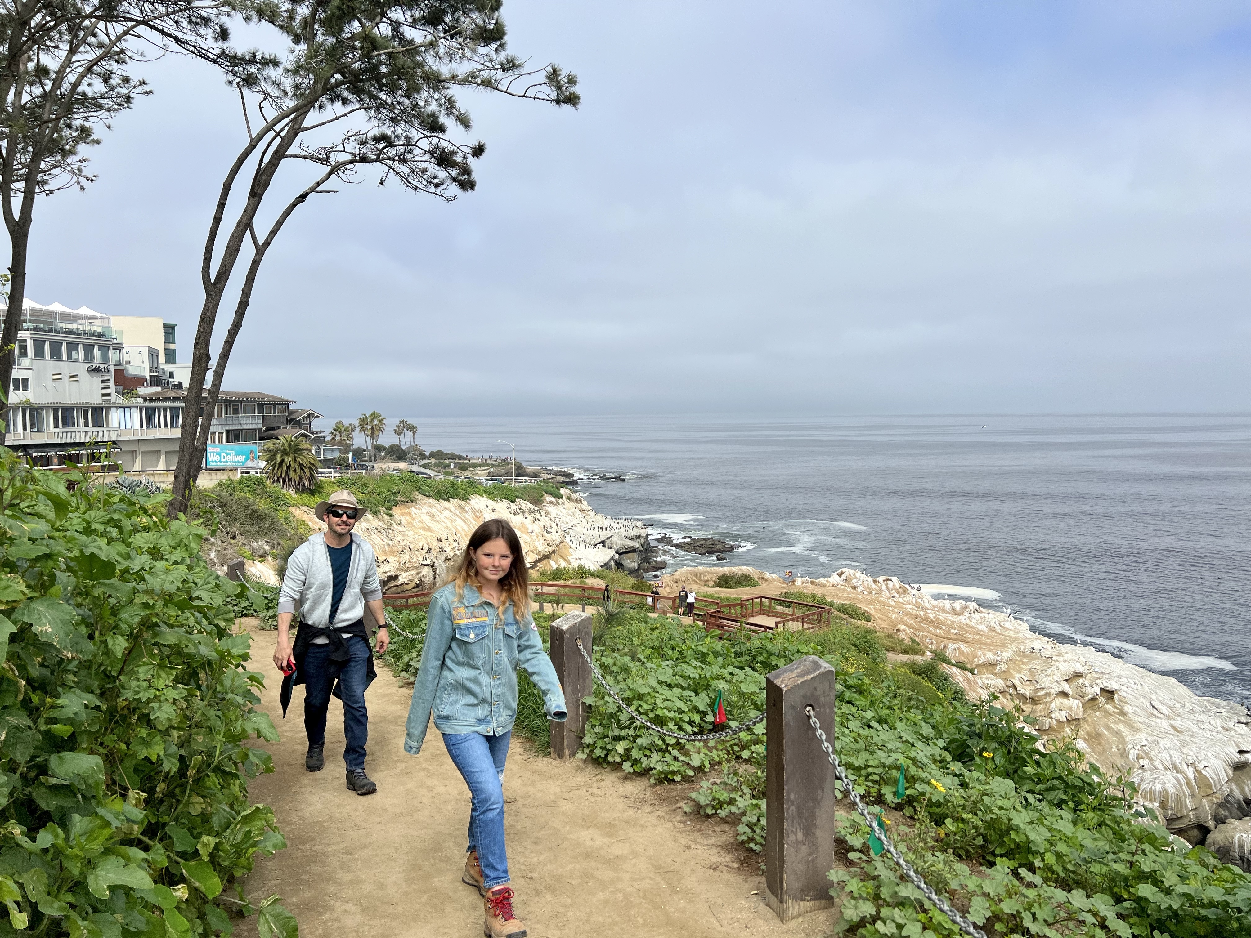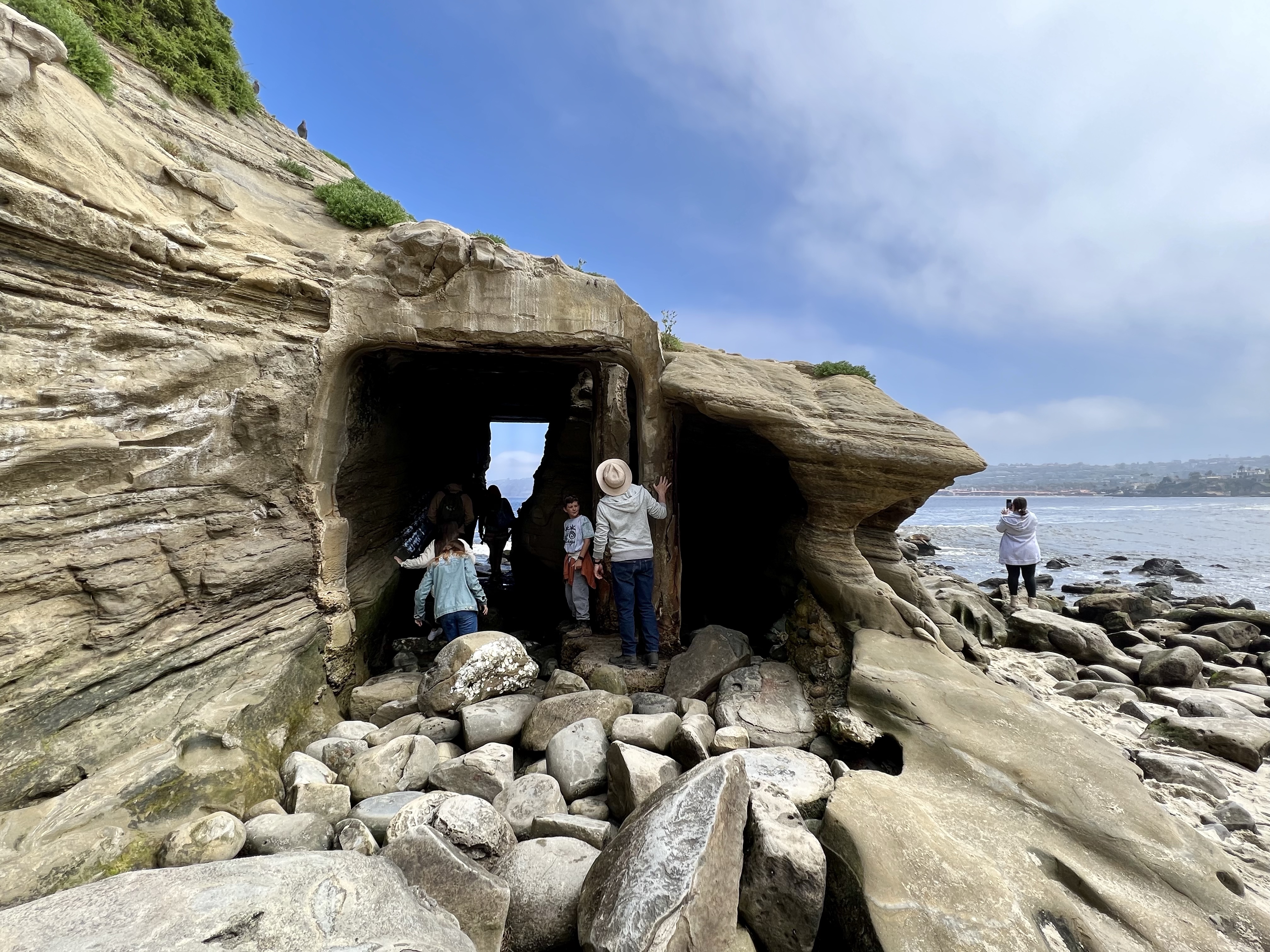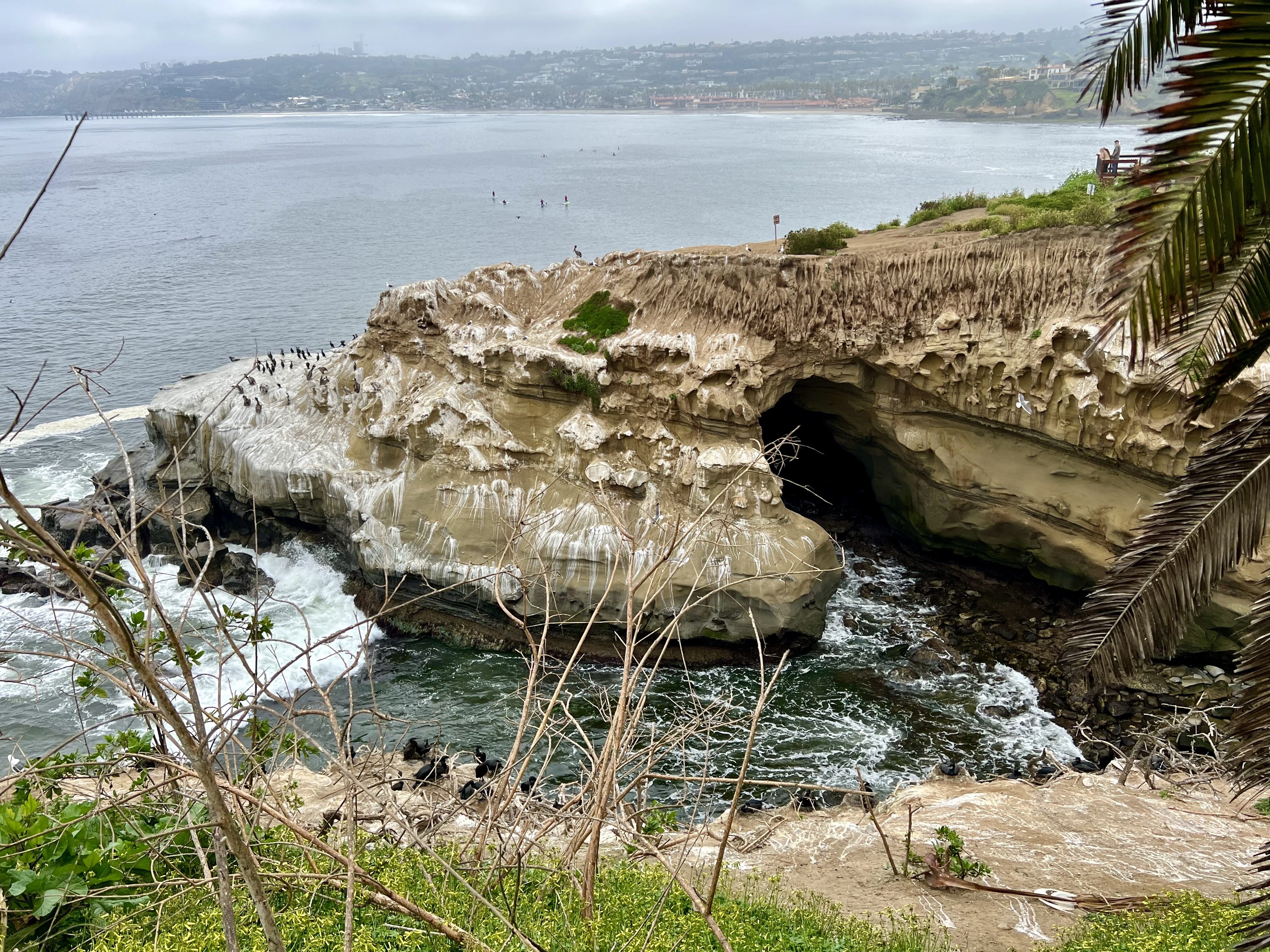 We spent our last day in San Diego doing as much sightseeing as possible. First, we headed to La Jolla for the beautiful beaches, sea caves, and seal and sea lion-viewing. We parked near The Cave Store & paid the entrance fee to take the tiny tunnel down to the sea cave. It was hard to believe that two men dug the entire tunnel by hand 1902! Water was trickling down the walls & along the sides of the uneven wooden stairs. My new claustrophobia issue popped up again…
