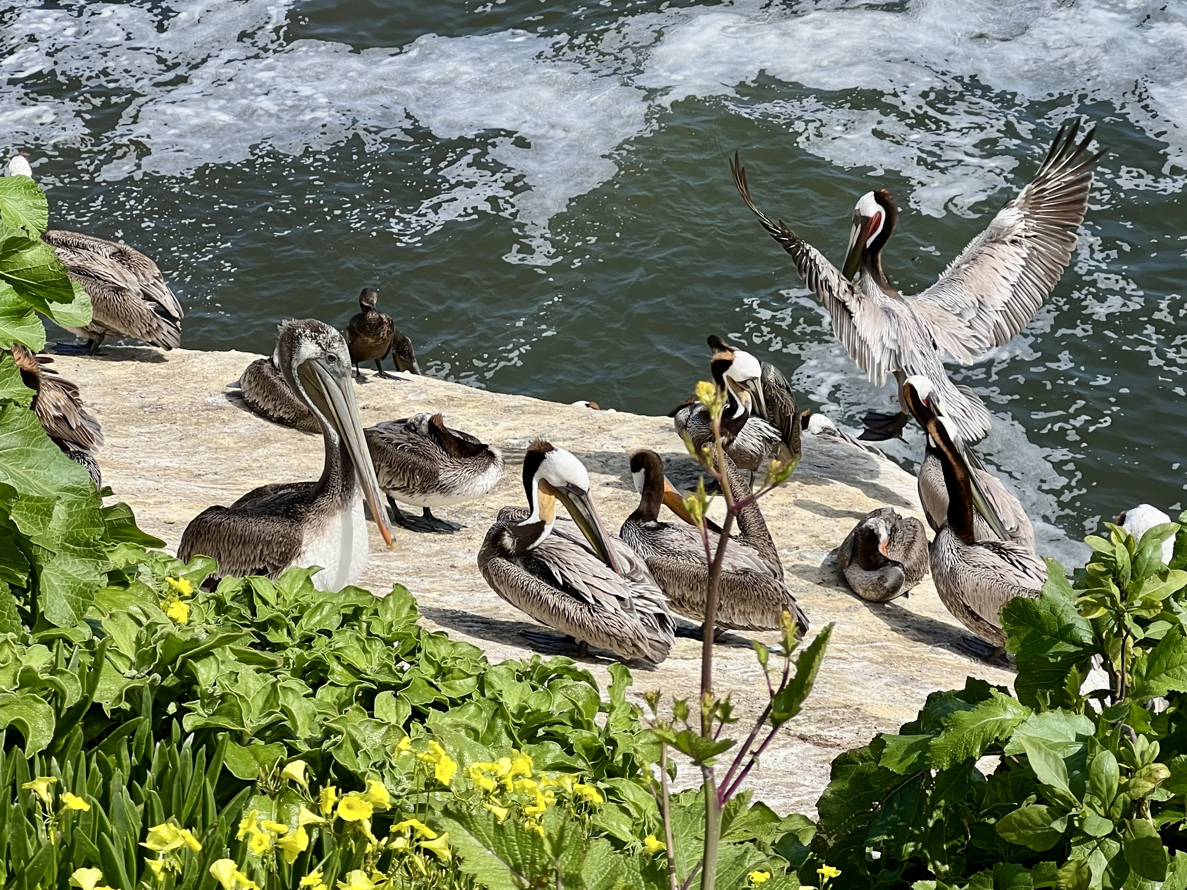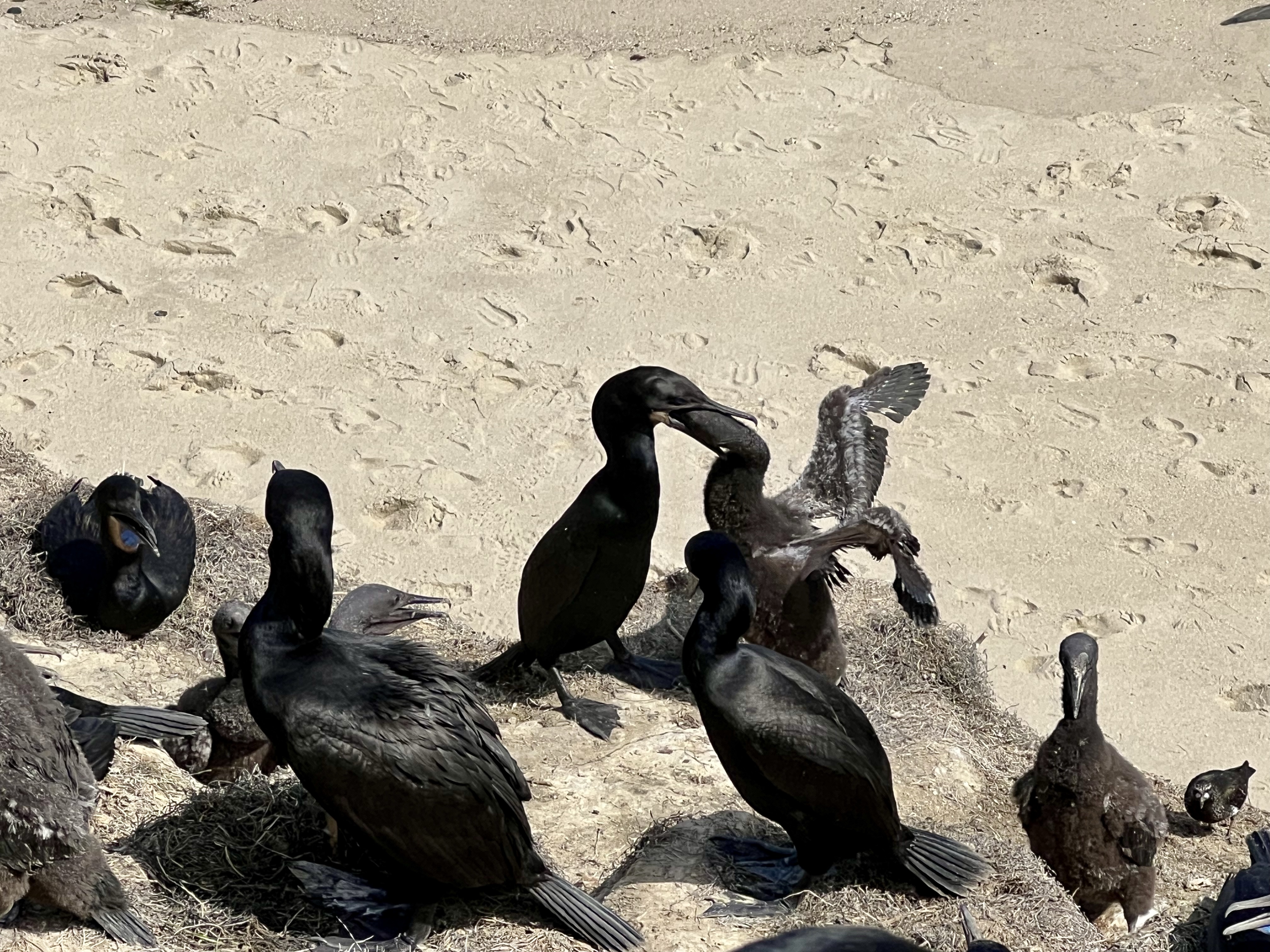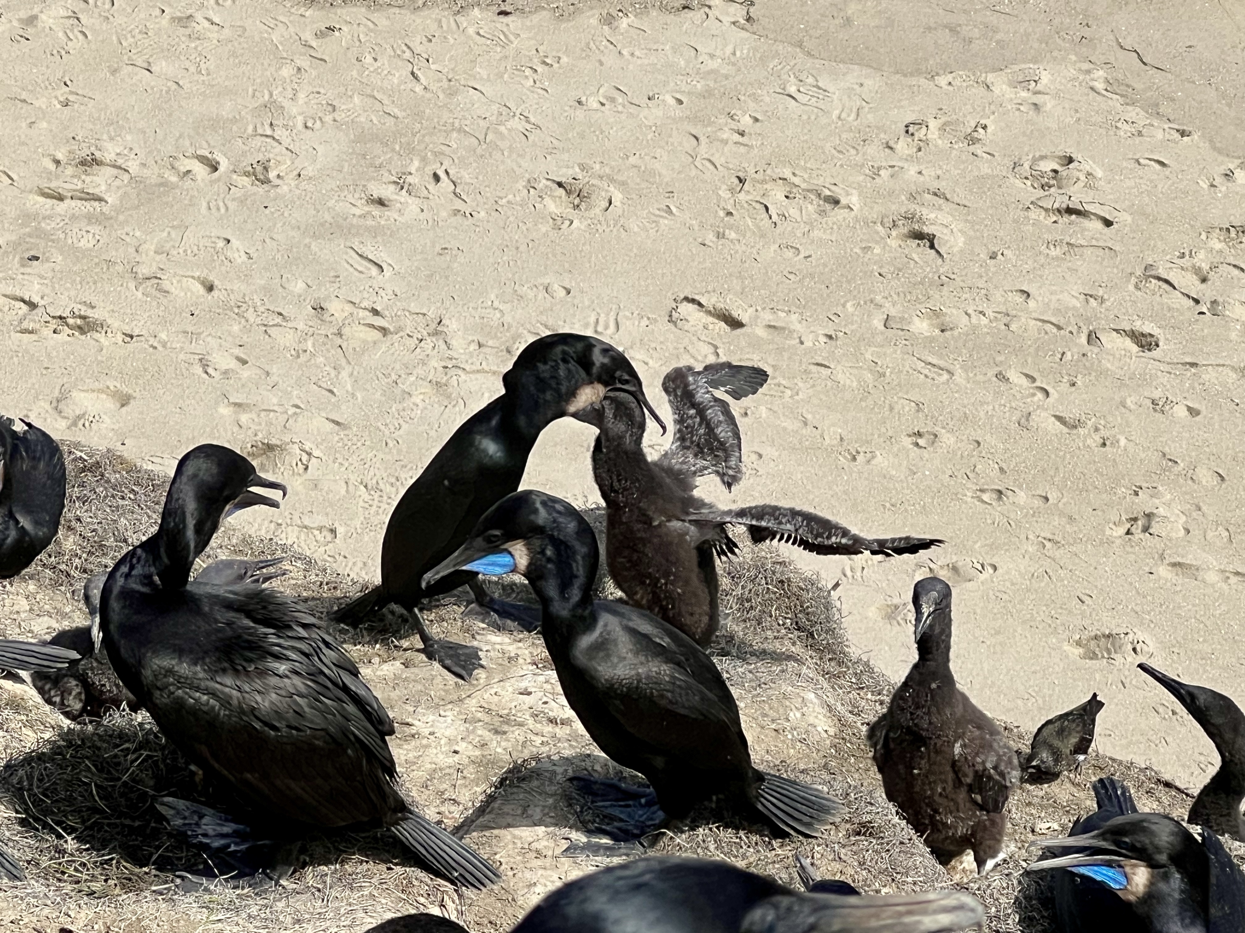 We were stopped short by all the birds on a cliff. We realized it was a group of adults & babies! The older babies were almost as large as the parents. We giggled at how the parents almost swallow the babies’ entire heads when they feed them! The adults sitting on nests would get up to stretch periodically, and we spotted eggs and tiny babies in all the nests! Sometimes another adult would arrive from the beach, bringing seaweed to the other adult on the nest, & it would slowly build-up the sides of the nest!