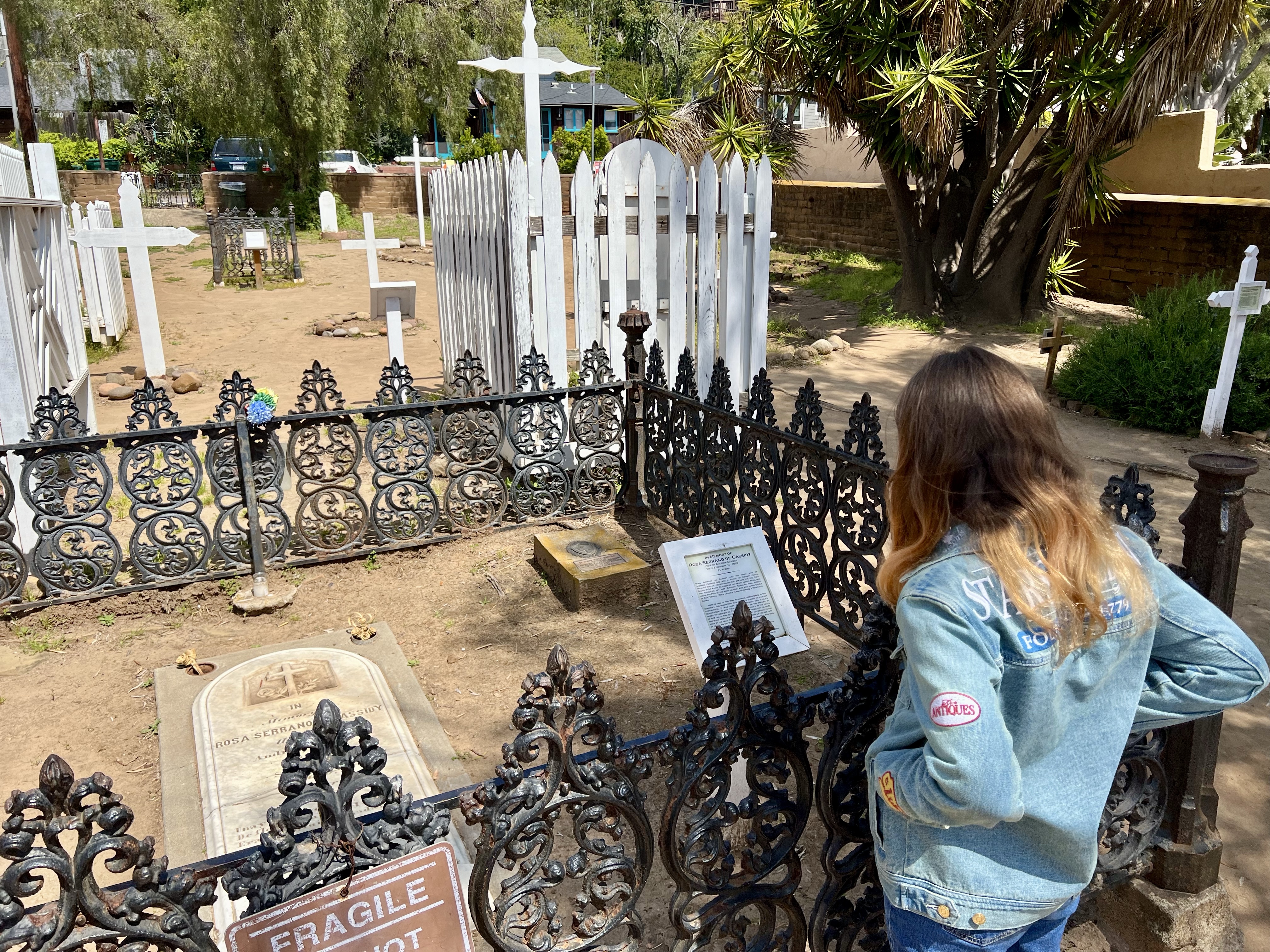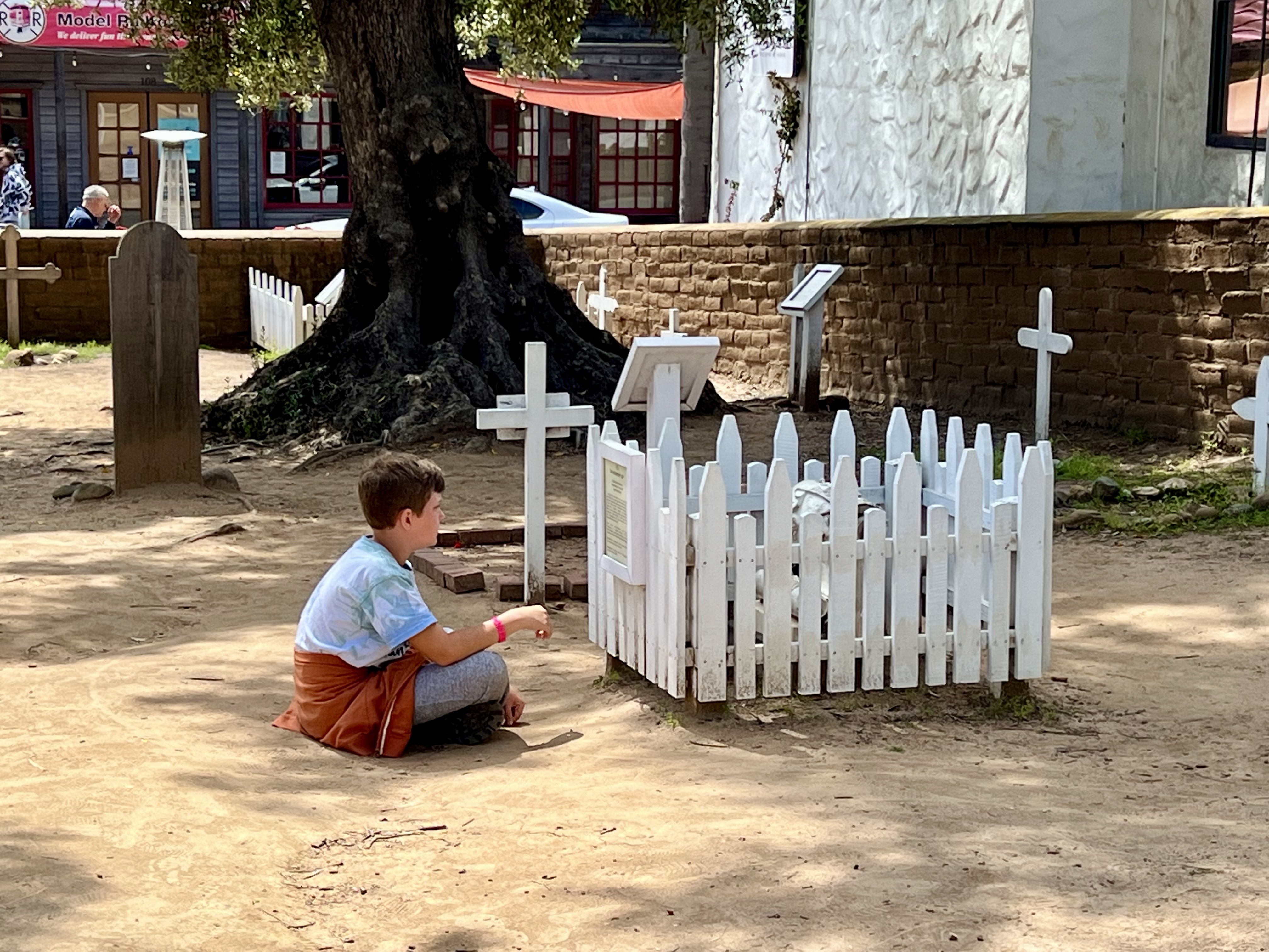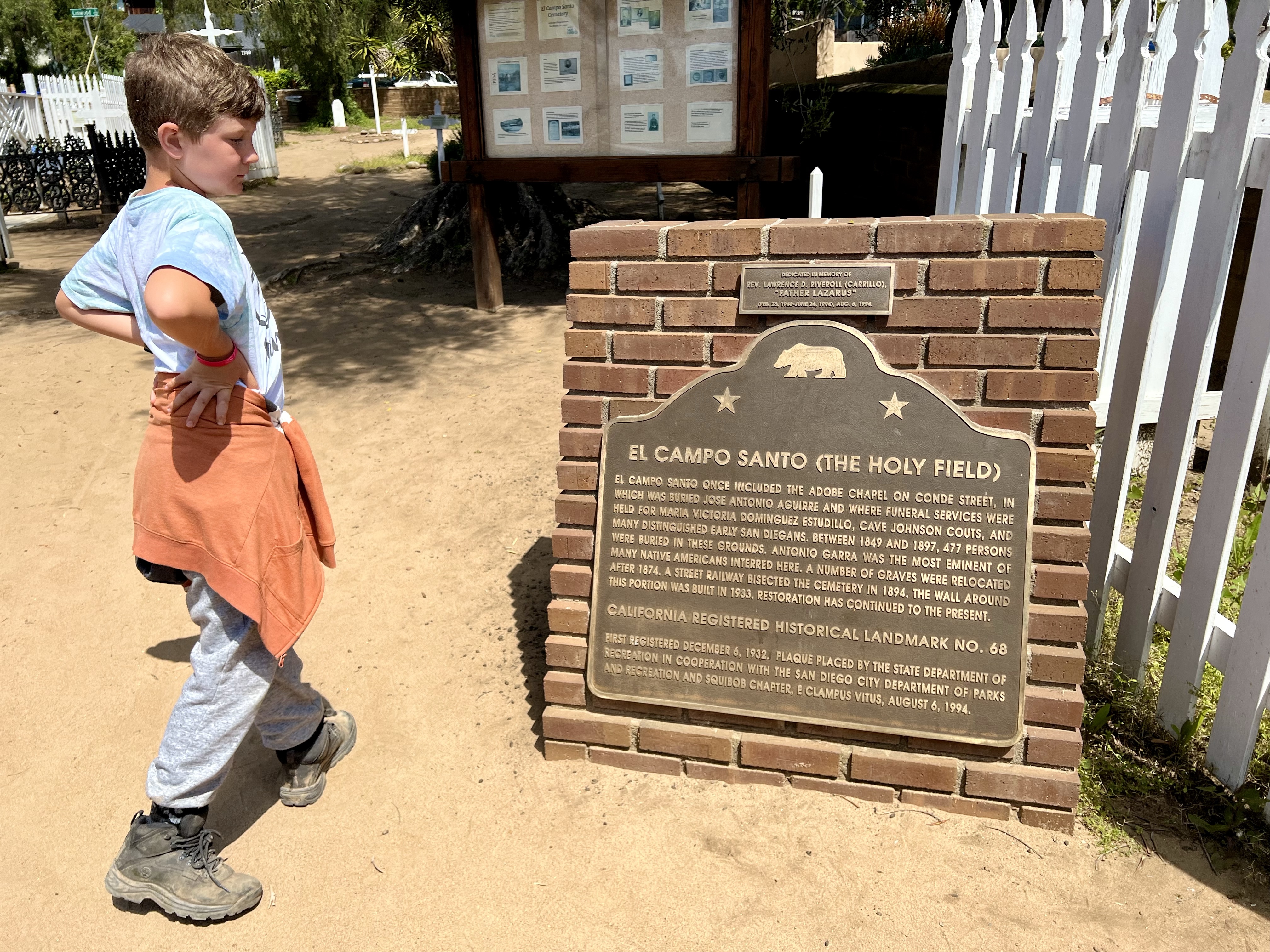 We then headed down the main street into Old Town. We stopped at a El Campo Santo, a mid-1800’s cemetery. At the turn of the 19th century, a road was built that went through the cemetery. There are small metal discs embedded in the road & sidewalks, pointing out graves below the surface that have been found. The kids read every single marker & sheet of information here!