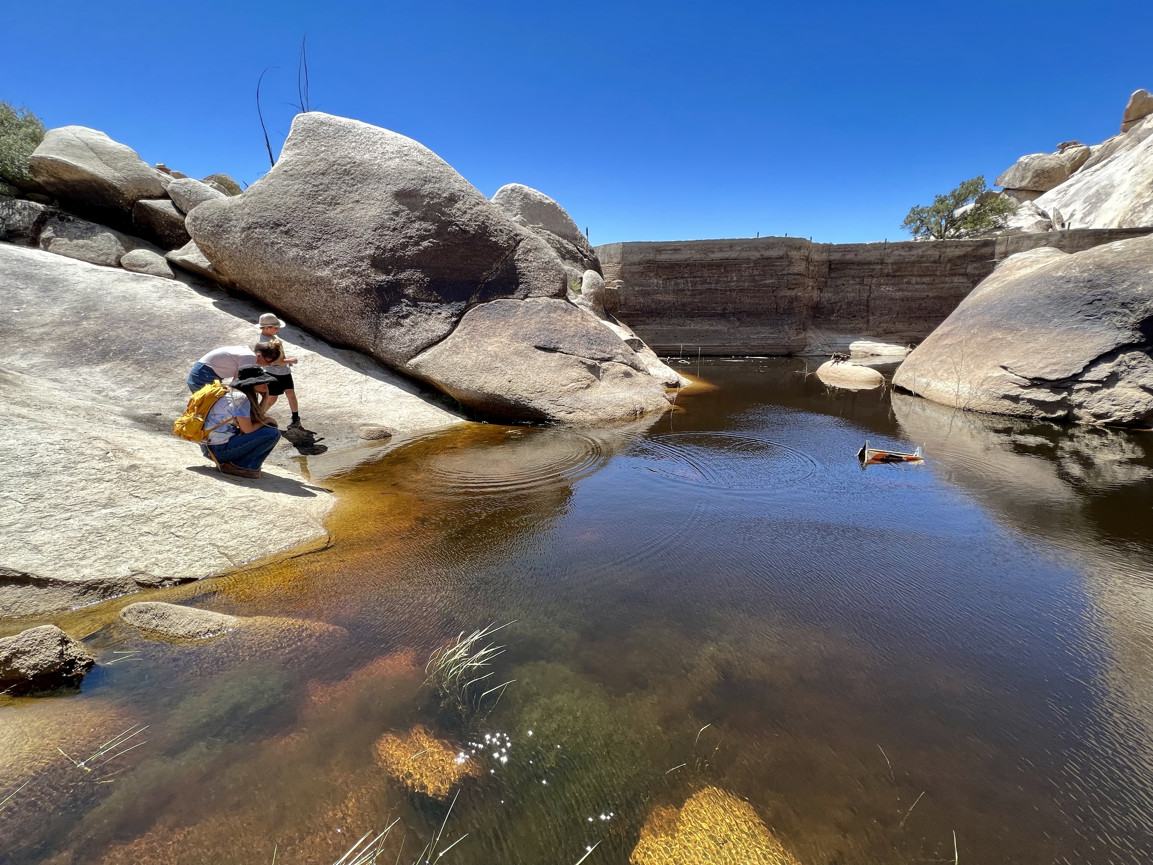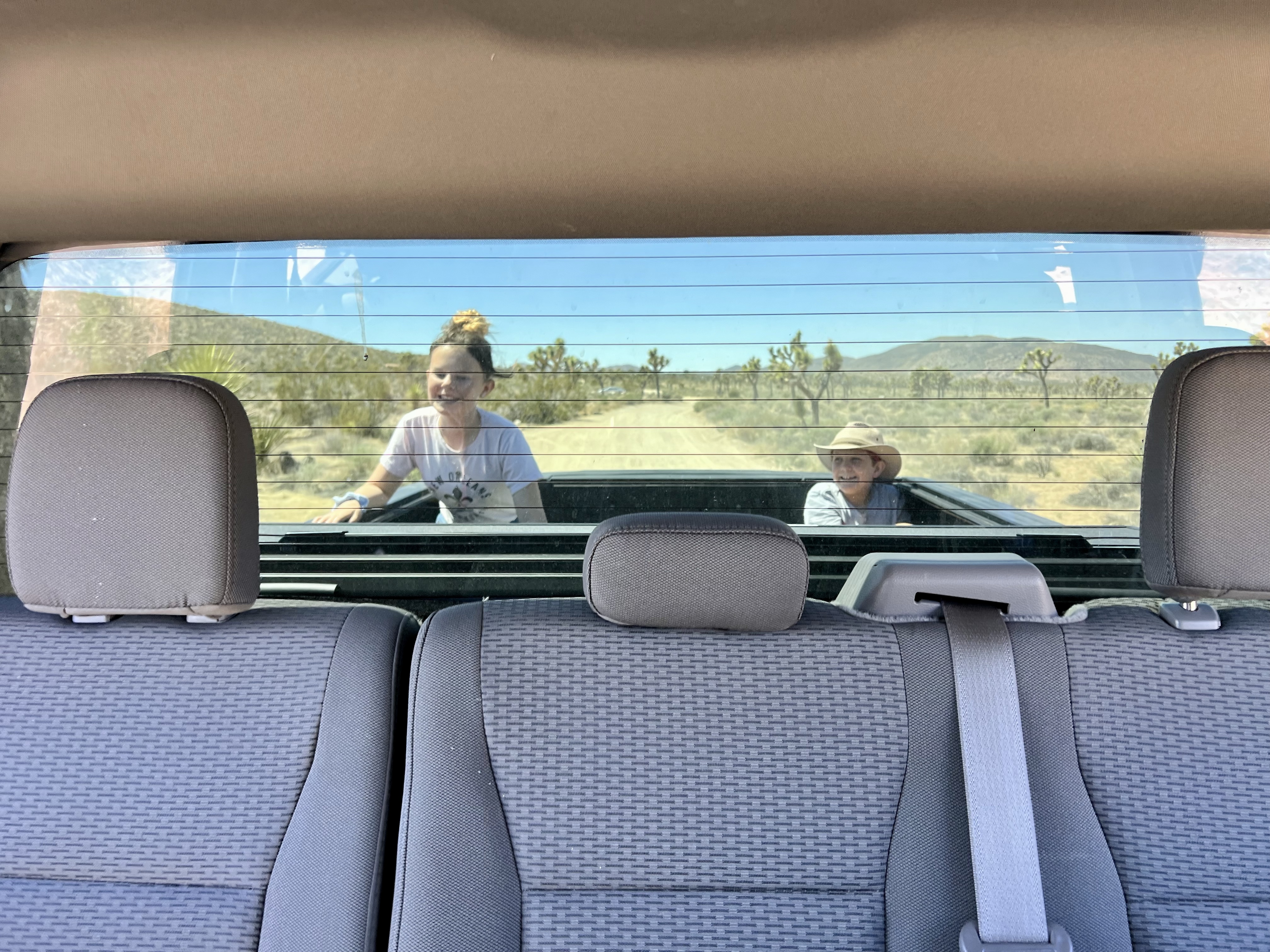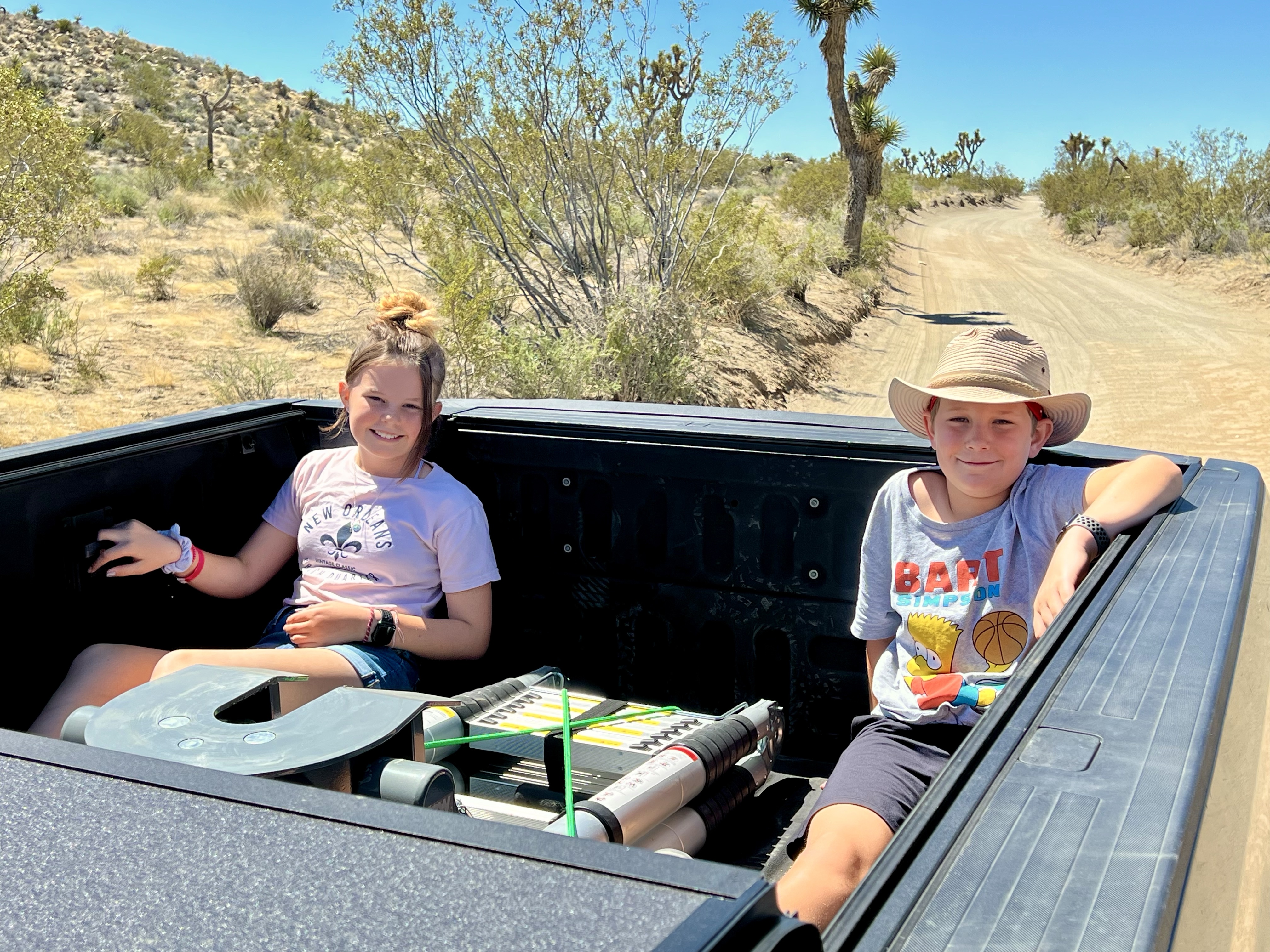 Next was Barker Dam, an actual dam created by cowboys & ranchers as a spot to water their cattle. Like yesterday, we took the unpaved way there! The kids (& TJ for a while) got to ride in the bed of the truck!