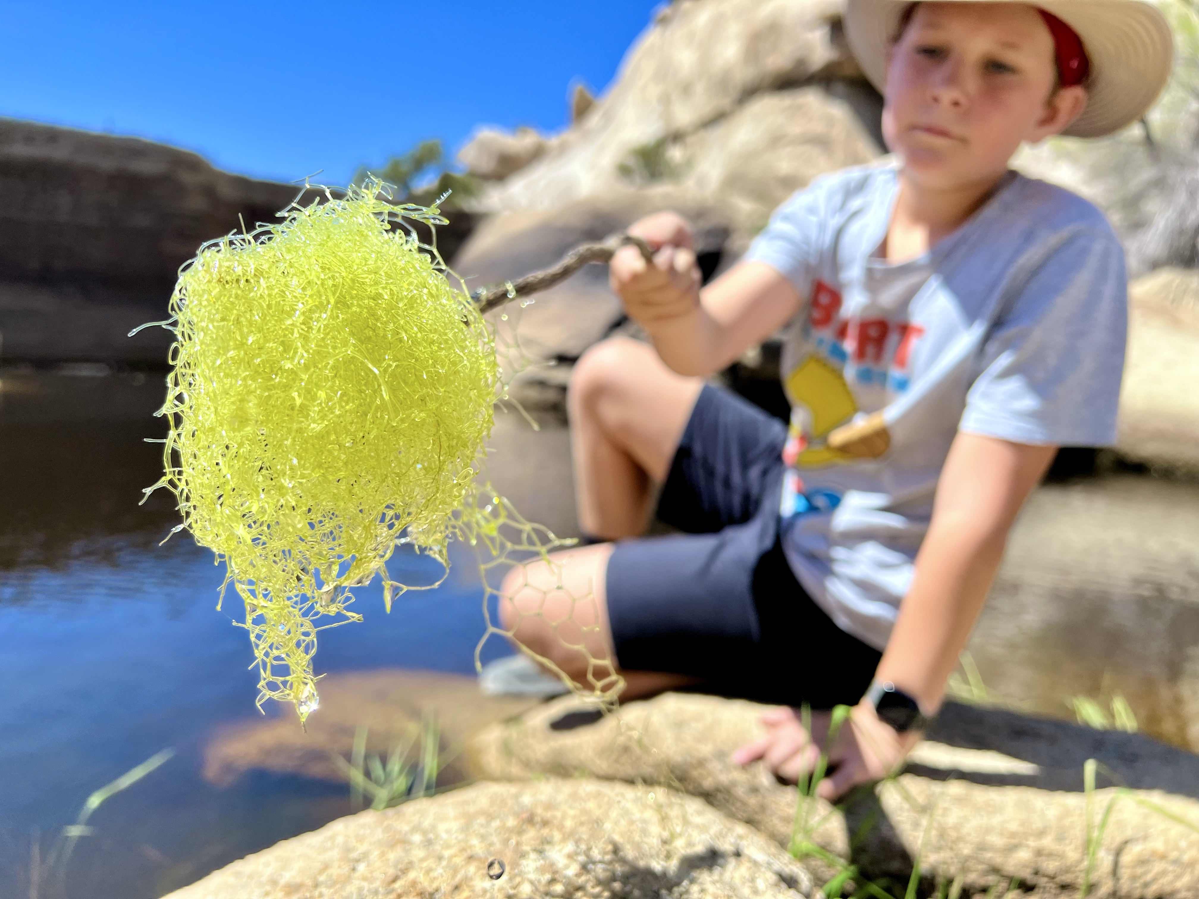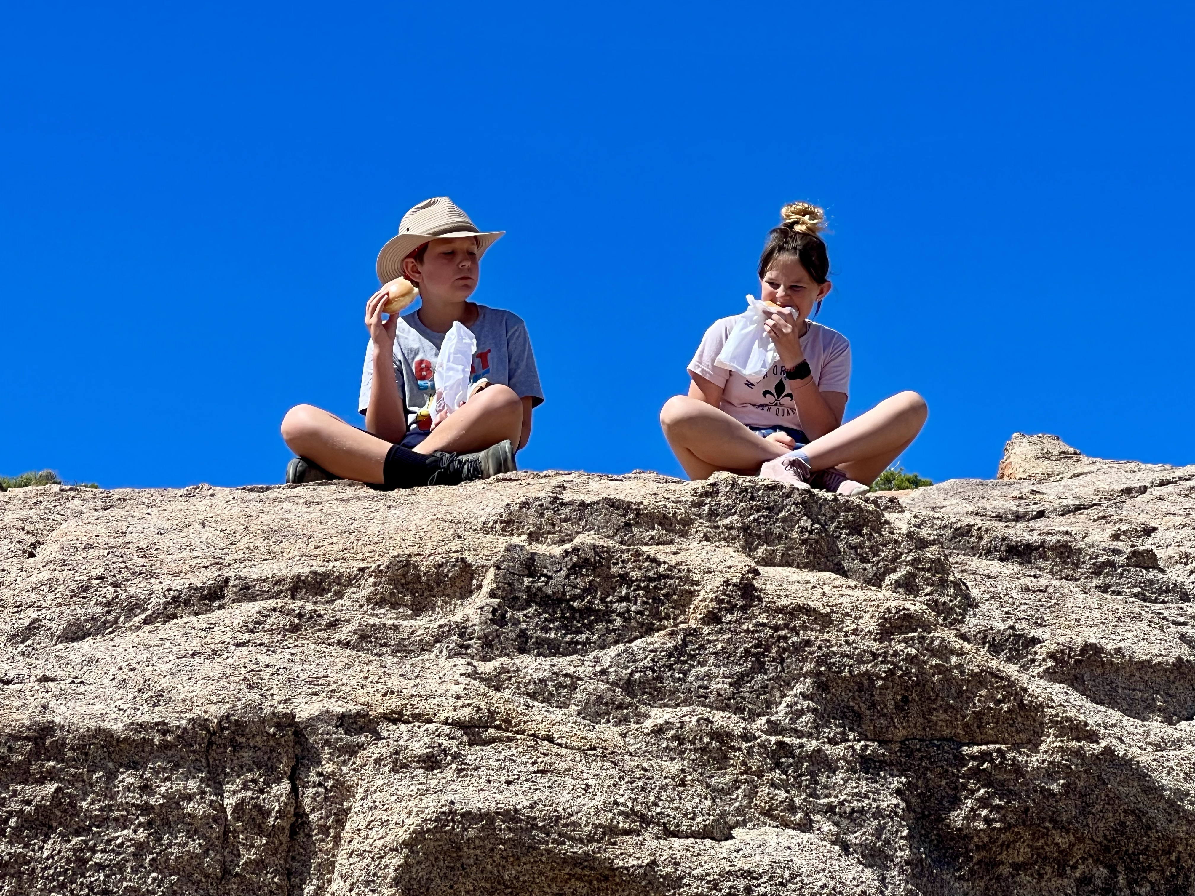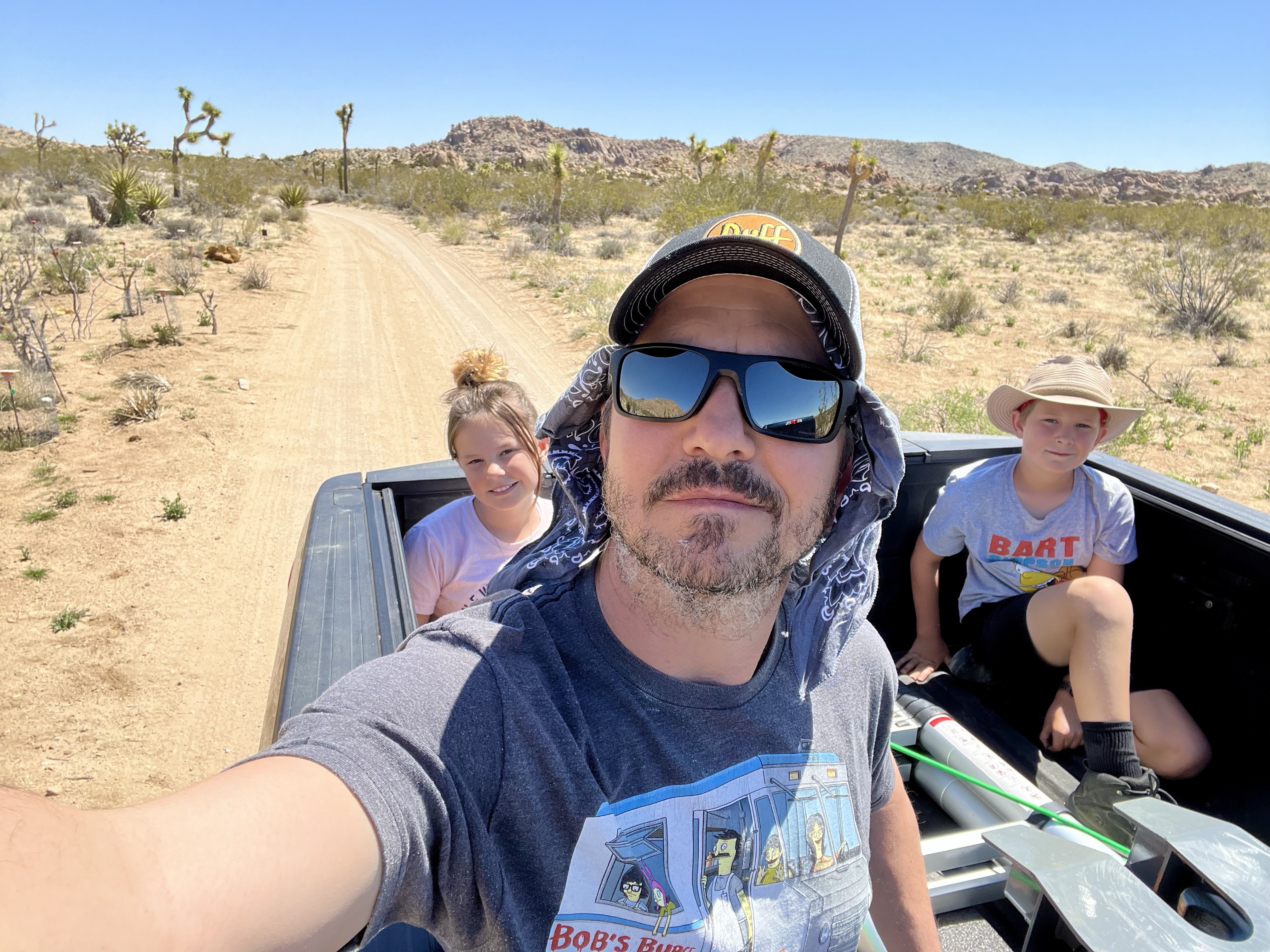 Next was Barker Dam, an actual dam created by cowboys & ranchers as a spot to water their cattle. Like yesterday, we took the unpaved way there! The kids (& TJ for a while) got to ride in the bed of the truck!