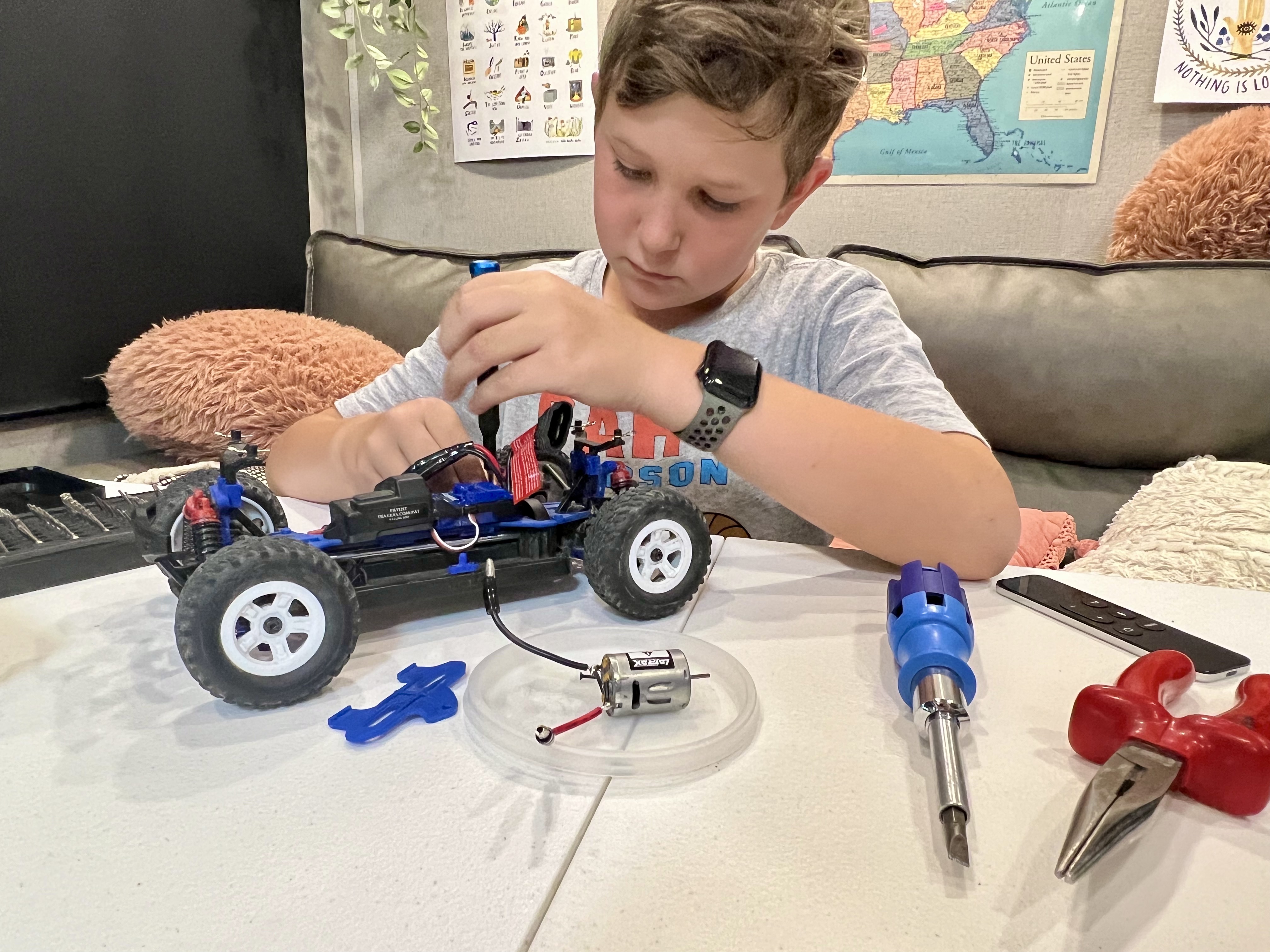 Chase spent the evening fixing his RC car’s motor. He has learned so much about fixing this & RC cars in general!