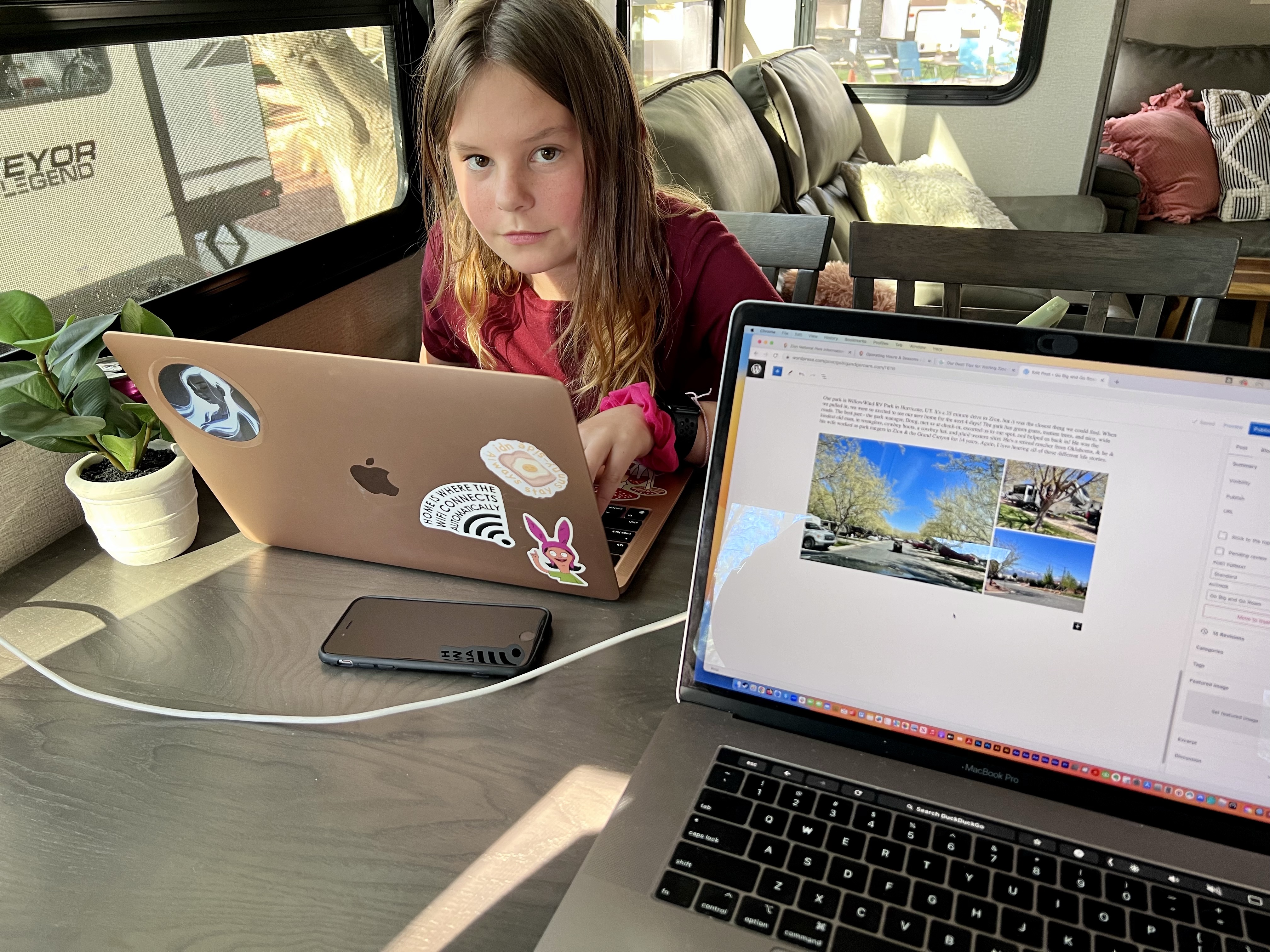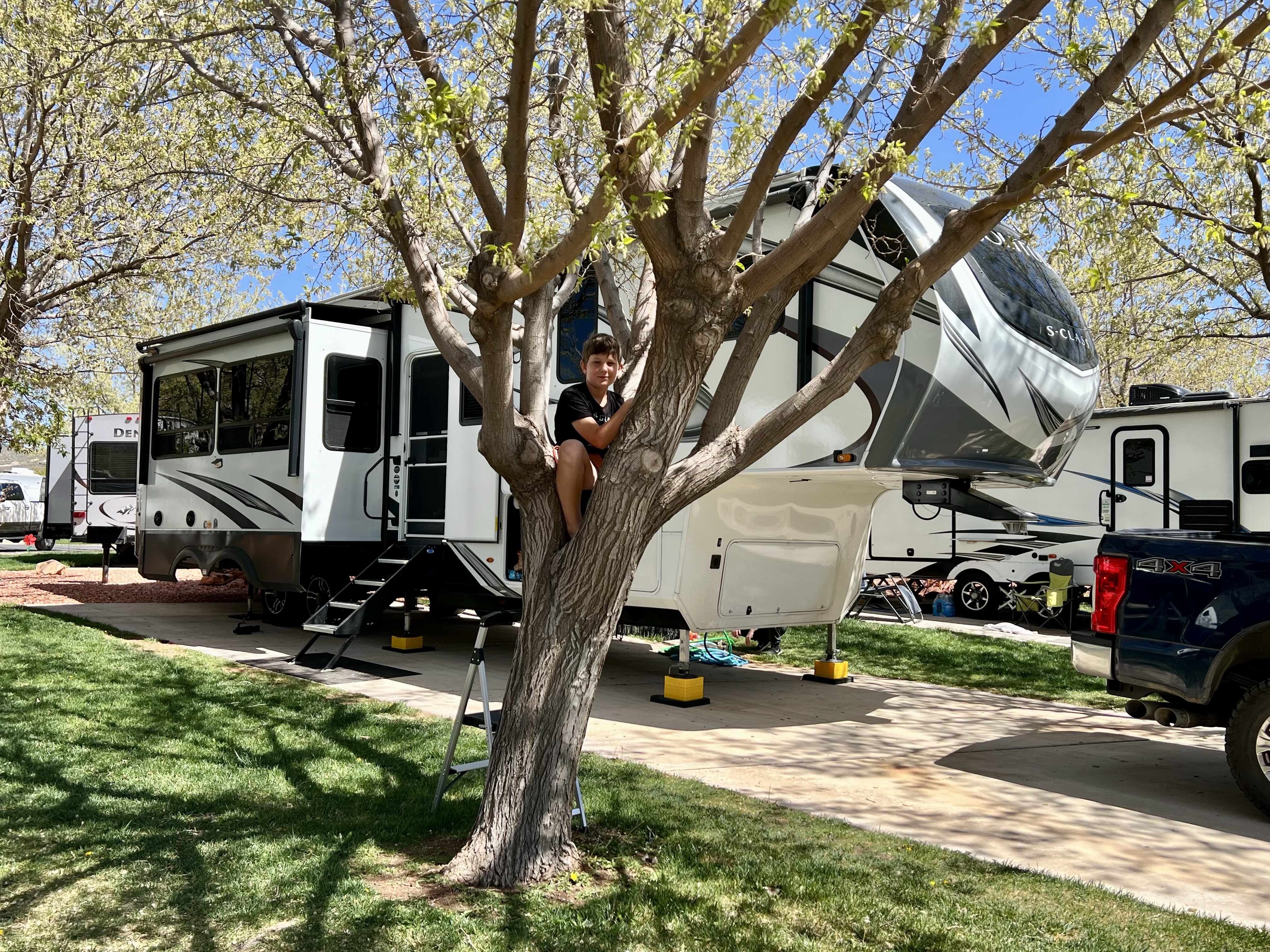 This is now our 8th campground, & we’re realizing that each campground definitely has a vibe – & it’s apparent almost immediately. The kids pick up on it, too. There have been campgrounds where they have no interest in going outside, let alone explore. At other campgrounds, they head out & feel comfortable exploring. Today, we weren’t even unhooked before Sofina took off on her scooter for an hour! Chase got a better view from the tree. While I worked on pictures & blogging, Sofina connected with her friend online to play games & chat.