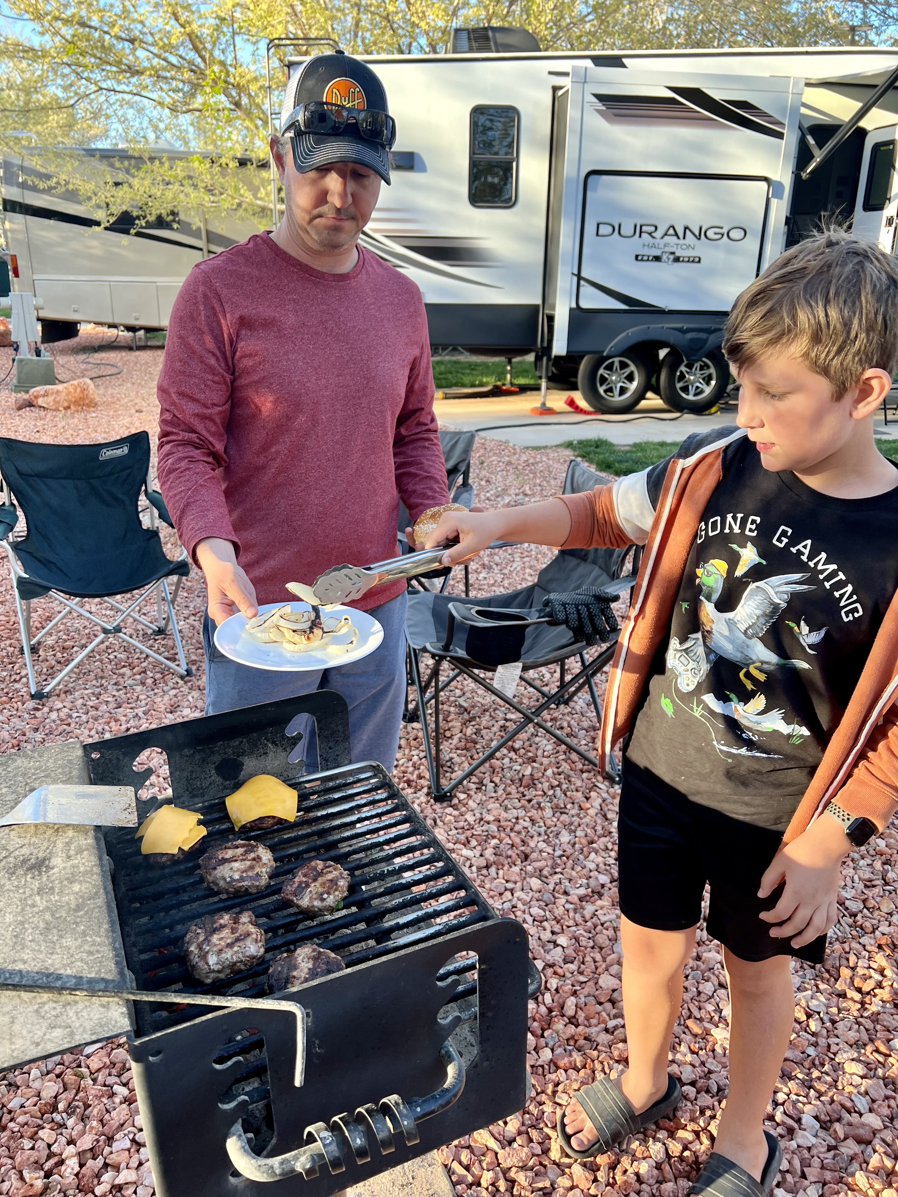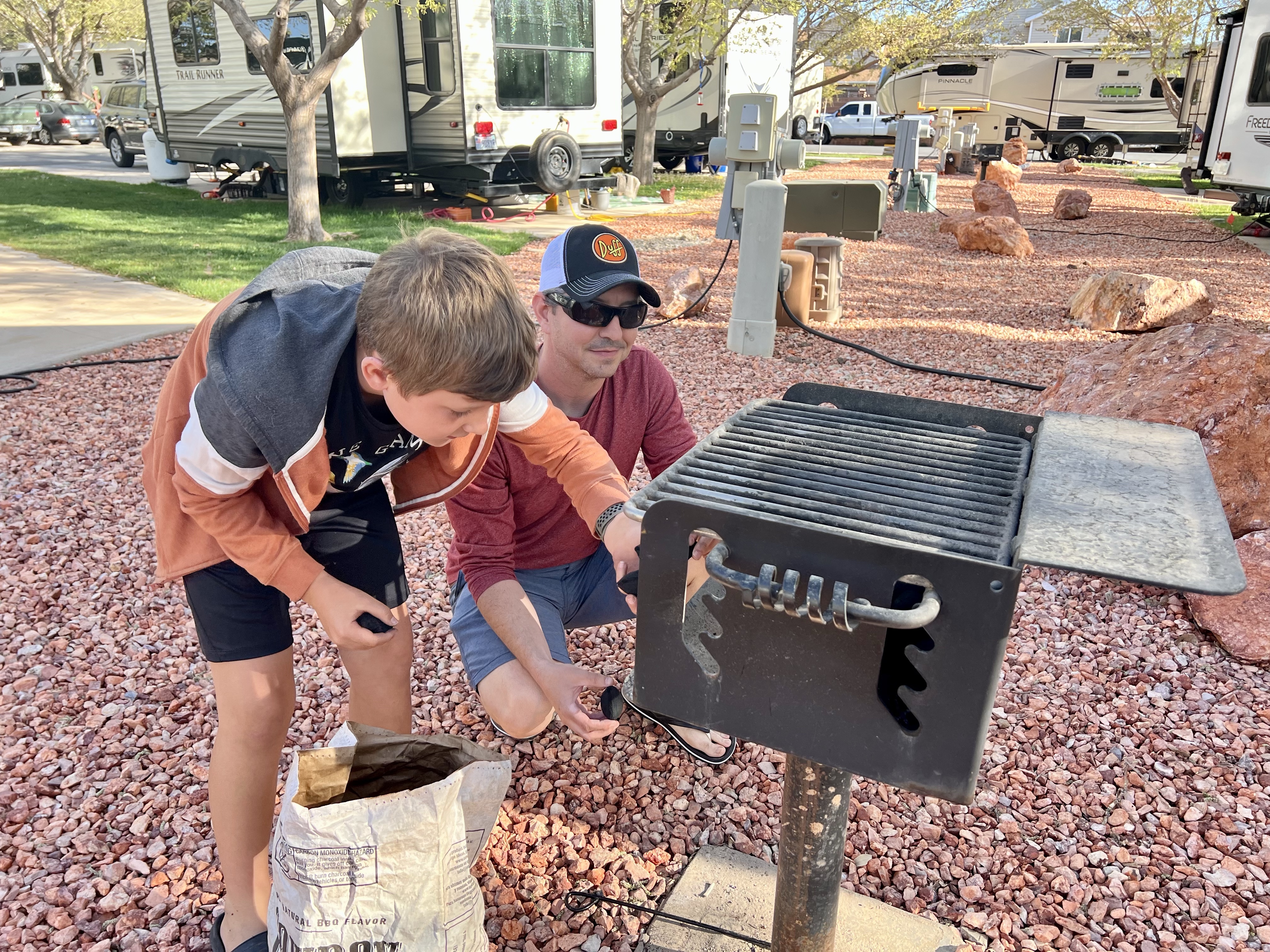 As soon as Chase saw the charcoal grill behind our spot, he wanted to try it. Neither TJ nor I have ever grilled on charcoal, so they did a little Googling, a little YouTube-ing, went to Tractor Supply for supplies, and set to it. Chase & I made the burgers, & he loved grilling them. They were delicious! Also, this rock area behind the spots is so nice! It really makes the spots feel more private!
