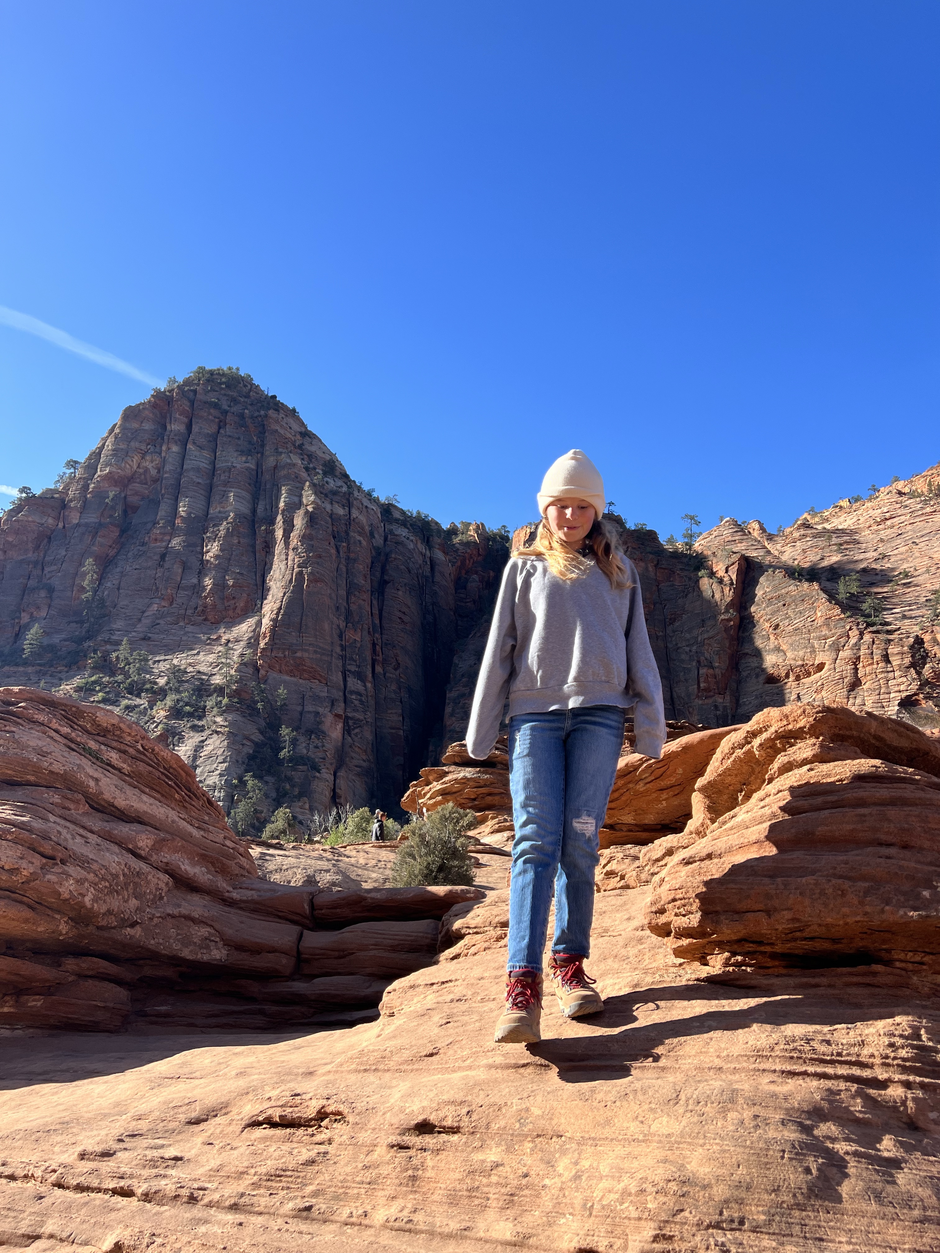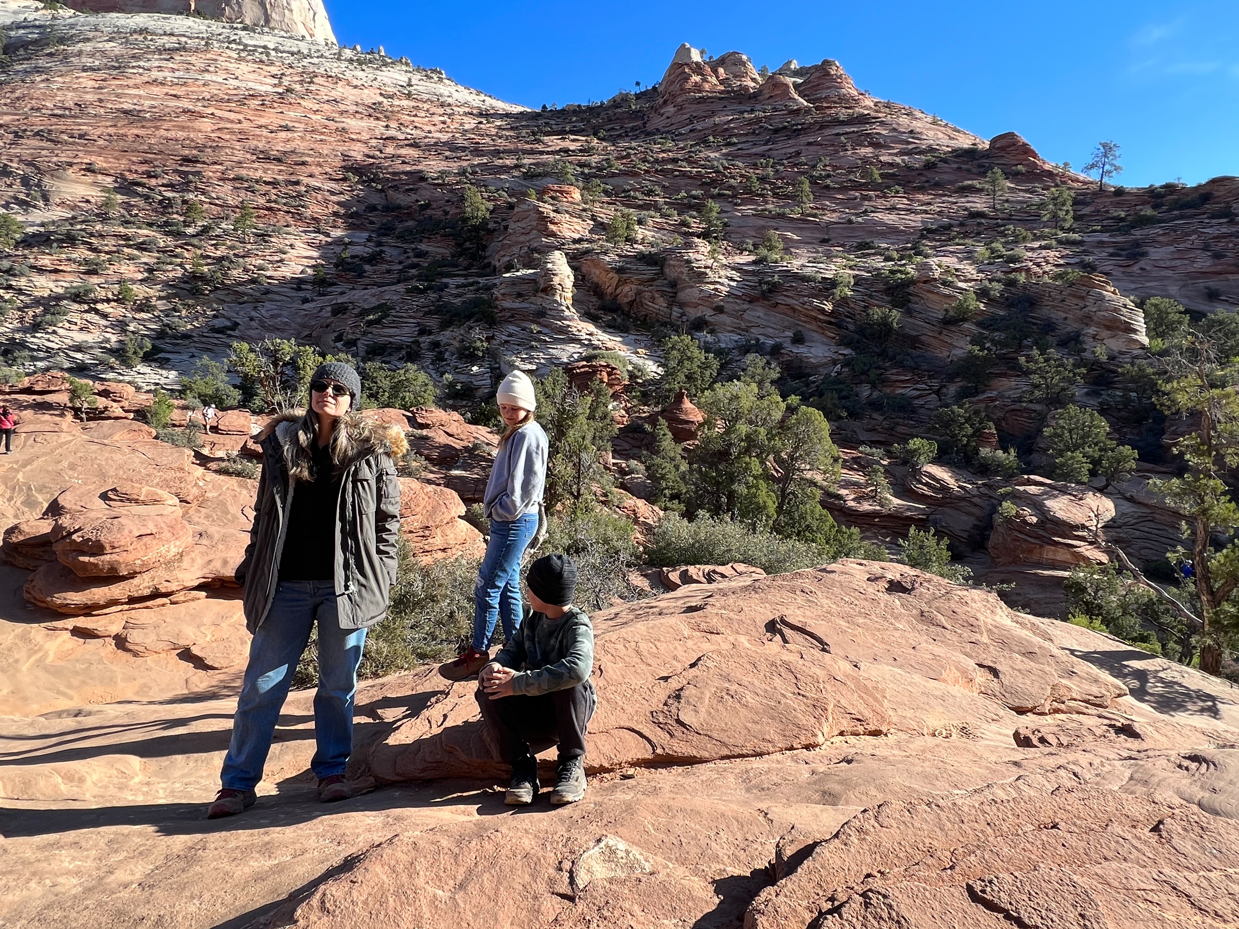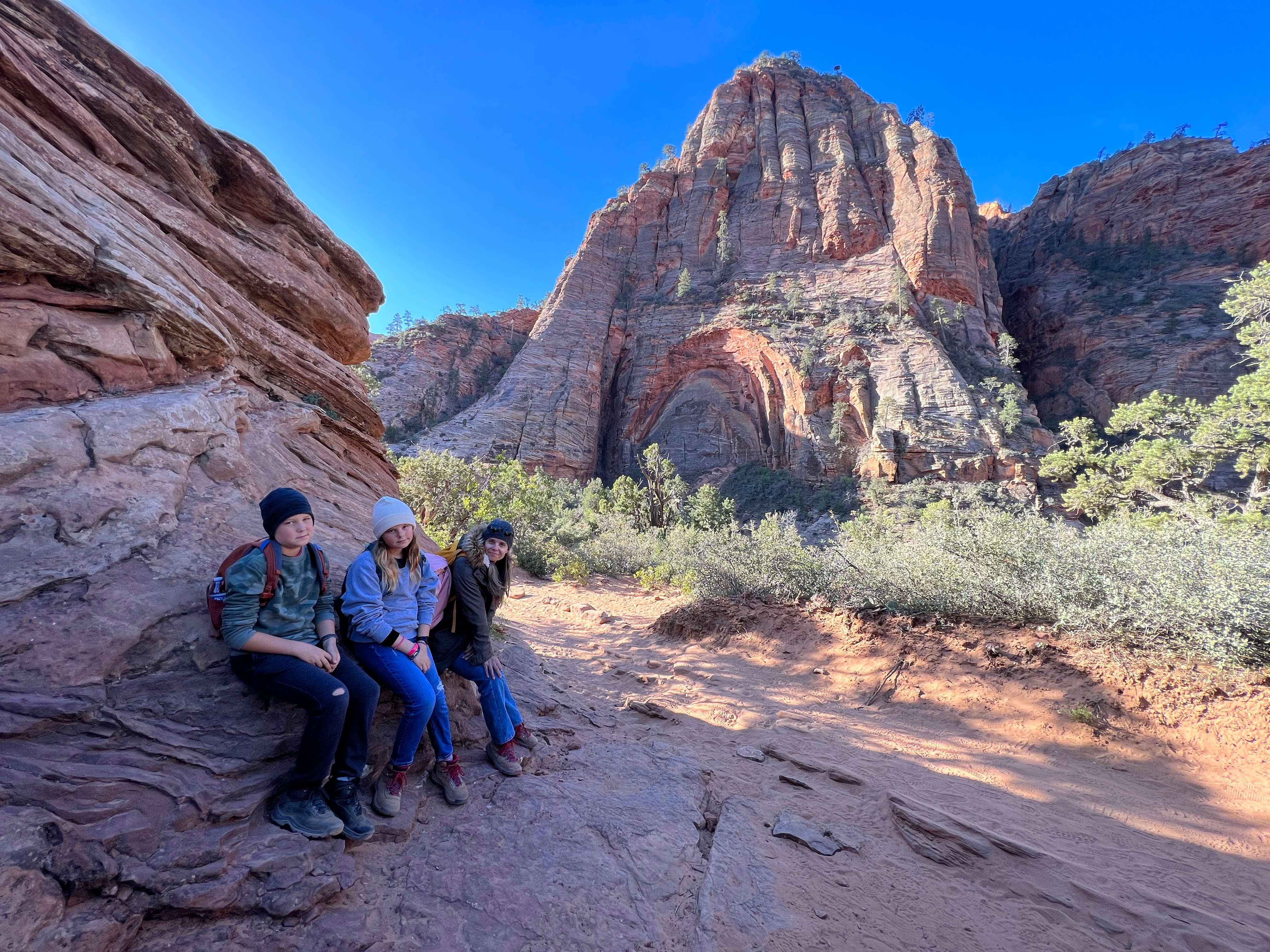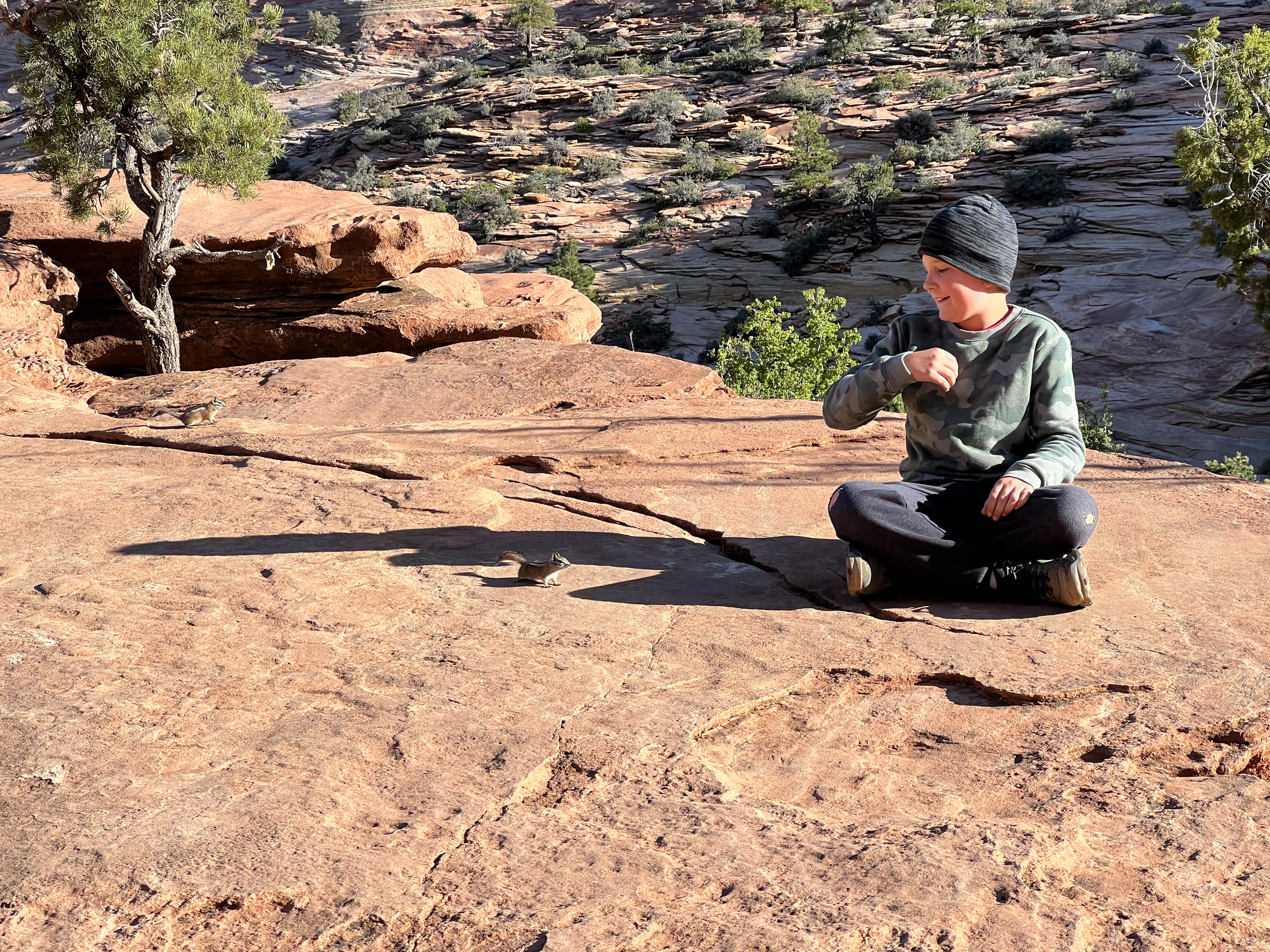 We walked along the road to the trailhead & read the trail sign. It mentioned something like, “minor drop-offs and handrails,” and “not recommended for those affected by heights.” Suuuuper. I’d assumed since it was only 1 mile long, and an “overlook,” it would be simple & safe. I apparently have a different connotation of “overlook.” Everything here is on a superhuman scale – the scale doesn’t even make sense. This sure was an overlook, as in you look right over the edge of a cliff & can’t even see the bottom. The trail is mostly a path carved out of sandstone along a cliff. I hugged that cliff & drove the kids crazy, reminding them to BE CAREFUL. We could hear the river, & it was loud, but it was so far down into the slit of the canyon that we couldn’t even see it! As usual, it was absolutely worth it (to the kids, especially to play with chipmunks on a mountain). — Also, if an 80-year-old rancher from Texas offers to take your family photo at an overlook, kindly say “no thank you” & ask the Instagrammer ladies on the cliff risking their lives for the perfect shot – they know what they’re doing – picture-wise, at least. —
