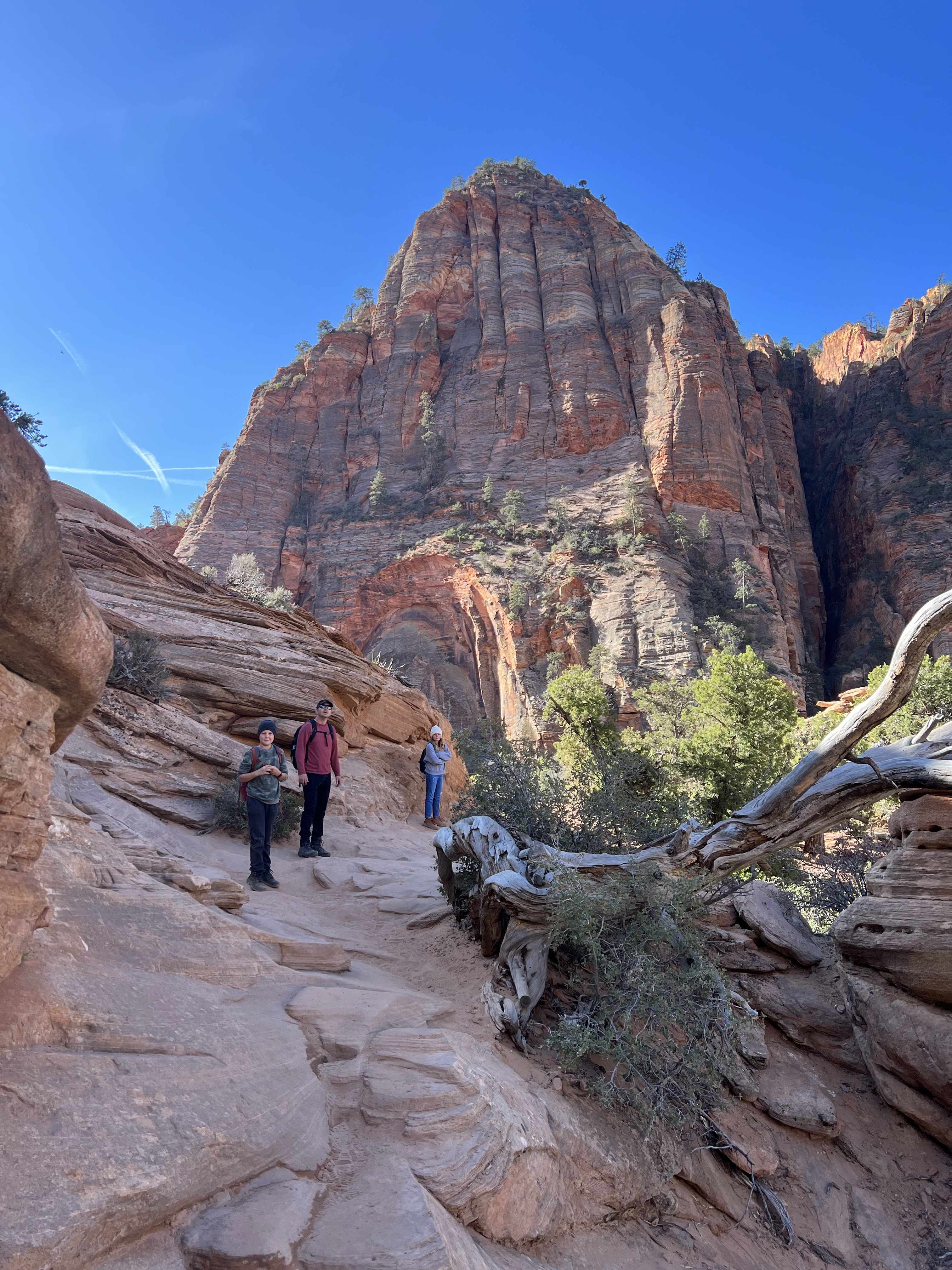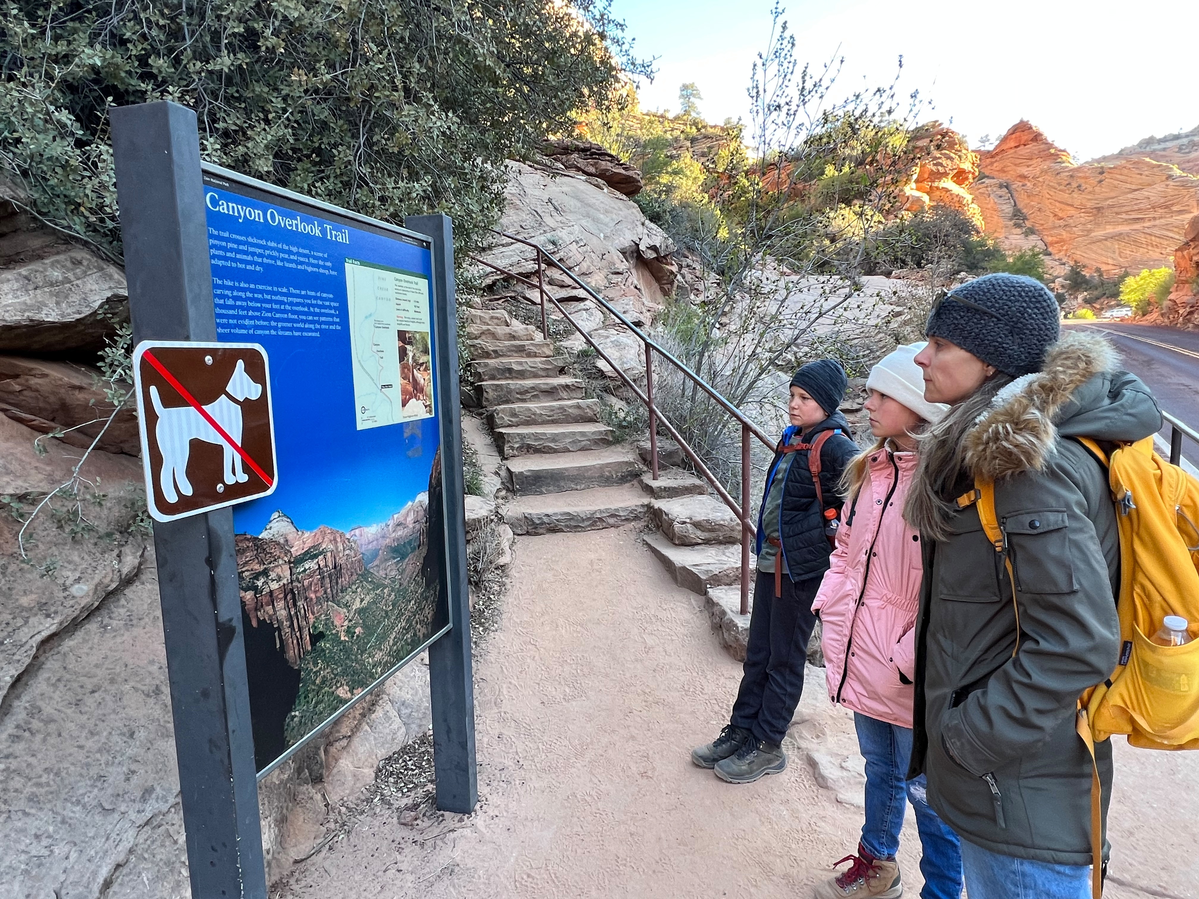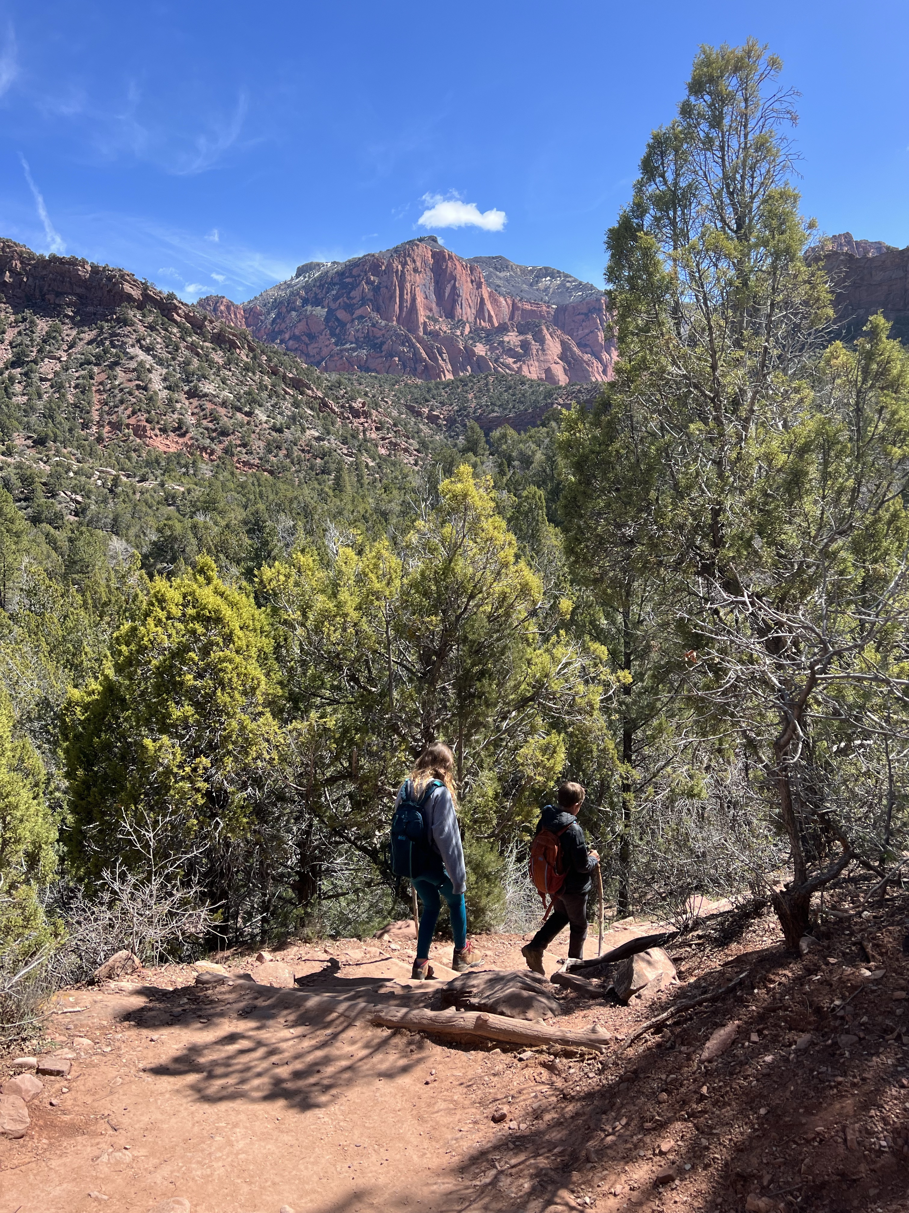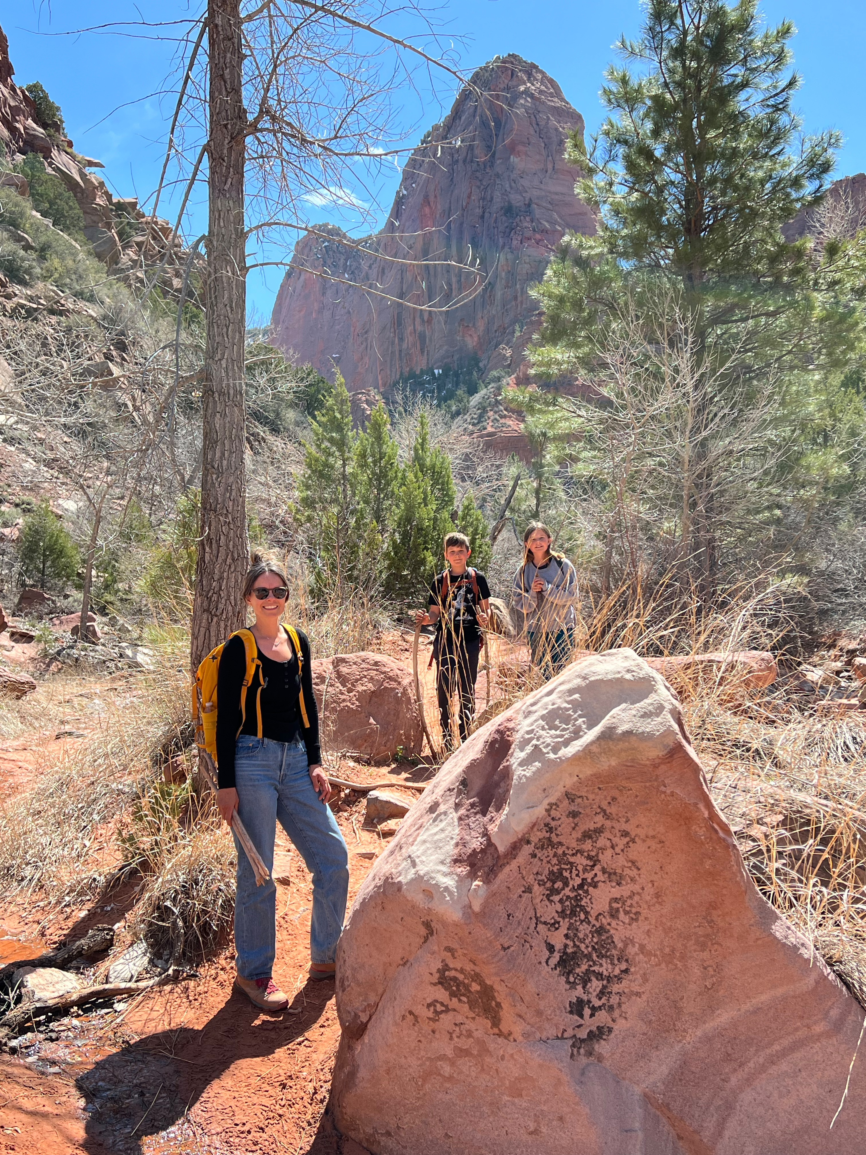 We walked along the road to the trailhead & read the trail sign. It mentioned something like, “minor drop-offs and handrails,” and “not recommended for those affected by heights.” Suuuuper. I’d assumed since it was only 1 mile long, and an “overlook,” it would be simple & safe. I apparently have a different connotation of “overlook.” Everything here is on a superhuman scale – the scale doesn’t even make sense. This sure was an overlook, as in you look right over the edge of a cliff & can’t even see the bottom. The trail is mostly a path carved out of sandstone along a cliff. I hugged that cliff & drove the kids crazy, reminding them to BE CAREFUL. We could hear the river, & it was loud, but it was so far down into the slit of the canyon that we couldn’t even see it! As usual, it was absolutely worth it (to the kids, especially to play with chipmunks on a mountain). — Also, if an 80-year-old rancher from Texas offers to take your family photo at an overlook, kindly say “no thank you” & ask the Instagrammer ladies on the cliff risking their lives for the perfect shot – they know what they’re doing – picture-wise, at least. —
