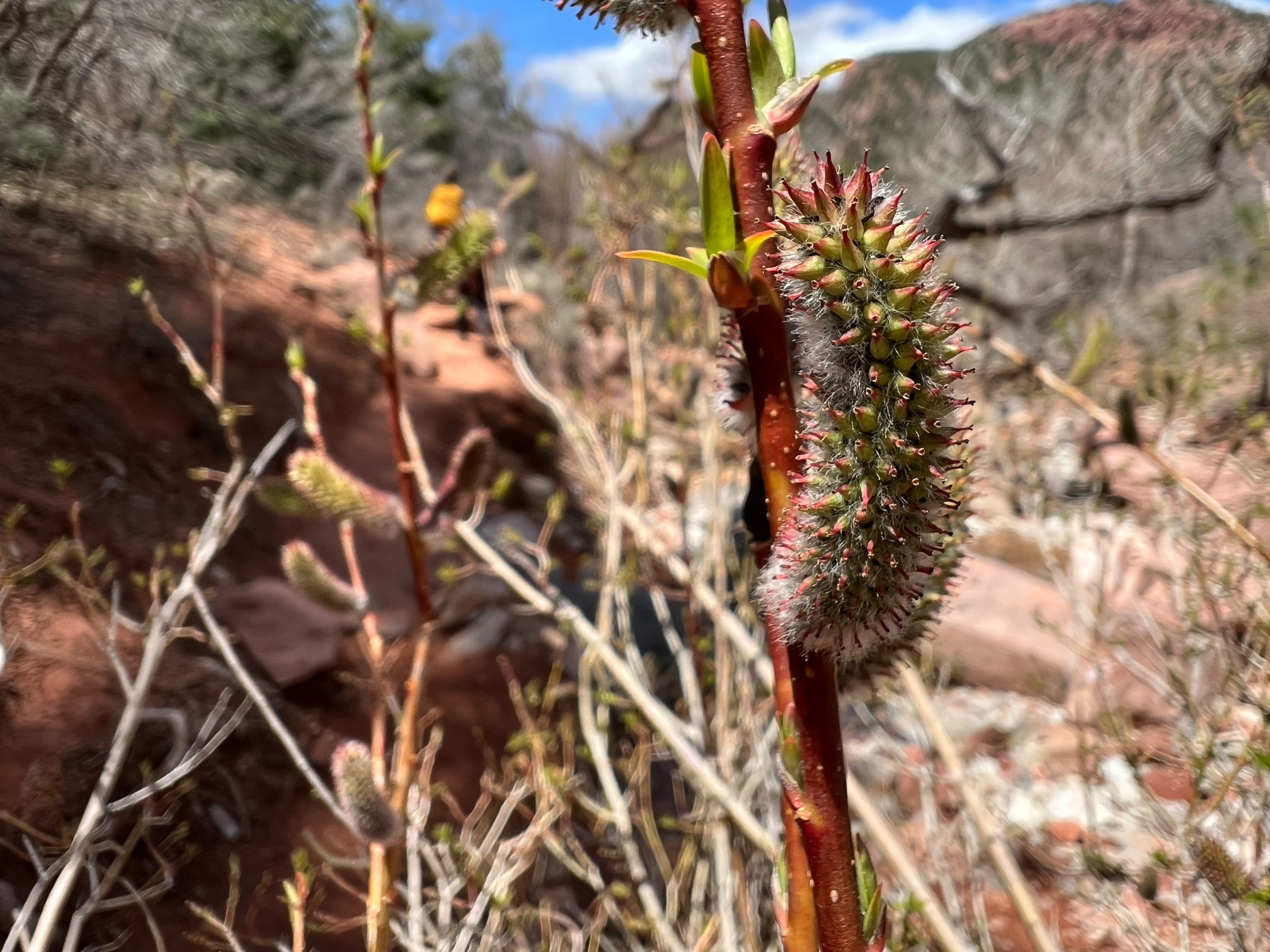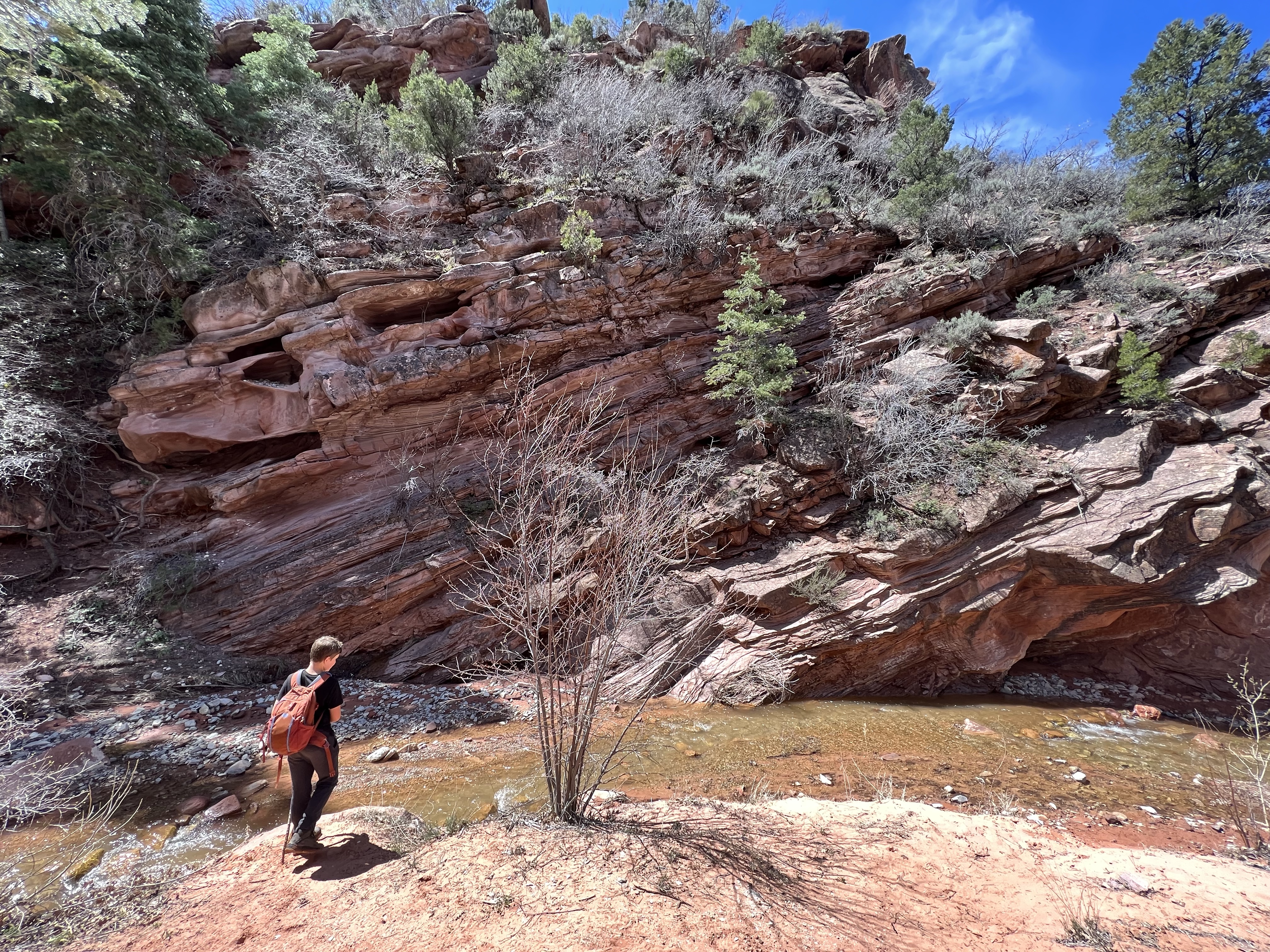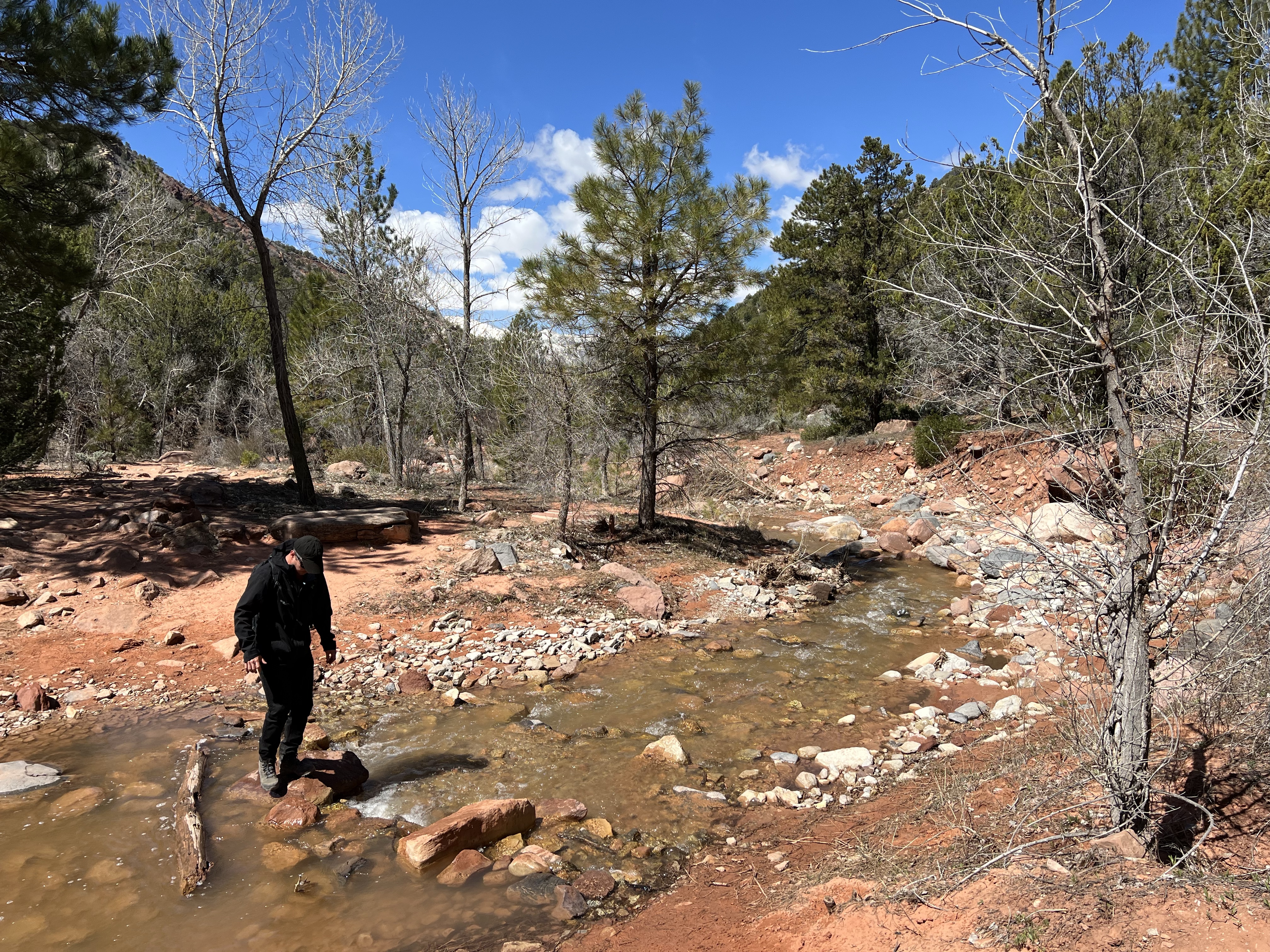 When we made it back down to the Visitor Center at 9 am, the lot was completely full, with cars idling everywhere, waiting to snag a spot if one became available (ironically, the night before, we’d watched a Simpsons episode where Homer messes with people in a parking garage, taunting them that he’s leaving his spot when he has no intention of doing so). Cantankerous Ranger gave us such a weird vibe yesterday that we didn’t feel like fighting this crowd to go on his recommended hike. I said we should head for Kolob Canyons, to the Taylor Creek Trail, the part of the park 40 miles away. I’d read it was less-visited and just as beautiful. The speed limit to get there was 80! When we got there the lot was full, but we were able to quickly get a spot after another hiker left.
