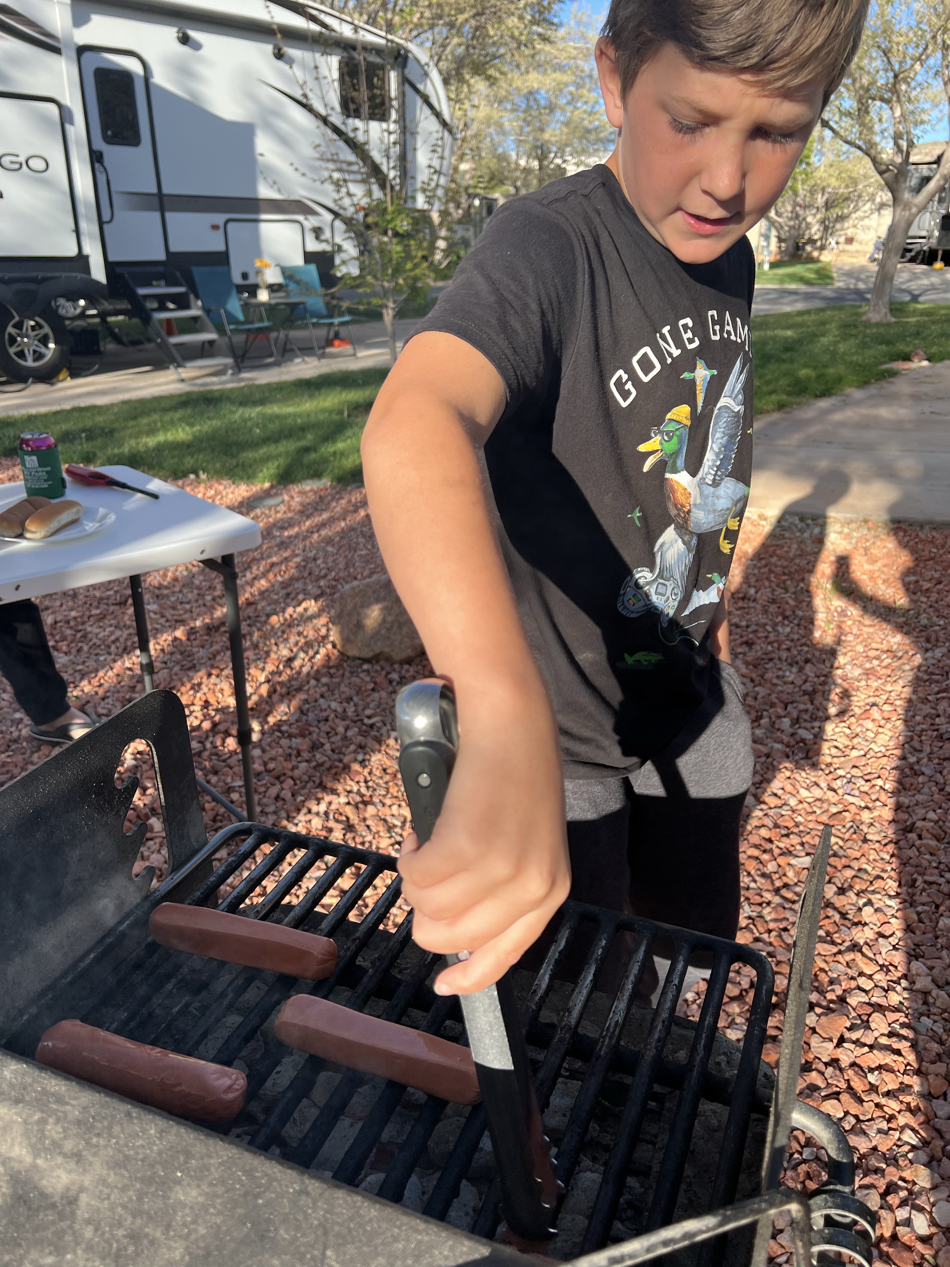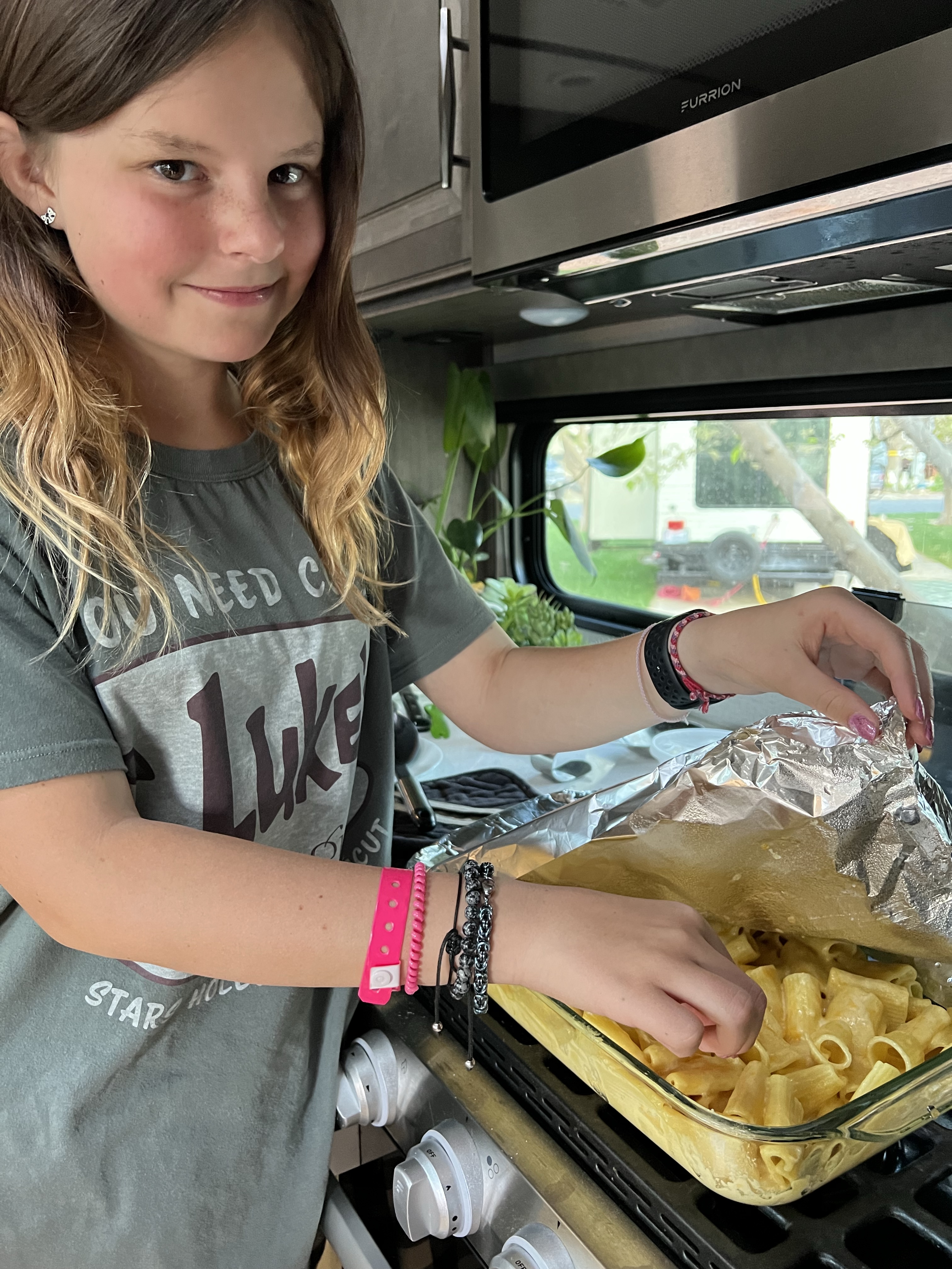 We stopped for more coffee and smoothies. Again, we still had most of the day ahead of us. That evening, we made dinner together. The boys grilled hot dogs on the charcoal grill, Sofina made her mac & cheese, & I made coleslaw.