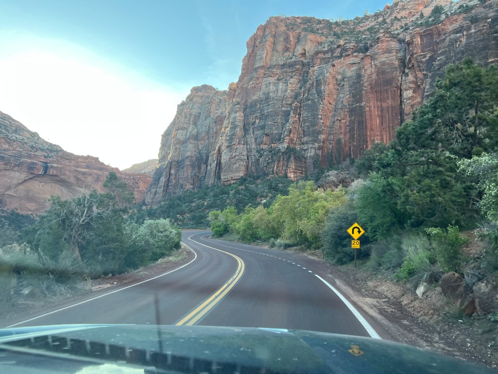 We woke up at 4:30 again, but we were dragging. At least we had a plan: get to the park & drive straight to the Zion tunnel to reach the Canyon Overlook Trail, then do Cantakerous Ranger’s recommended Sand Bench hike. The night before, Sofina & I measured our truck’s width to make sure we didn’t need a special permit for oversized vehicles in the tunnel (“If your vehicle is 11’4″ tall or taller or 7’10” wide or wider, you will need a tunnel permit.” This means rangers at either side have to stop traffic so you can go thru alone.) Our truck measured 7’4″ wide with the mirrors folded in.