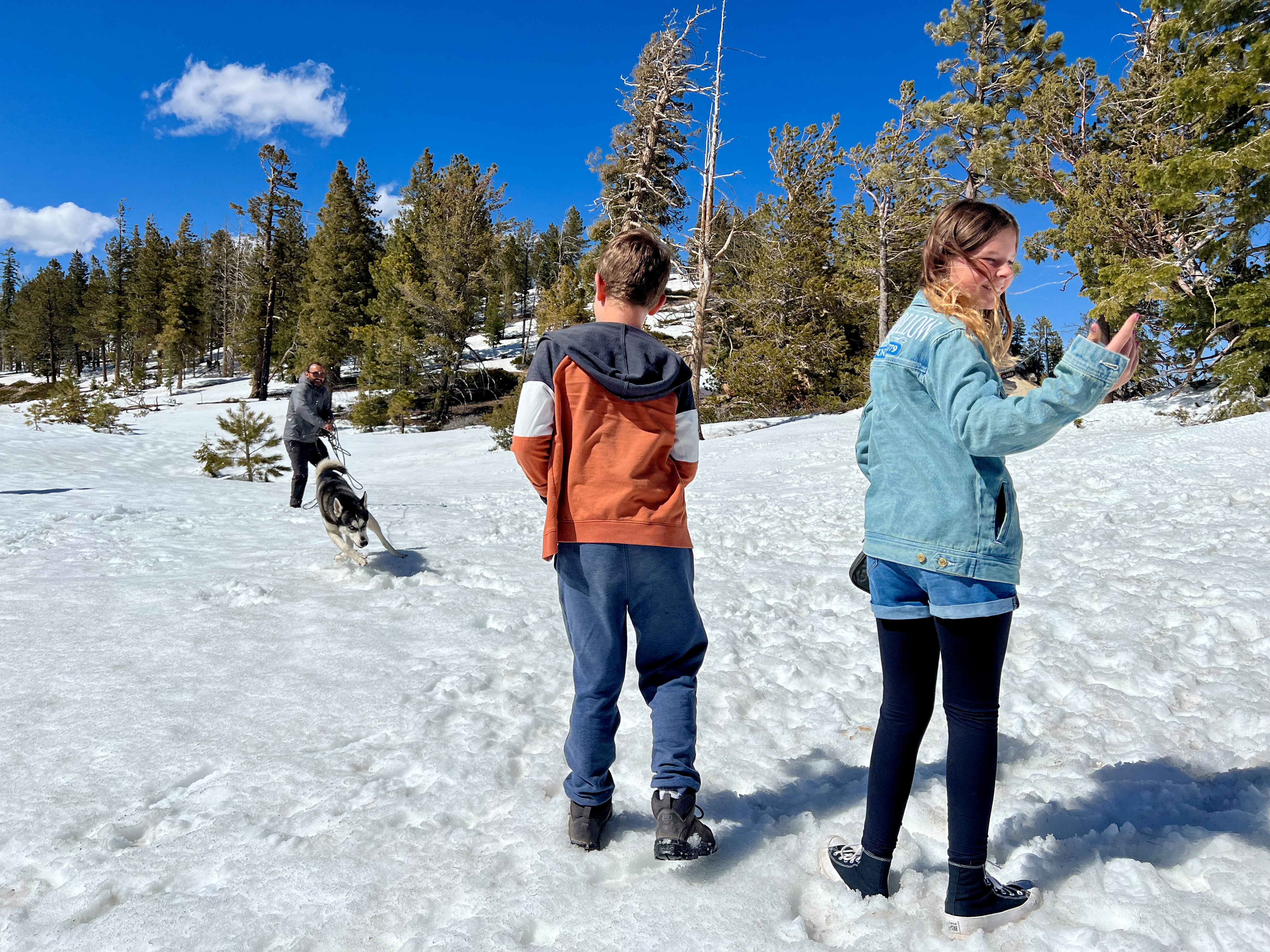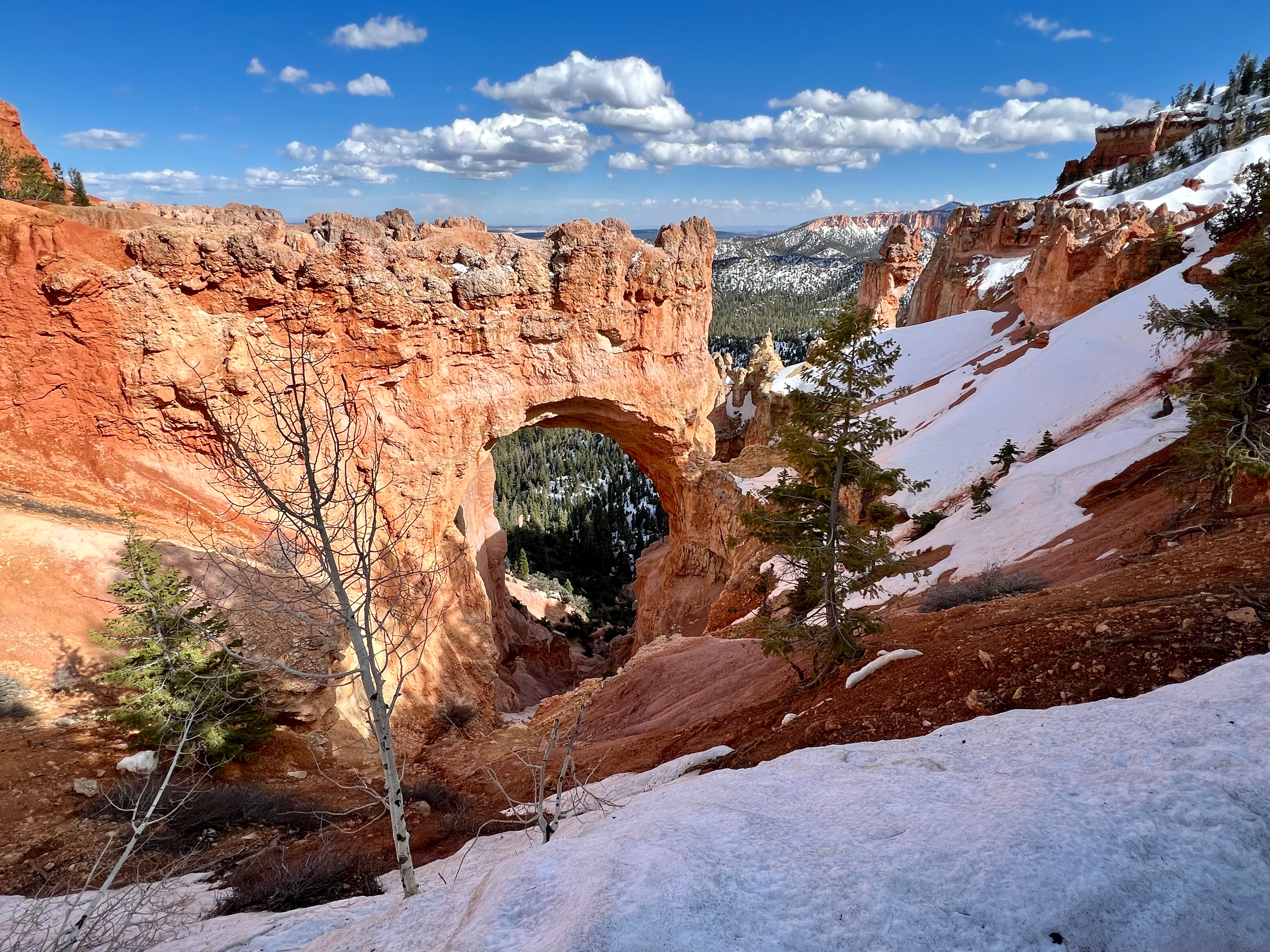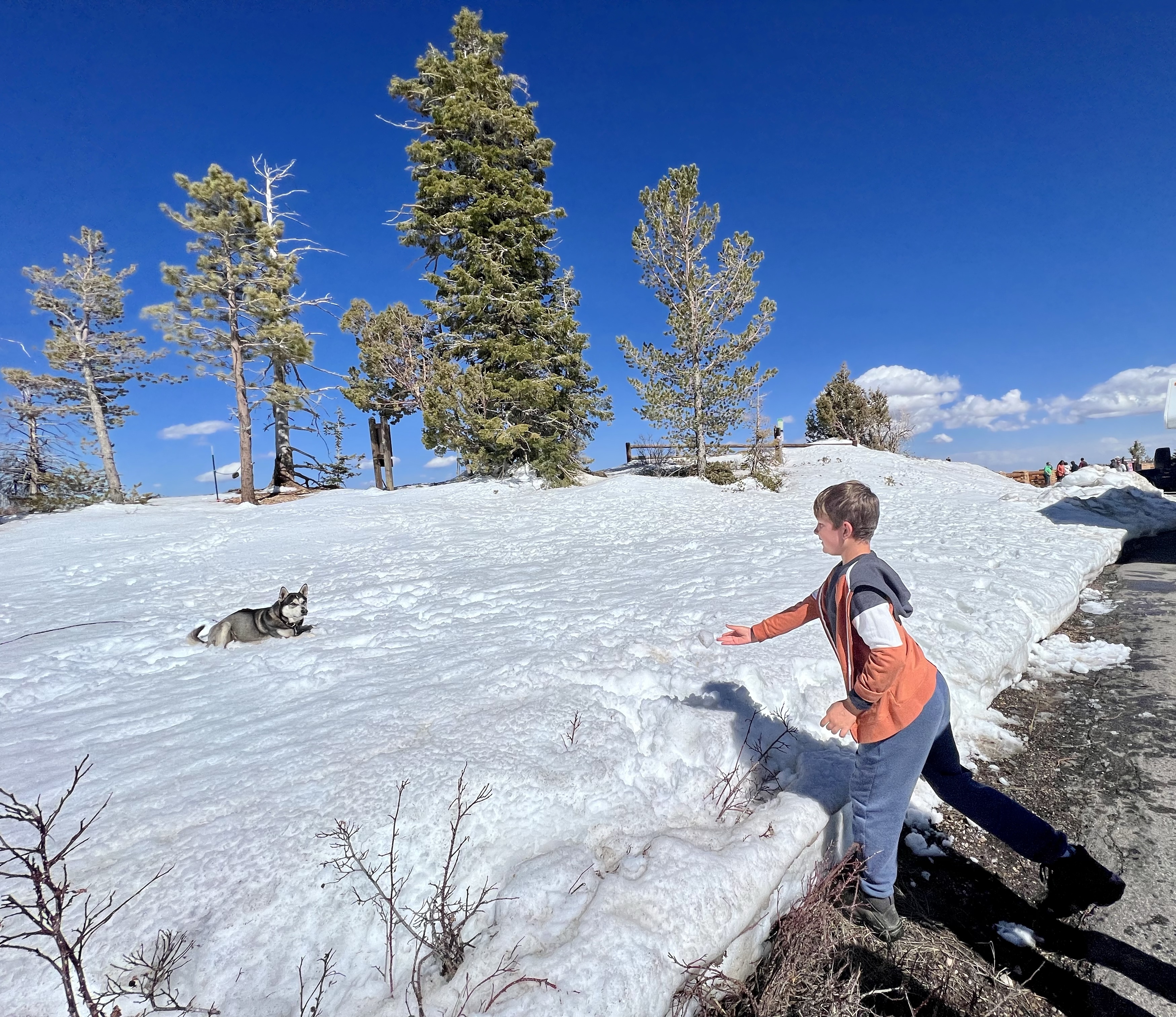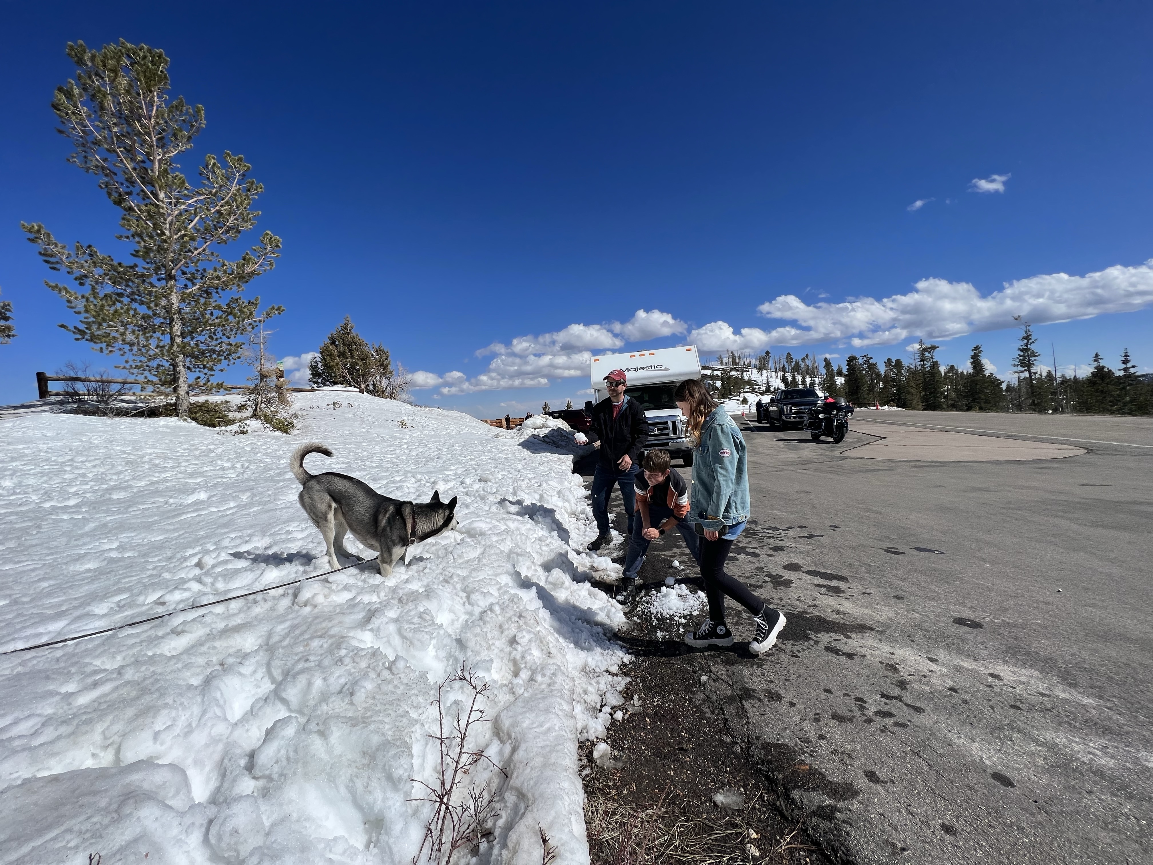 We then drove into the park to do our usual pre-hike park drive-thru. This has worked out so well for us to acquaint ourselves with the park, talk to a ranger, look at a map, & plan hikes for the next few days. We were all shocked at the amount of snow! Part of the park is still closed & some of the trails are as well. We drove all the way to Ponderosa Canyon, which is the farthest into the park you can get right now. From there, we made our way back, stopping at all the lookouts (and playing with the cutest Husky who was having the time of his life in the snow).