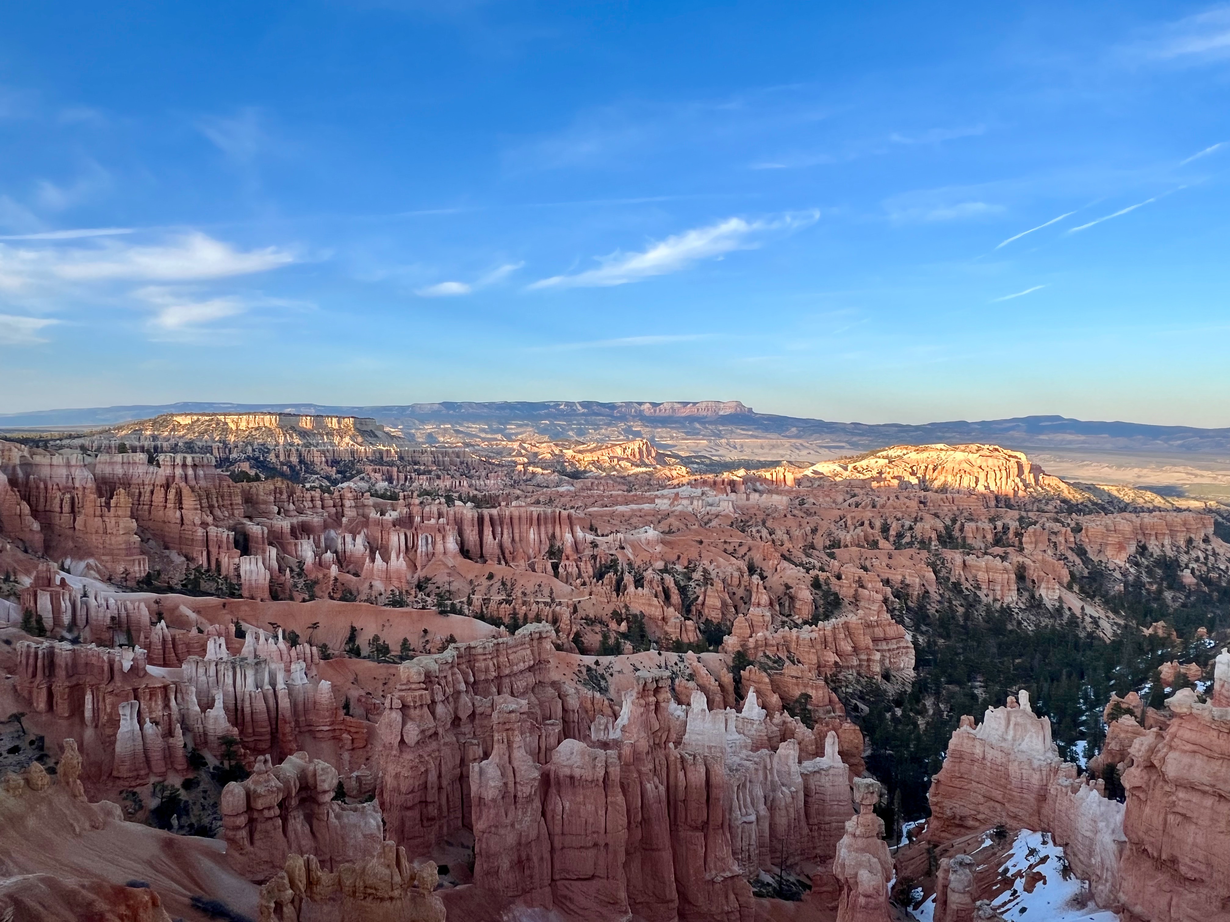 We drove back into Bryce to see the sunset over the amphitheater. We went to Sunset Point, but we were confused… the sun was setting behind us. Perhaps in the summer, when the sun is higher in the sky, it lives up to its name? We still enjoyed watching the shadows creep across the valley & the faraway mountains illuminated.