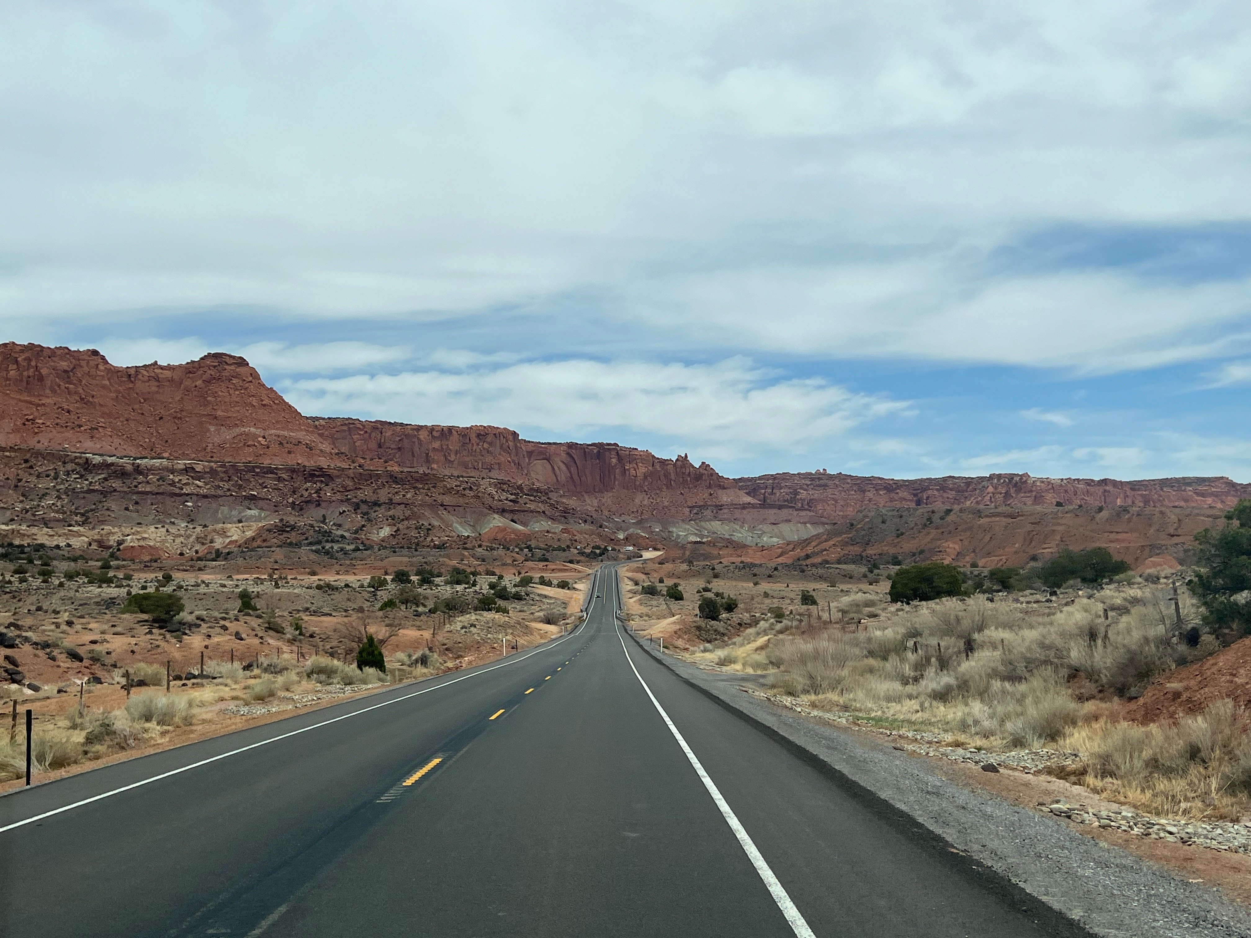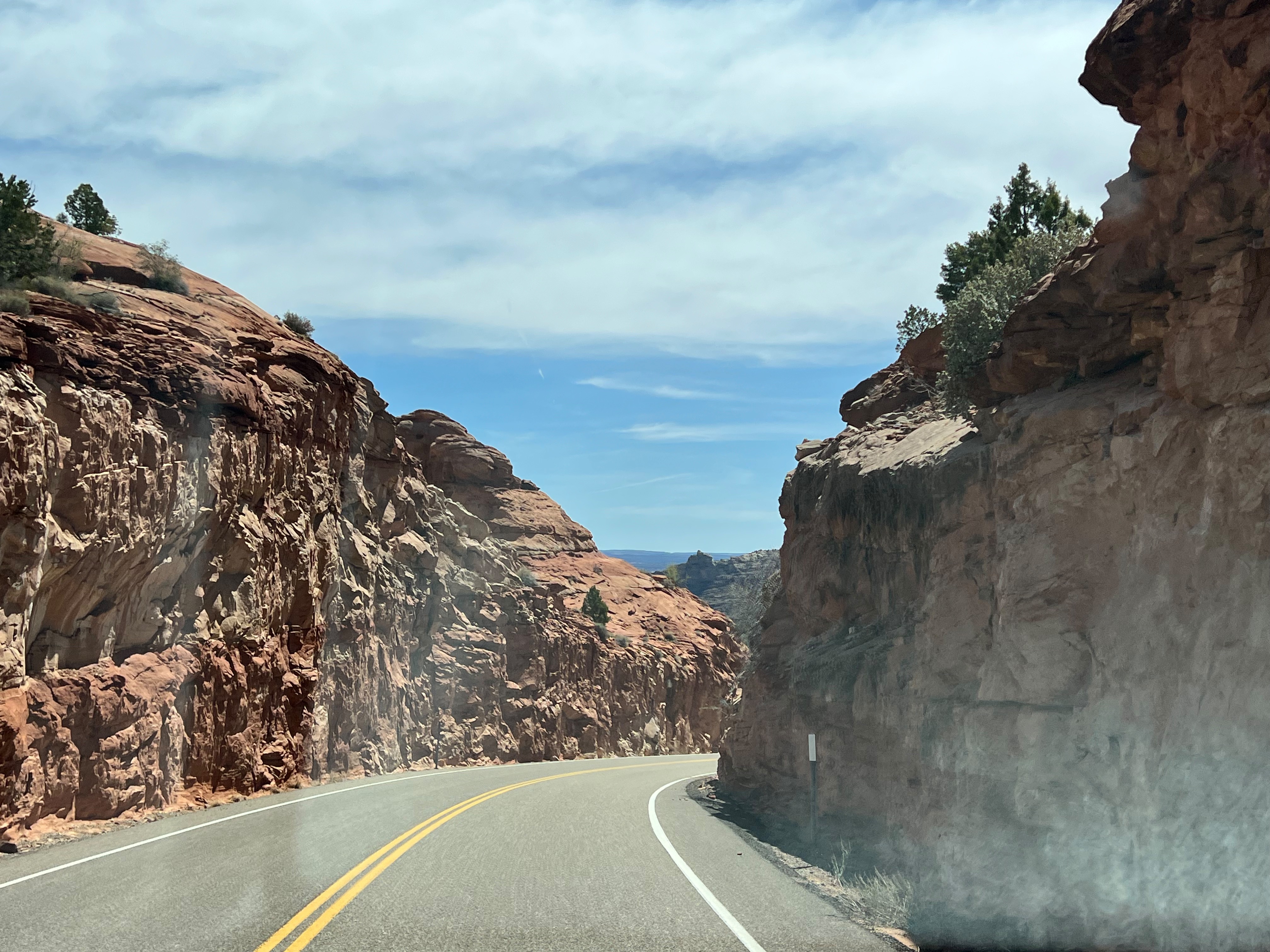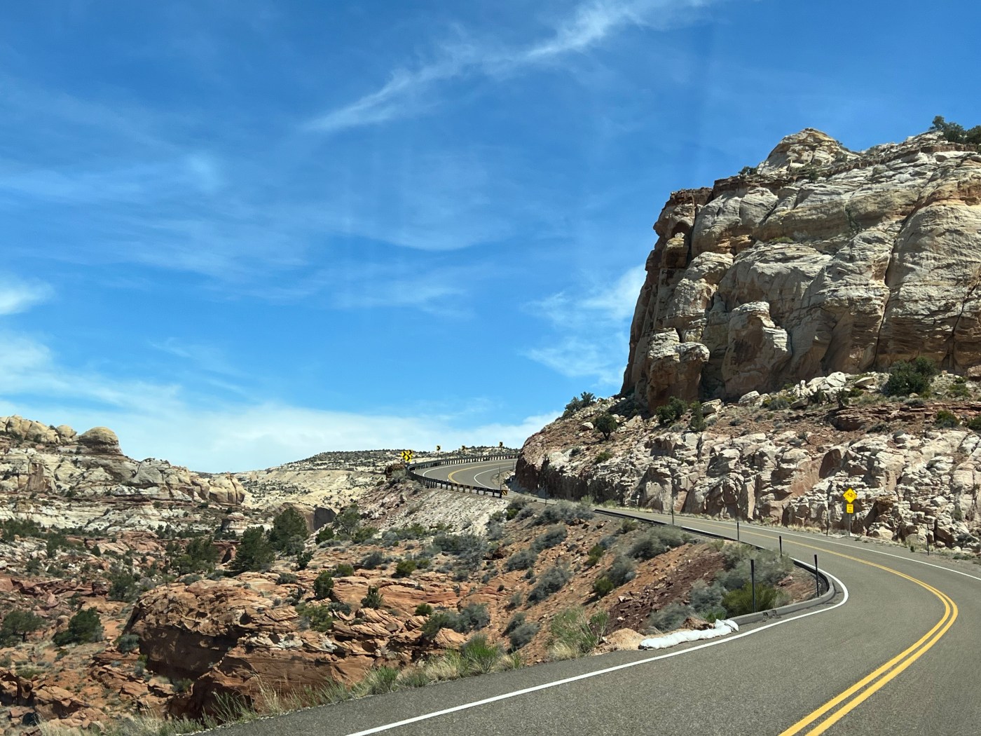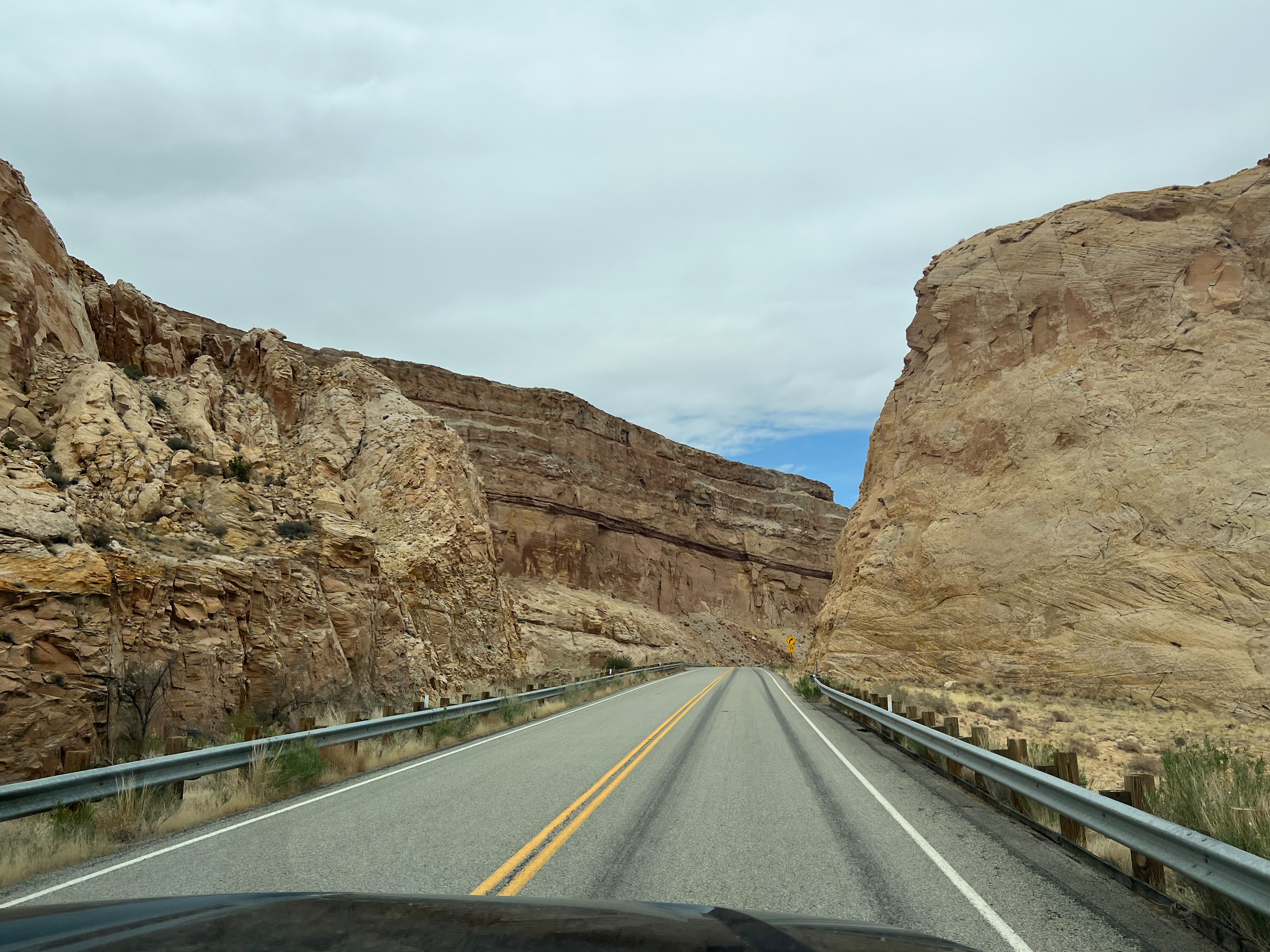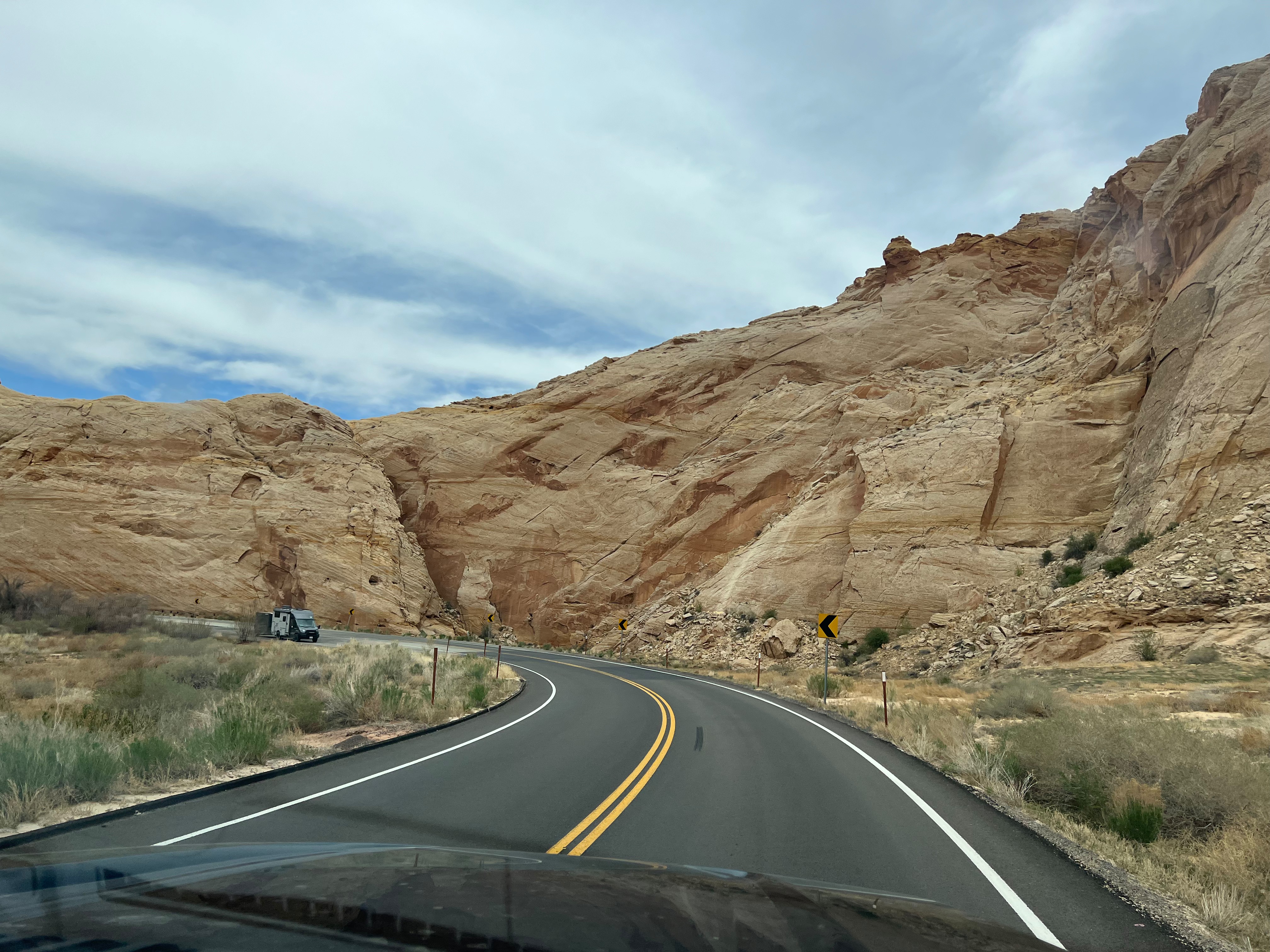 Our next stop was Hanksville, UT. It was a midway point between Bryce Canyon & Arches/Moab — and, it was close to some fun nearby hikes as well. We set out on Highway 12, a route recommended to us by many people for its beauty. It was also the route our RV-safe GPS told us to go. We turned on our moving day theme song (“On the Road Again”), but we quickly lost all cell reception as the narrow country highway curved through the mountains.