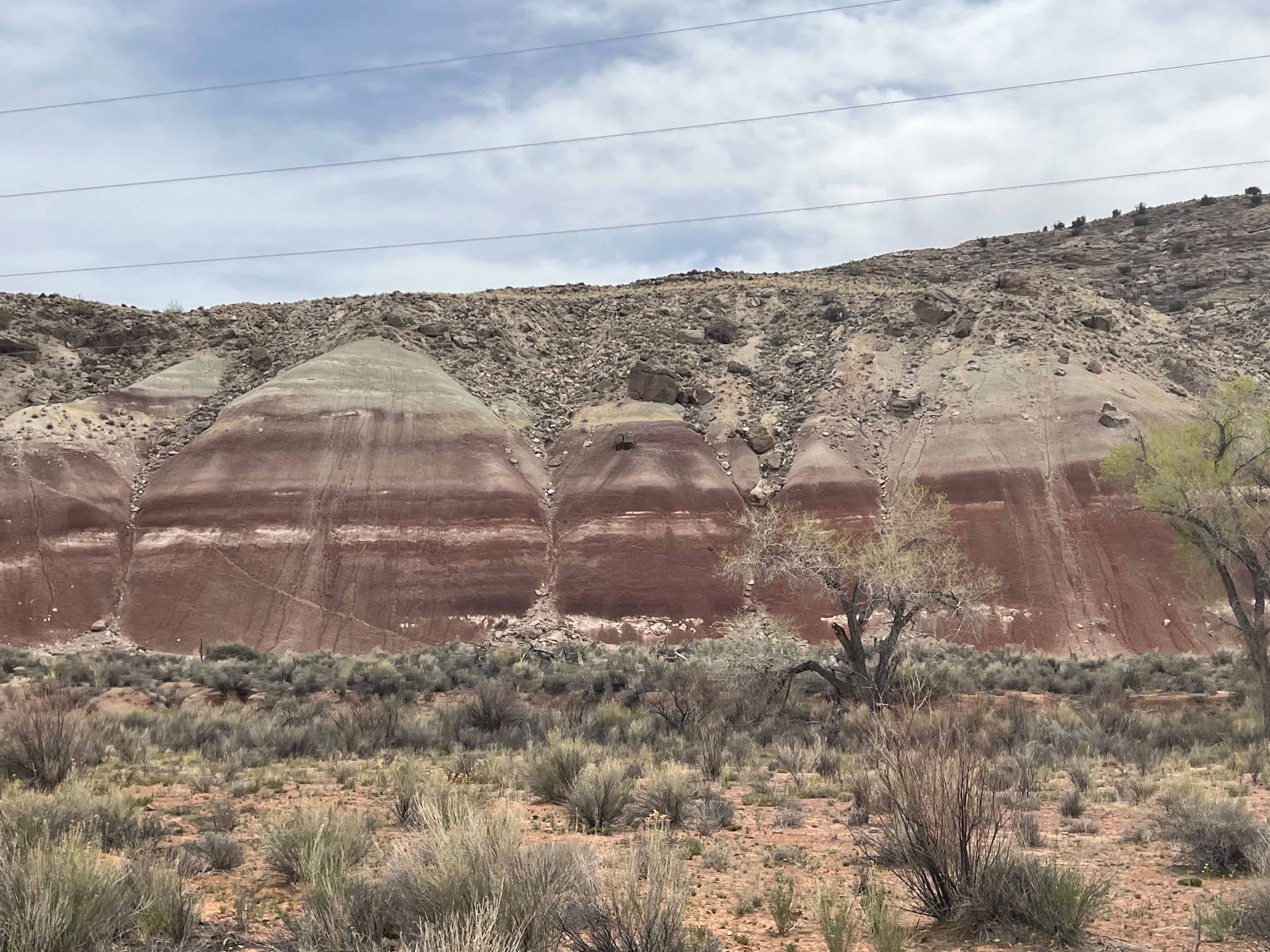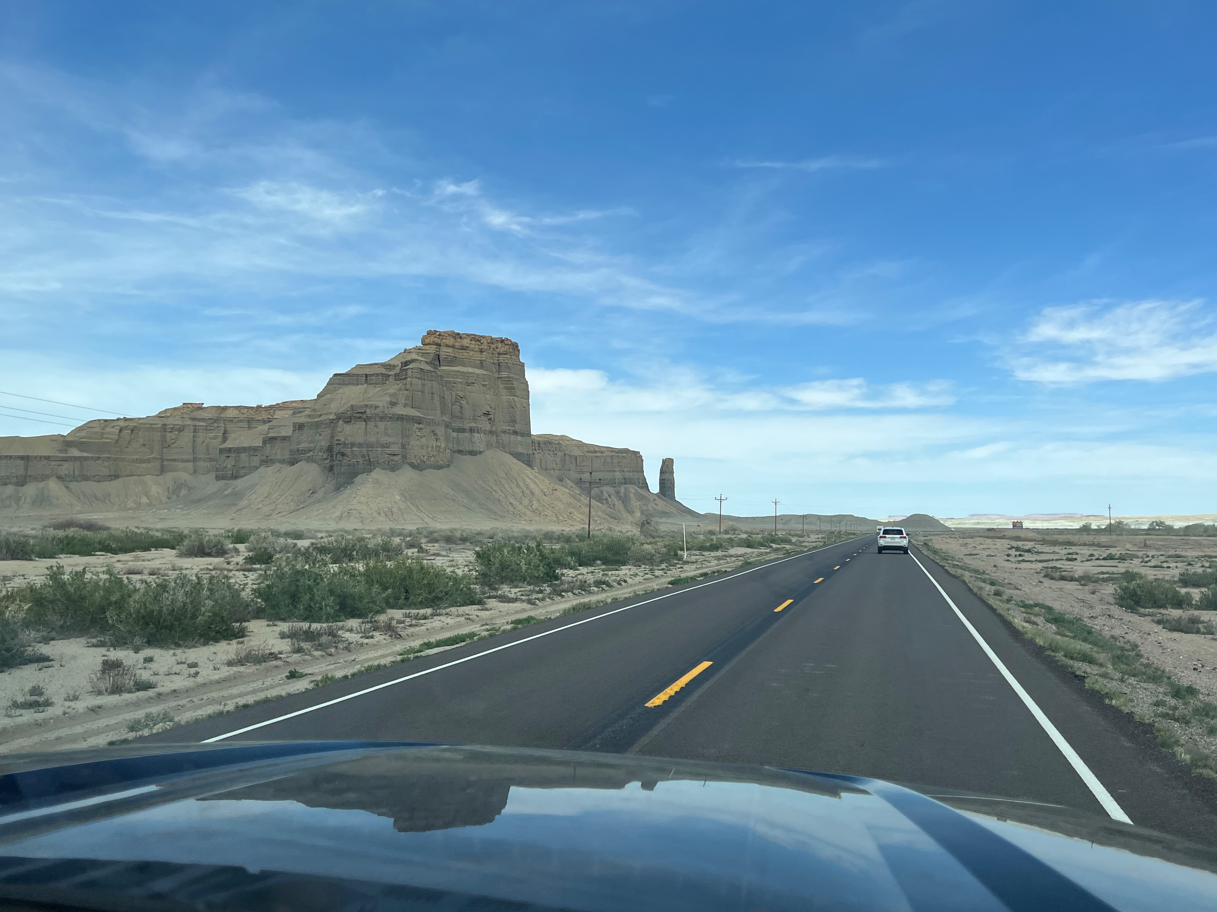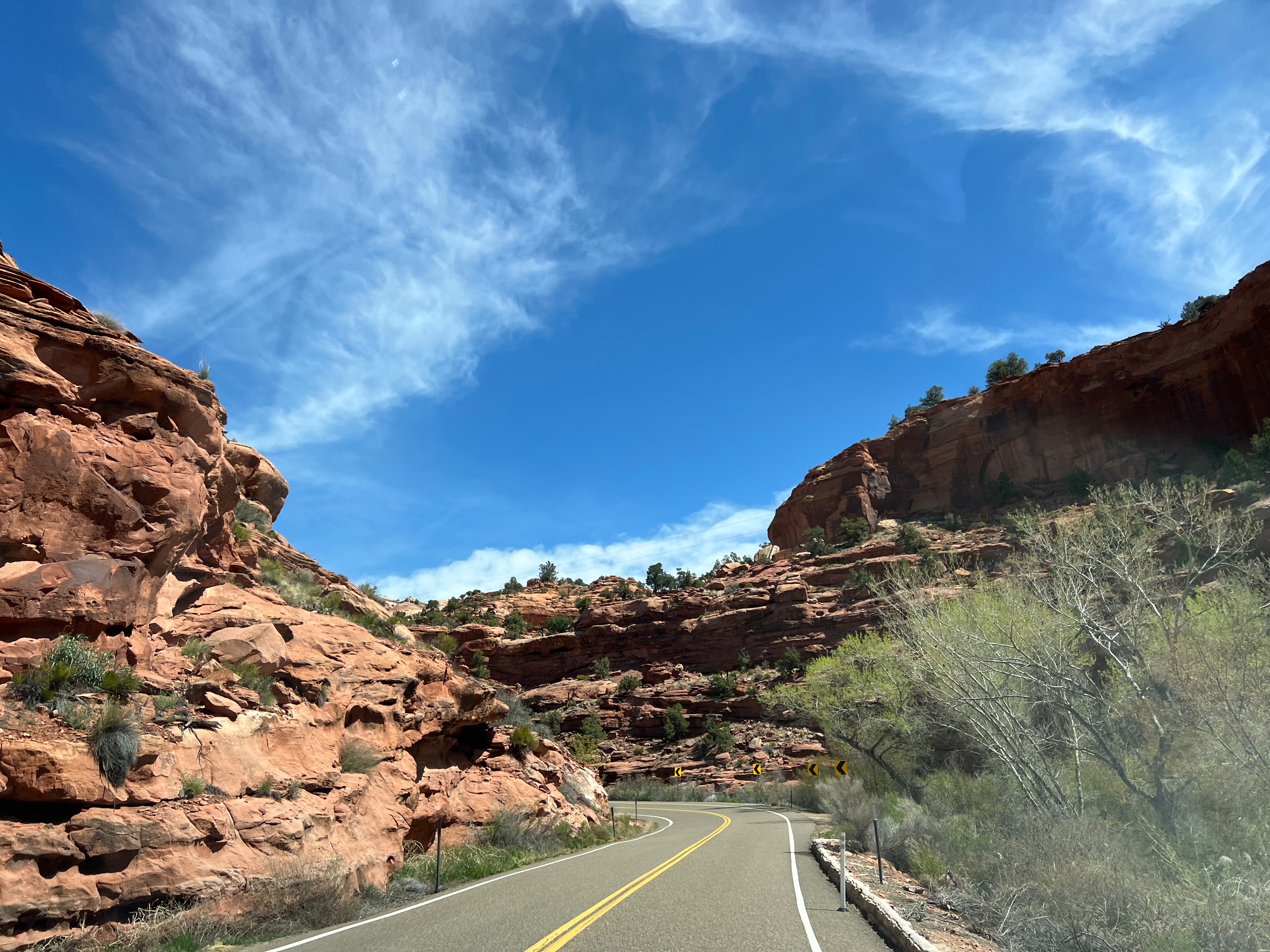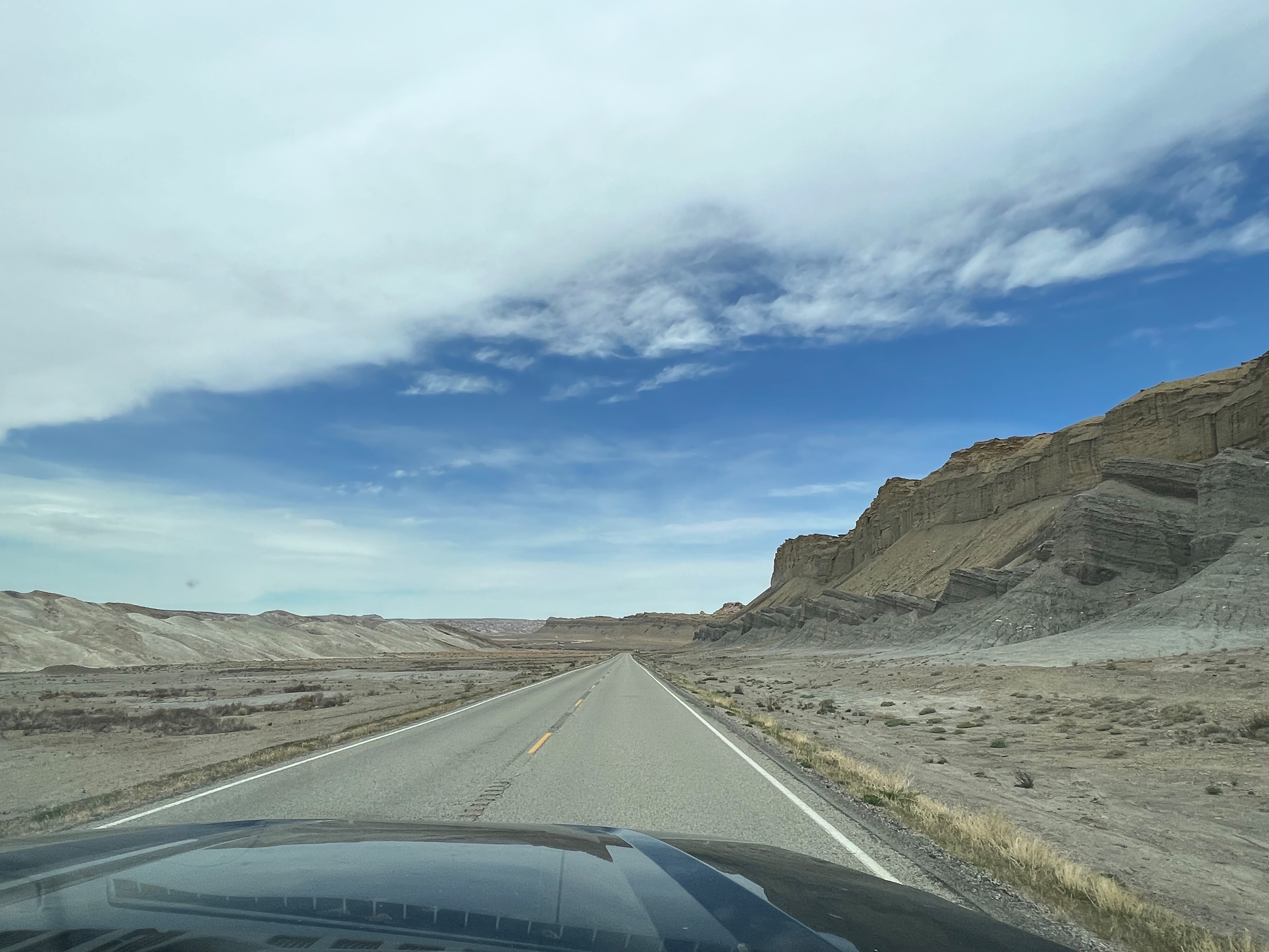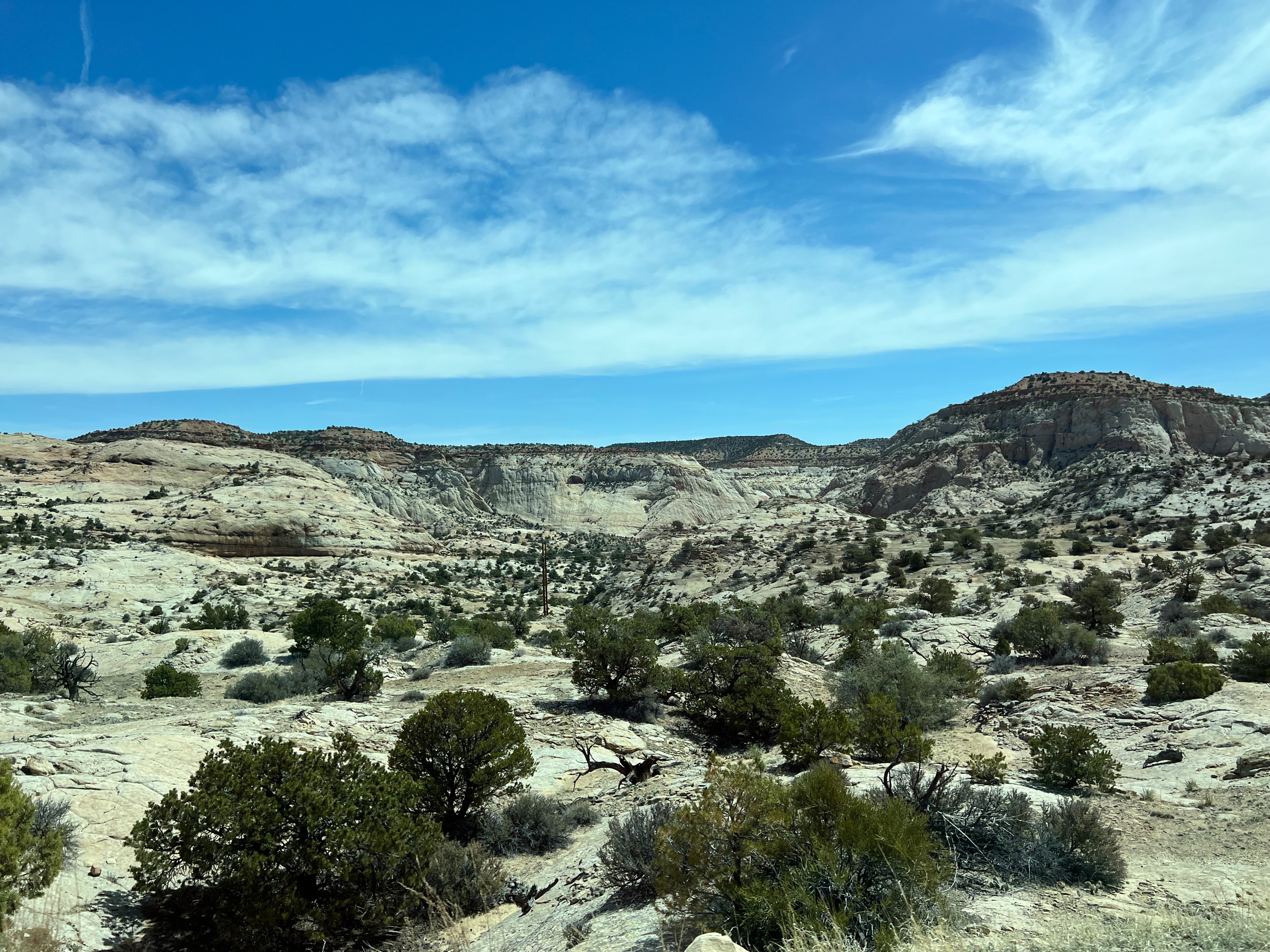 Our next stop was Hanksville, UT. It was a midway point between Bryce Canyon & Arches/Moab — and, it was close to some fun nearby hikes as well. We set out on Highway 12, a route recommended to us by many people for its beauty. It was also the route our RV-safe GPS told us to go. We turned on our moving day theme song (“On the Road Again”), but we quickly lost all cell reception as the narrow country highway curved through the mountains.