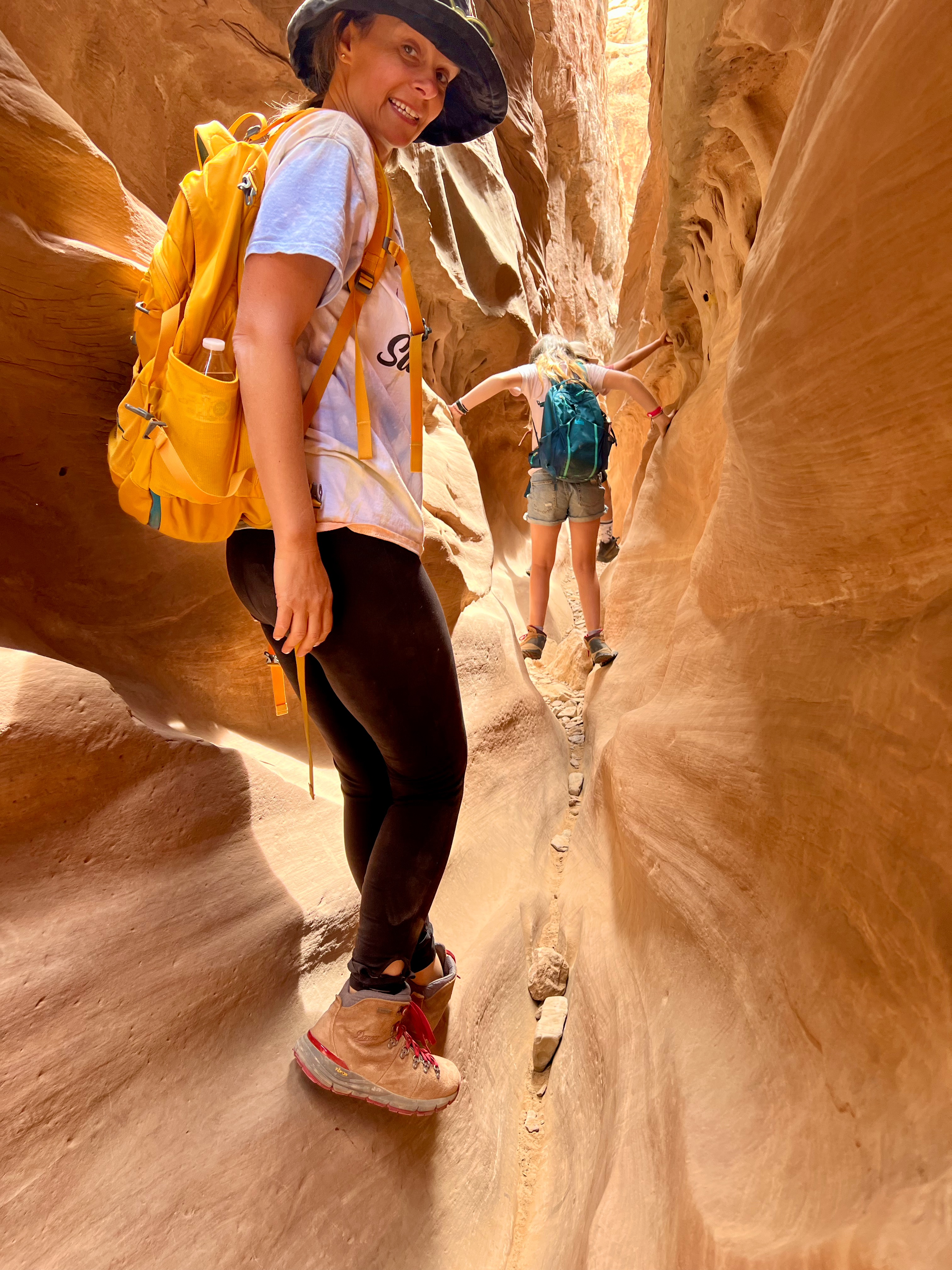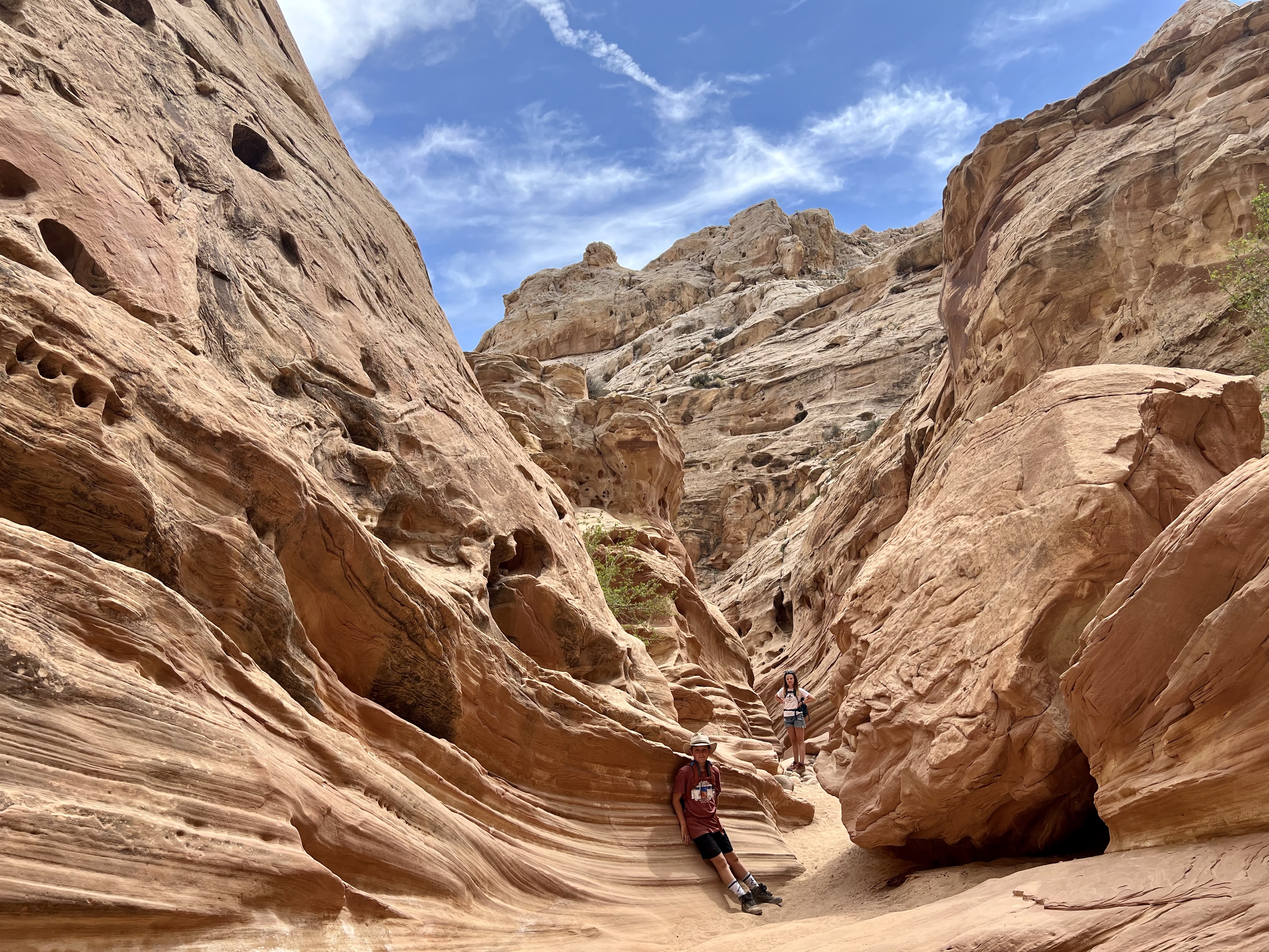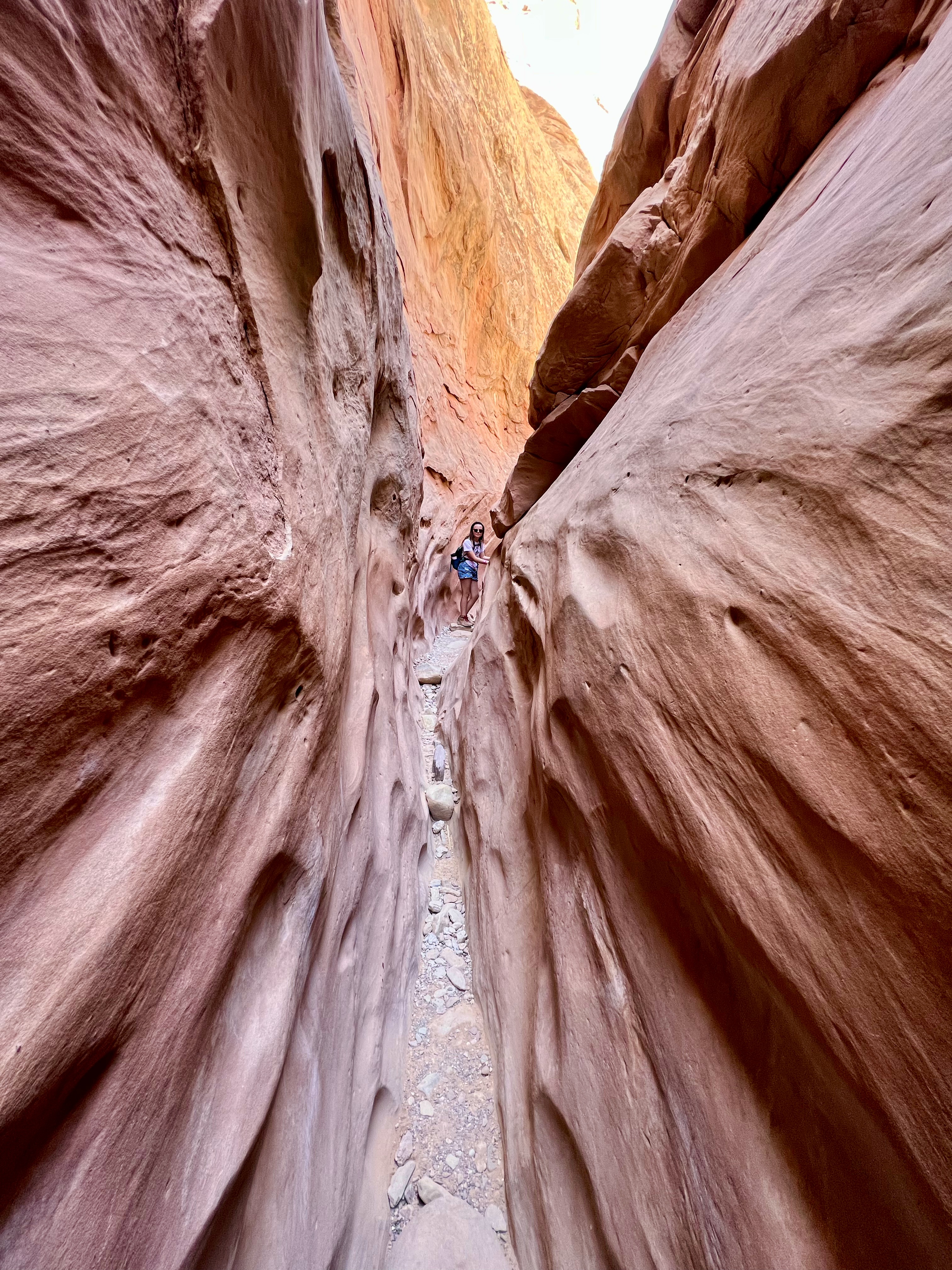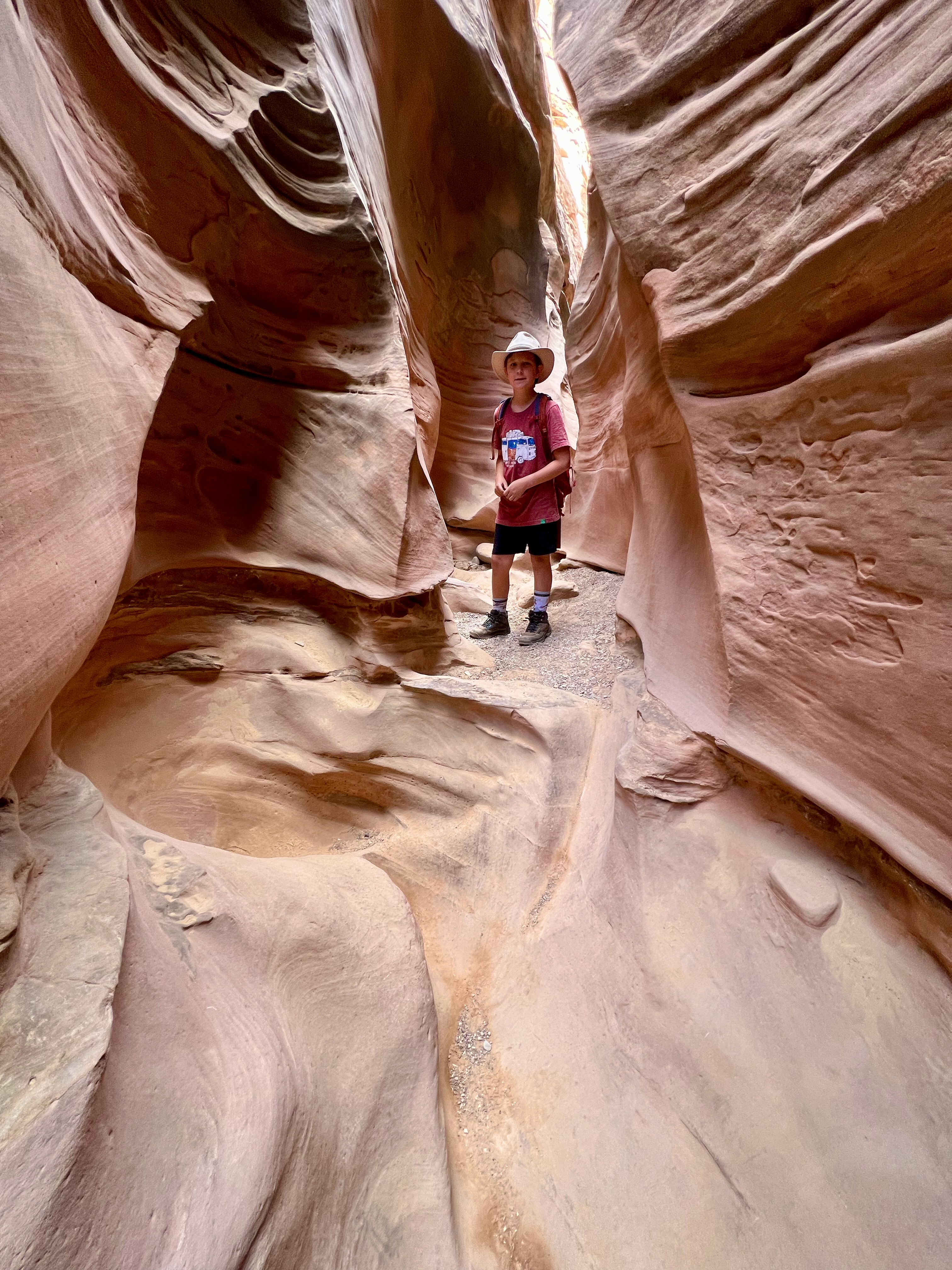 This area of Utah has felt isolated. There’s generally no cell service. We rarely pass any other cars. The drive to Little Wild Horse Canyon was 6 miles even further into isolation. We parked & walked along the wide, dry riverbed & eventually made it to what we’d gone there for – slot canyons. Many of the spots are just wide enough to walk through – some spots were too narrow for even your foot. We had to scramble over boulders, “walk” sideways like crabs to navigate the walls, and really problem-solve how to get through. The kids said this is their favorite kind of hike. It truly was fun, & the slot canyons were so crisp and cool. Coming out of them, we were hit with a wall of 86-degree desert heat.