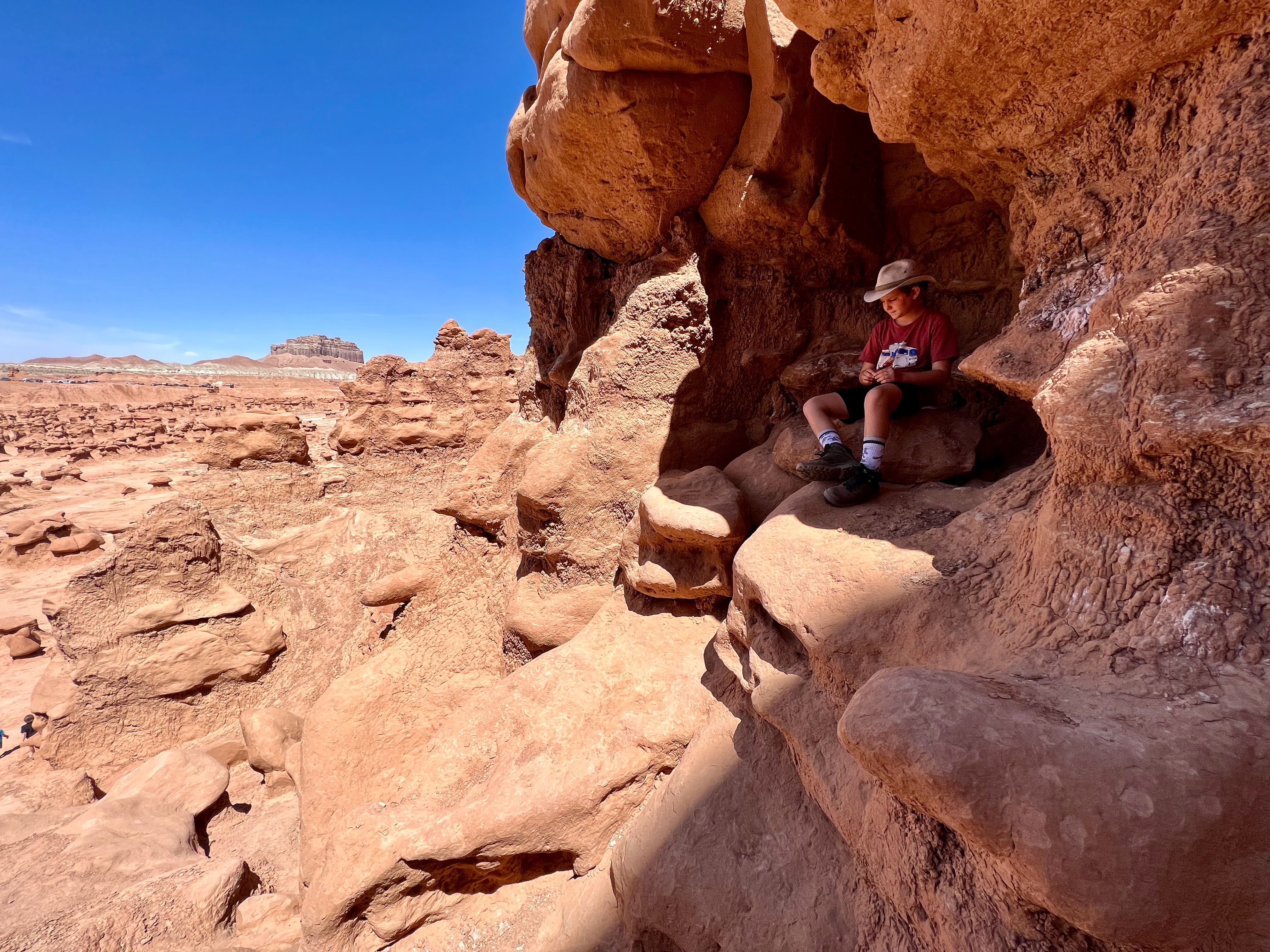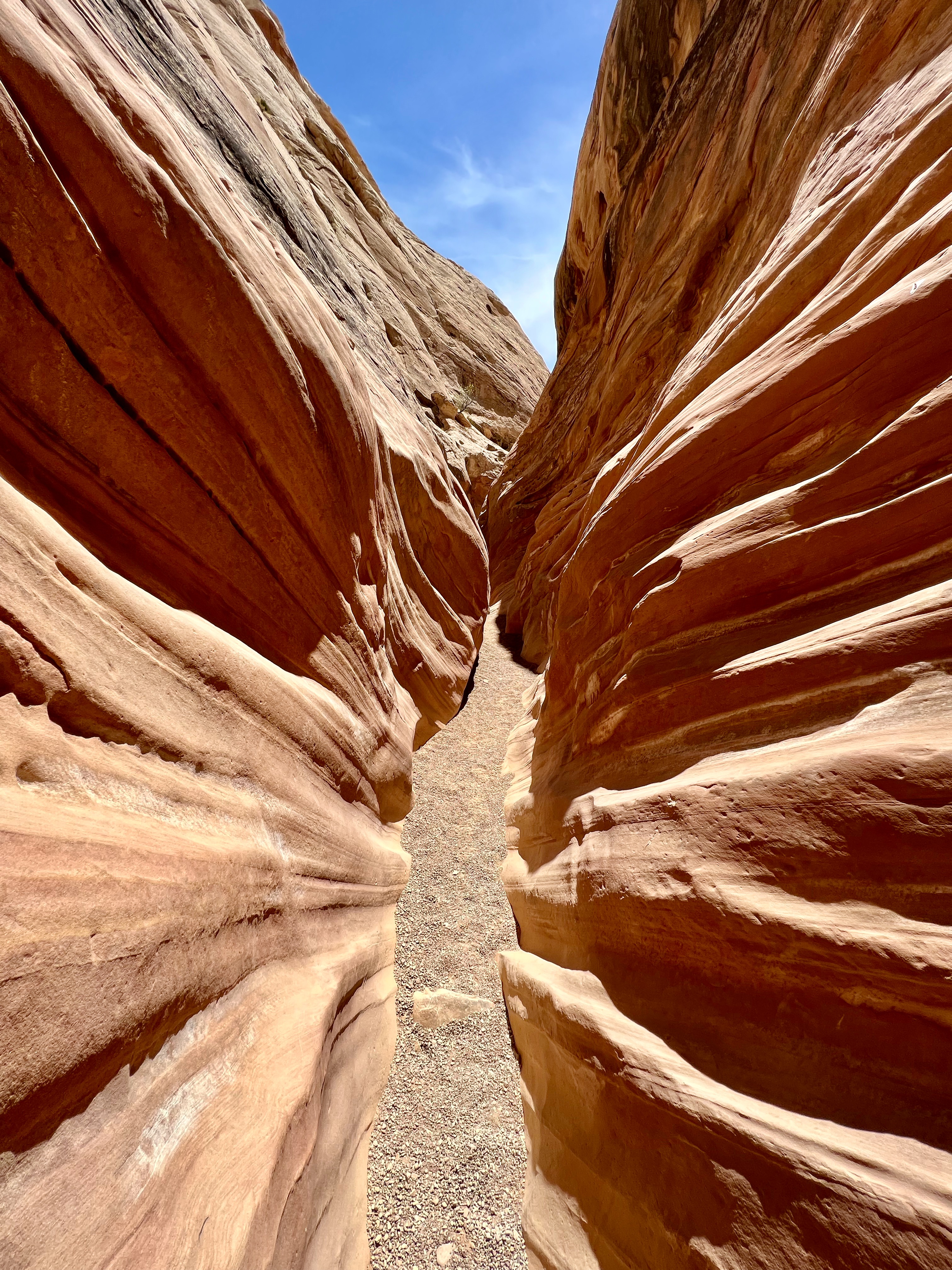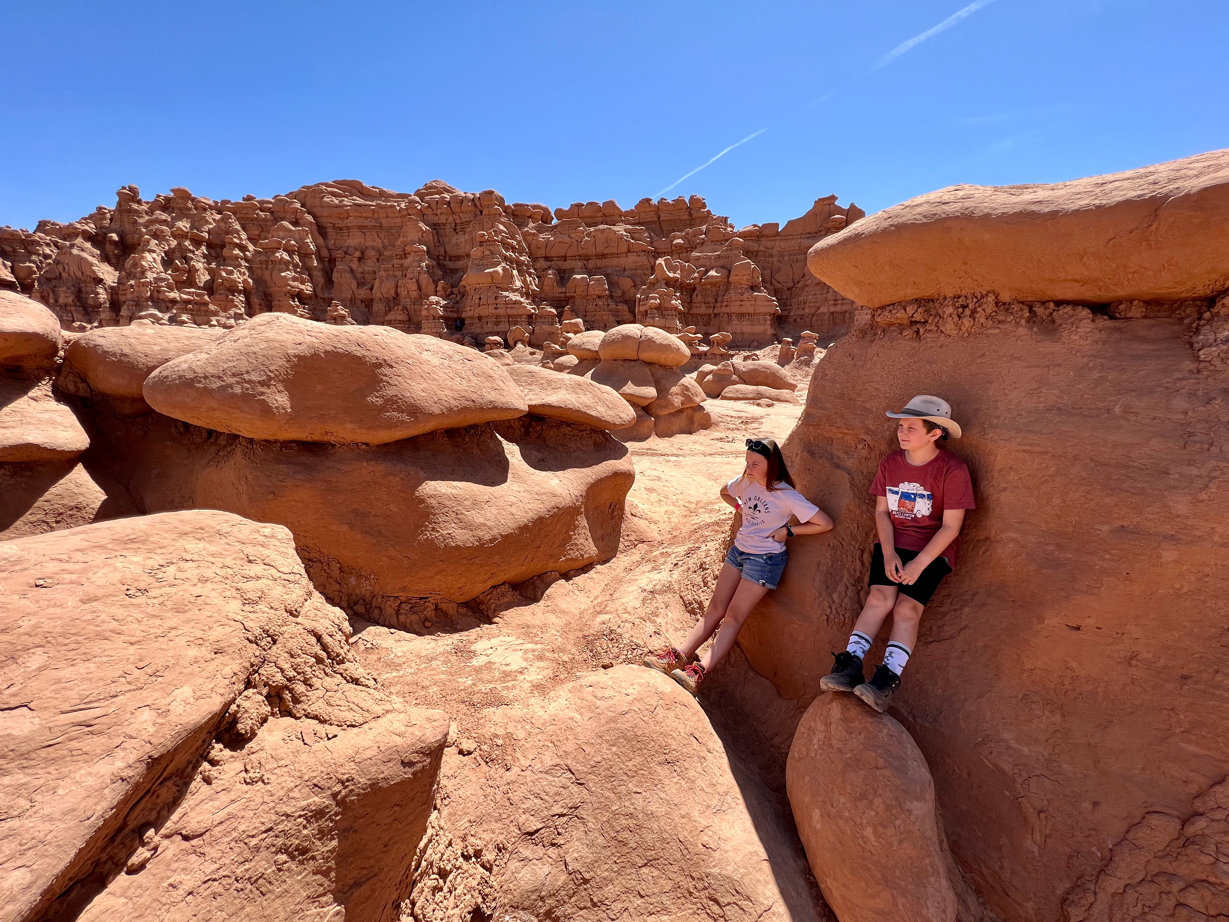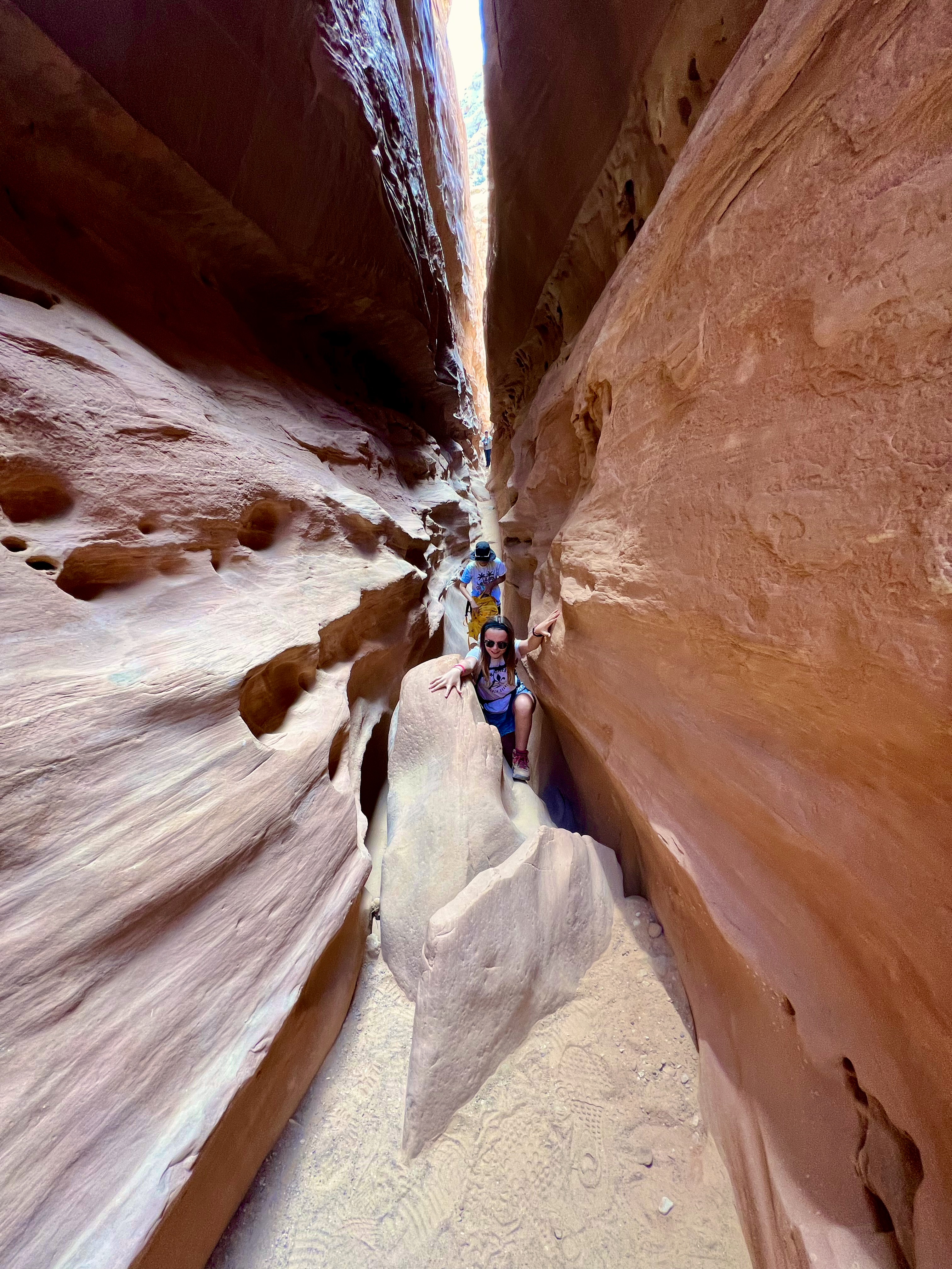 This area of Utah has felt isolated. There’s generally no cell service. We rarely pass any other cars. The drive to Little Wild Horse Canyon was 6 miles even further into isolation. We parked & walked along the wide, dry riverbed & eventually made it to what we’d gone there for – slot canyons. Many of the spots are just wide enough to walk through – some spots were too narrow for even your foot. We had to scramble over boulders, “walk” sideways like crabs to navigate the walls, and really problem-solve how to get through. The kids said this is their favorite kind of hike. It truly was fun, & the slot canyons were so crisp and cool. Coming out of them, we were hit with a wall of 86-degree desert heat.
