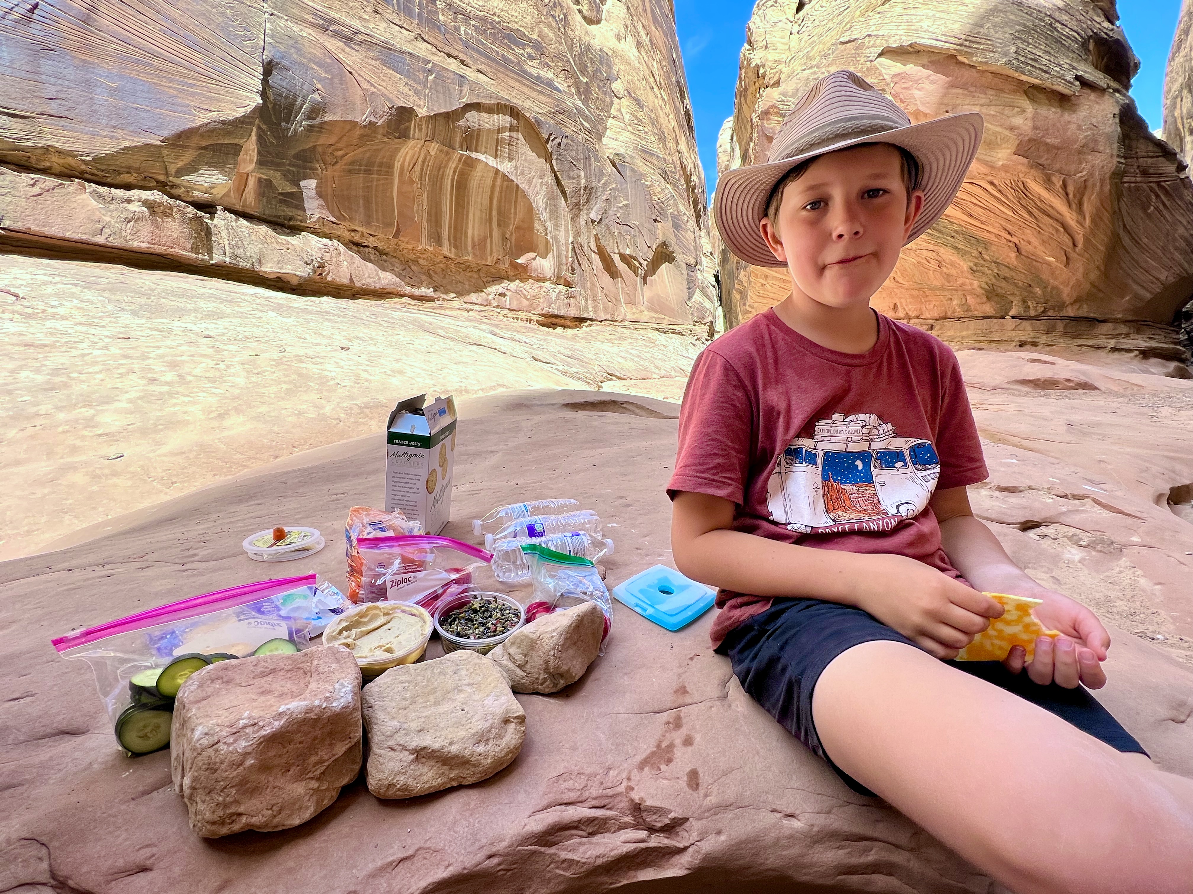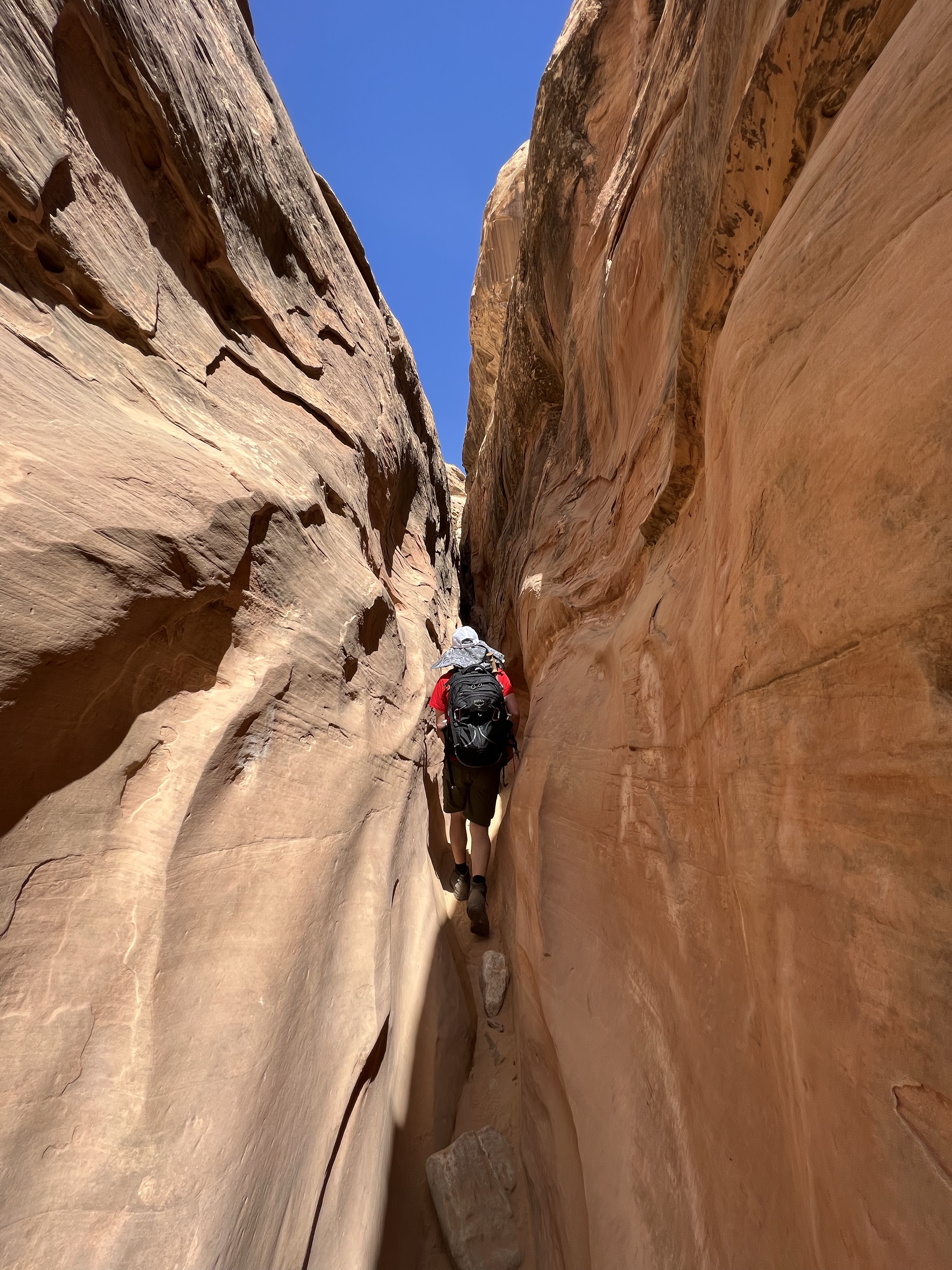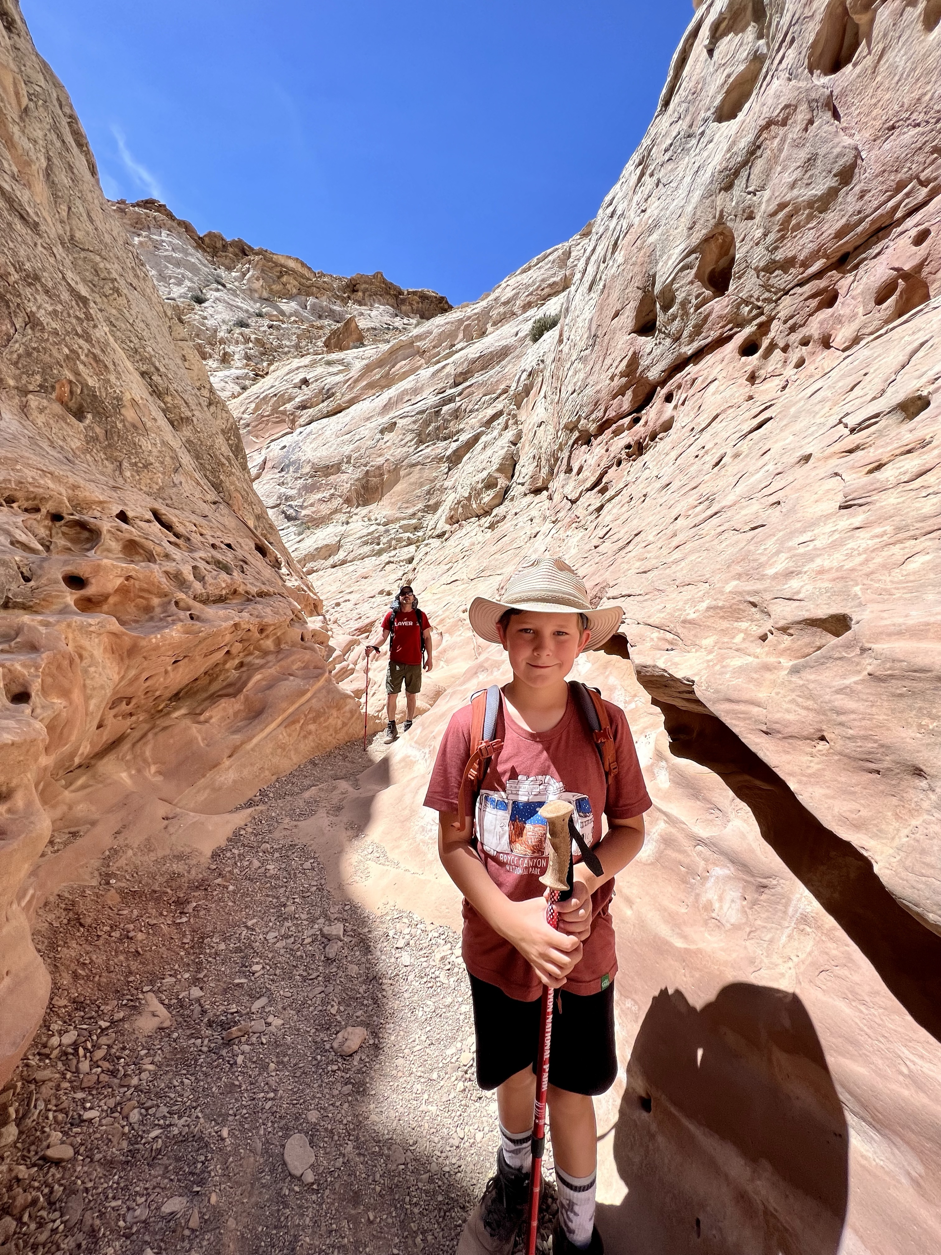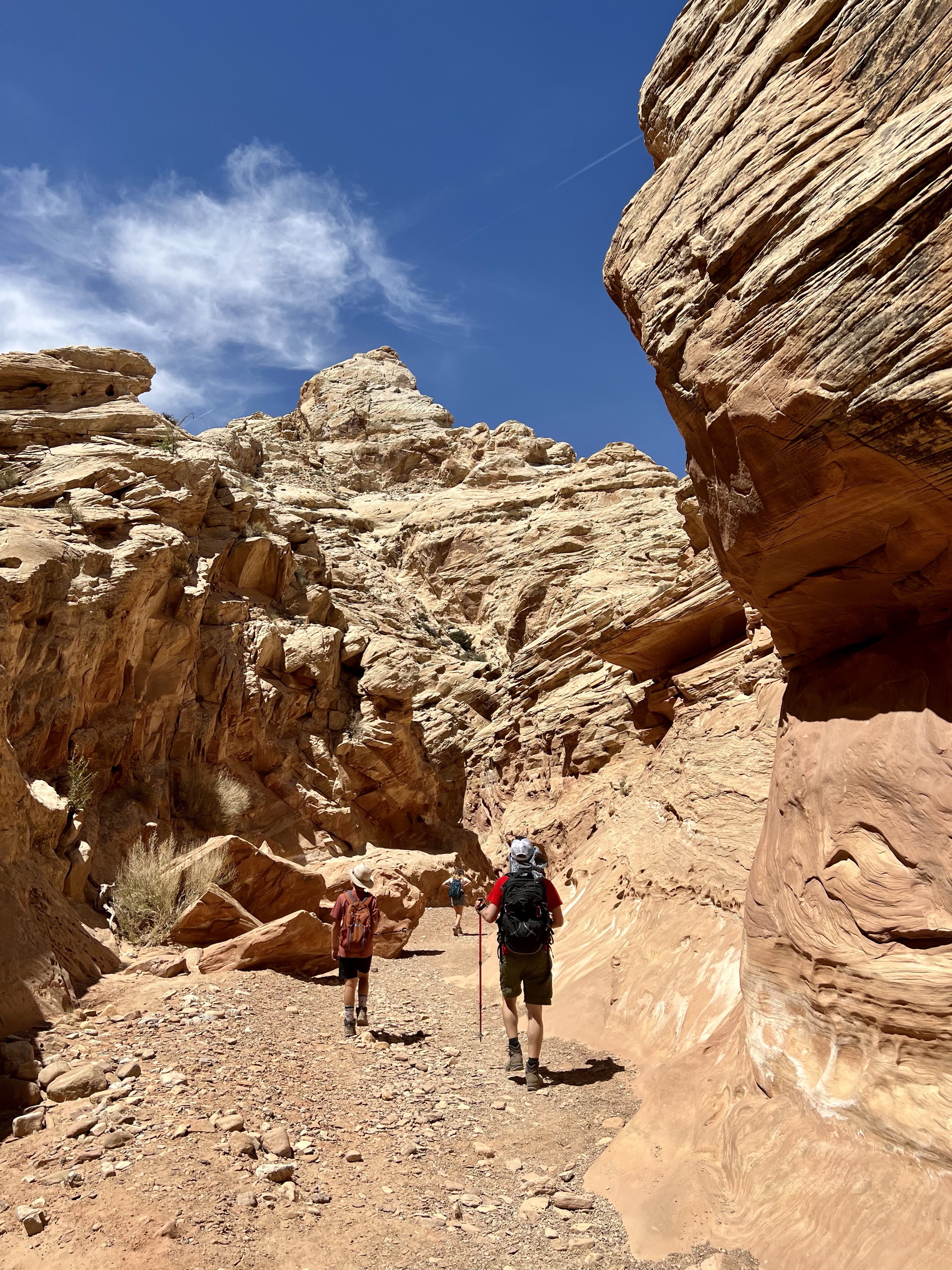 This area of Utah has felt isolated. There’s generally no cell service. We rarely pass any other cars. The drive to Little Wild Horse Canyon was 6 miles even further into isolation. We parked & walked along the wide, dry riverbed & eventually made it to what we’d gone there for – slot canyons. Many of the spots are just wide enough to walk through – some spots were too narrow for even your foot. We had to scramble over boulders, “walk” sideways like crabs to navigate the walls, and really problem-solve how to get through. The kids said this is their favorite kind of hike. It truly was fun, & the slot canyons were so crisp and cool. Coming out of them, we were hit with a wall of 86-degree desert heat.