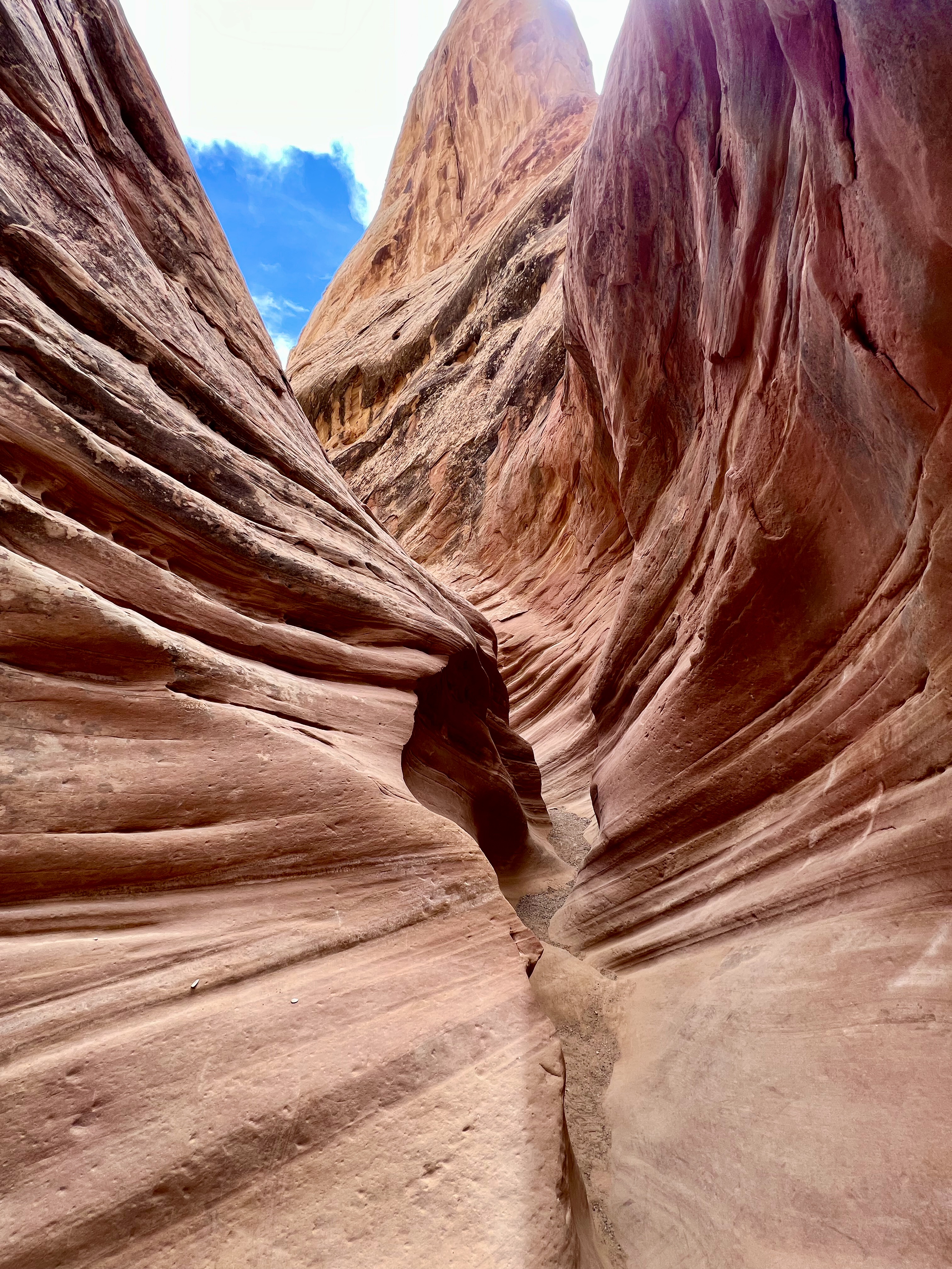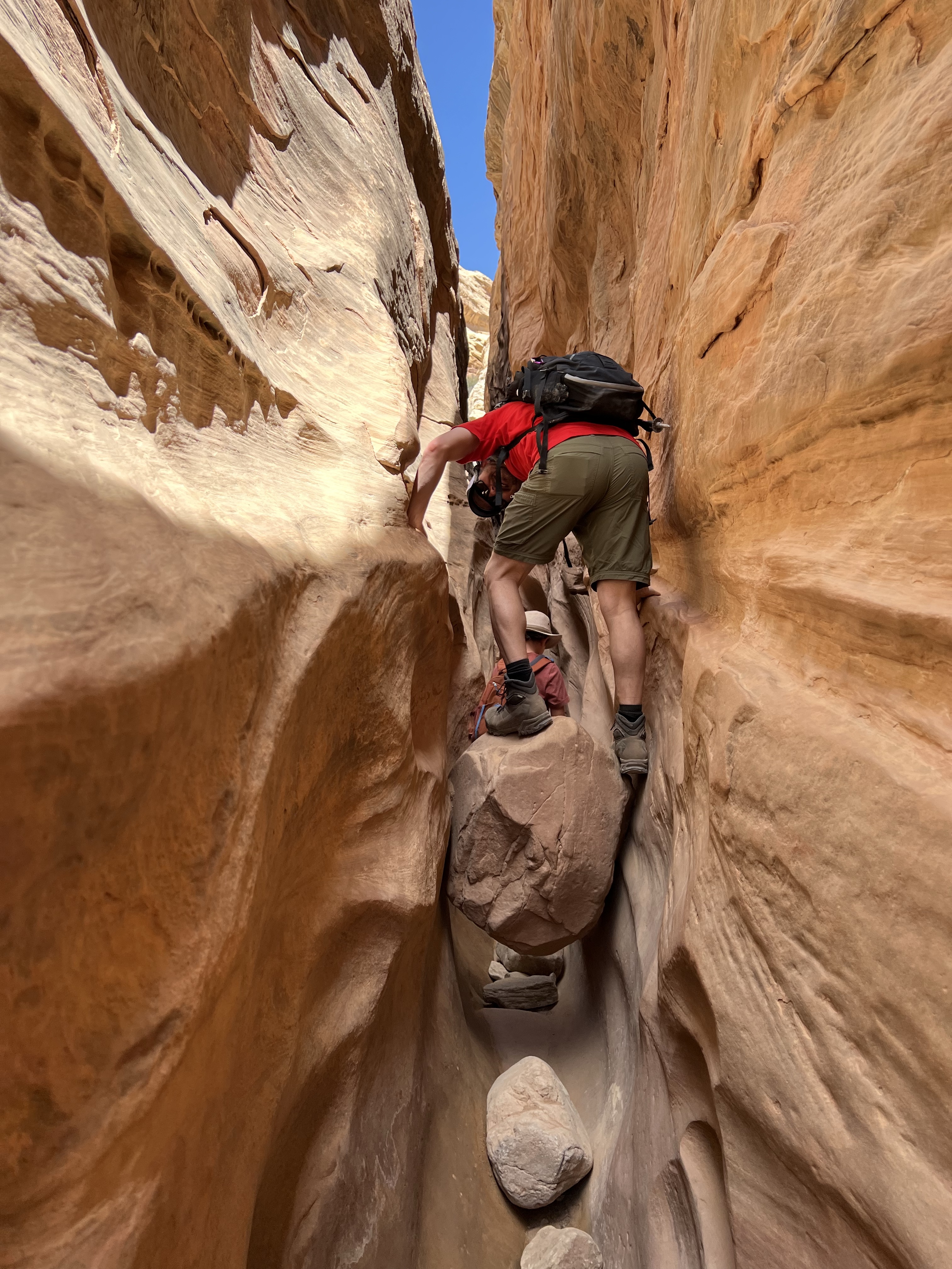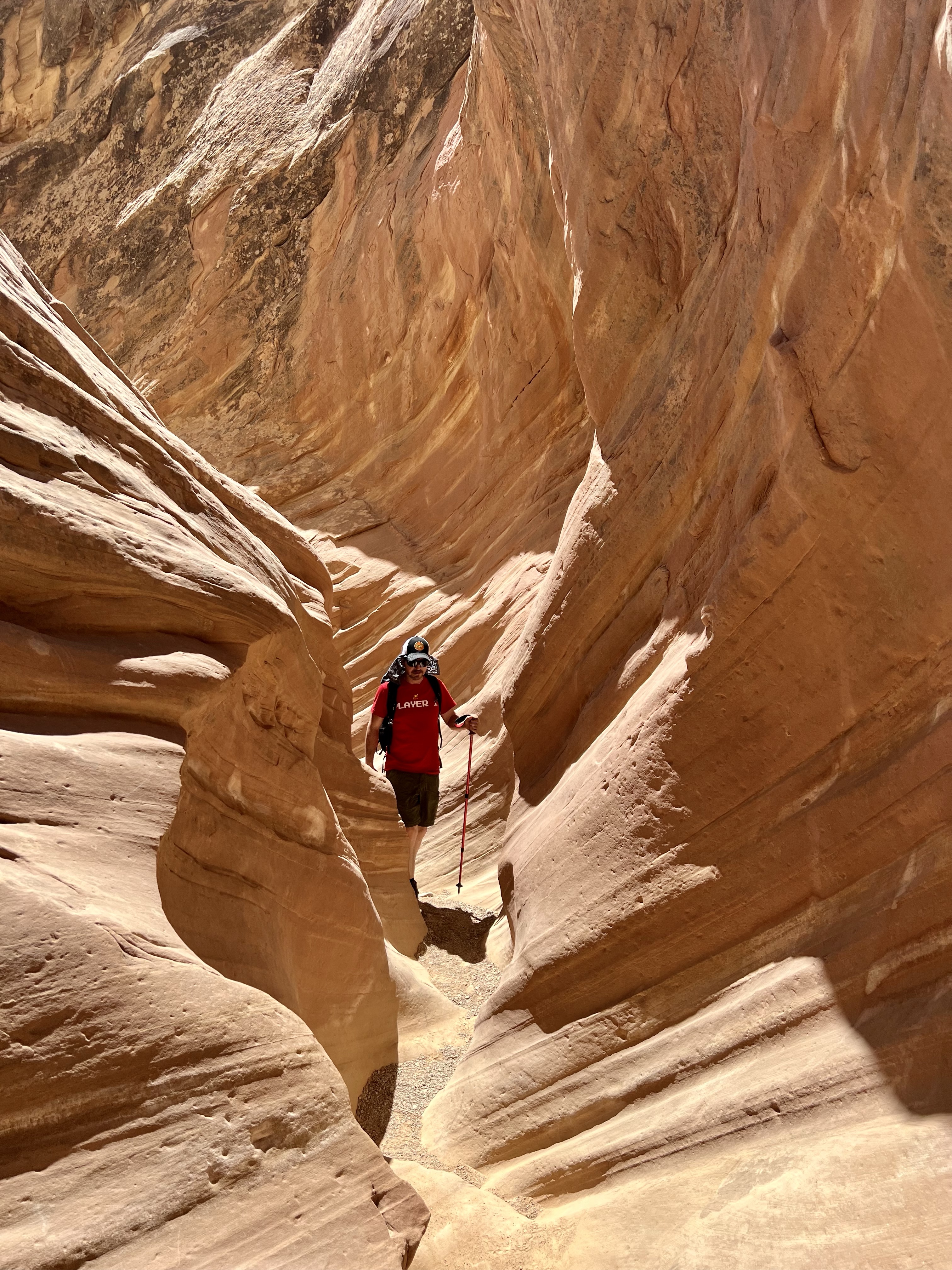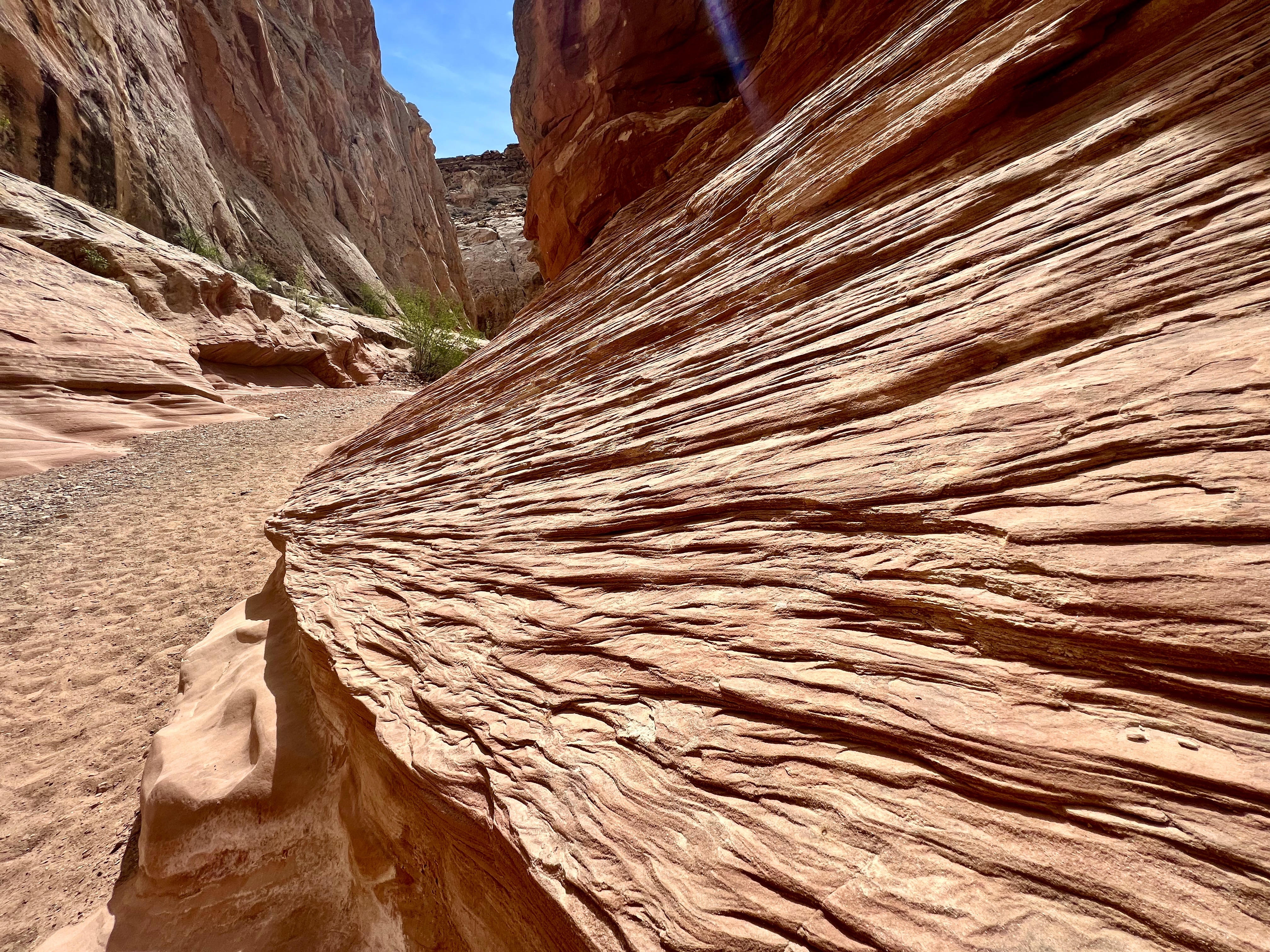 This area of Utah has felt isolated. There’s generally no cell service. We rarely pass any other cars. The drive to Little Wild Horse Canyon was 6 miles even further into isolation. We parked & walked along the wide, dry riverbed & eventually made it to what we’d gone there for – slot canyons. Many of the spots are just wide enough to walk through – some spots were too narrow for even your foot. We had to scramble over boulders, “walk” sideways like crabs to navigate the walls, and really problem-solve how to get through. The kids said this is their favorite kind of hike. It truly was fun, & the slot canyons were so crisp and cool. Coming out of them, we were hit with a wall of 86-degree desert heat.
