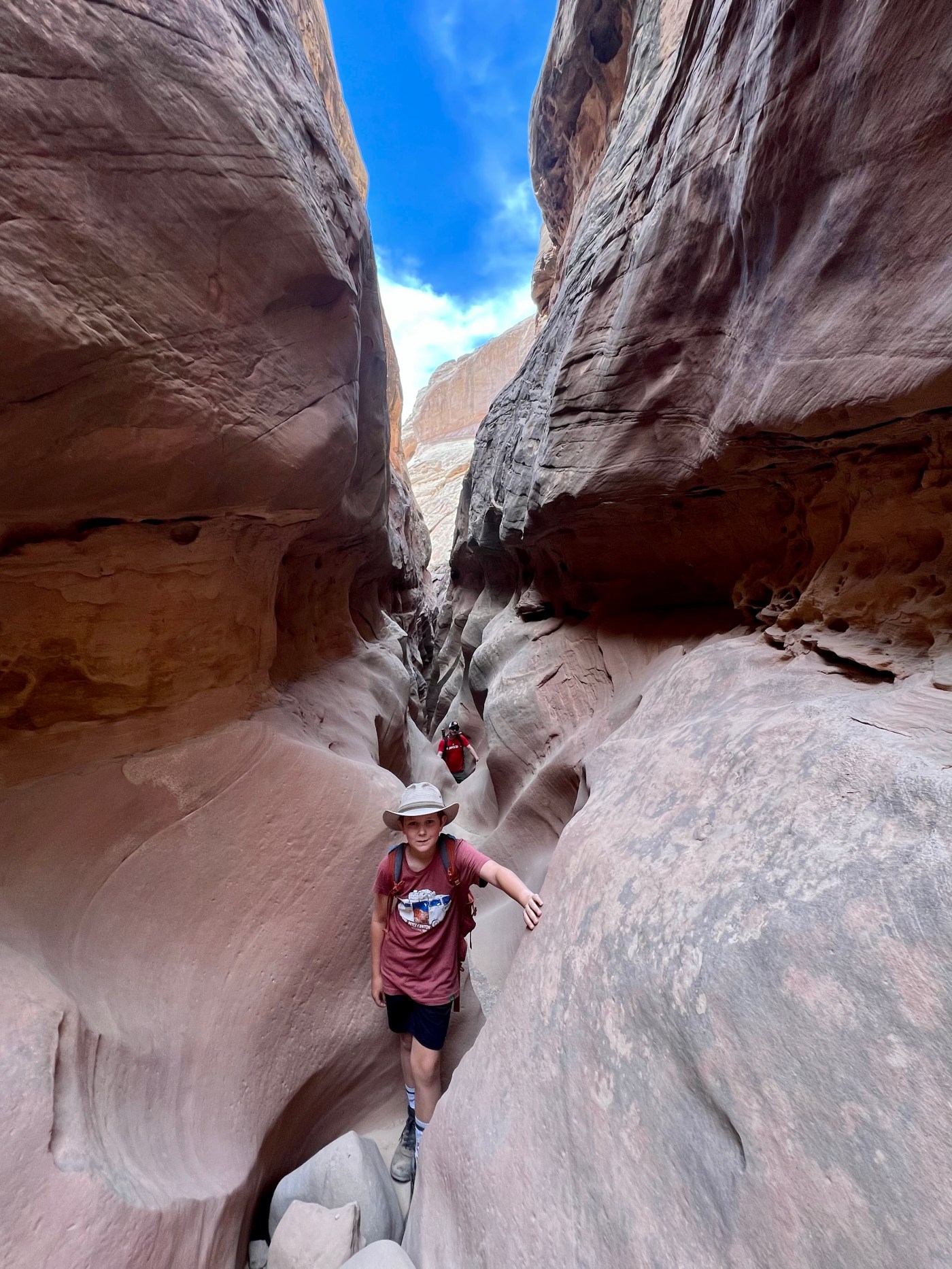 This area of Utah has felt isolated. There’s generally no cell service. We rarely pass any other cars. The drive to Little Wild Horse Canyon was 6 miles even further into isolation. We parked & walked along the wide, dry riverbed & eventually made it to what we’d gone there for – slot canyons. Many of the spots are just wide enough to walk through – some spots were too narrow for even your foot. We had to scramble over boulders, “walk” sideways like crabs to navigate the walls, and really problem-solve how to get through. The kids said this is their favorite kind of hike. It truly was fun, & the slot canyons were so crisp and cool. Coming out of them, we were hit with a wall of 86-degree desert heat.